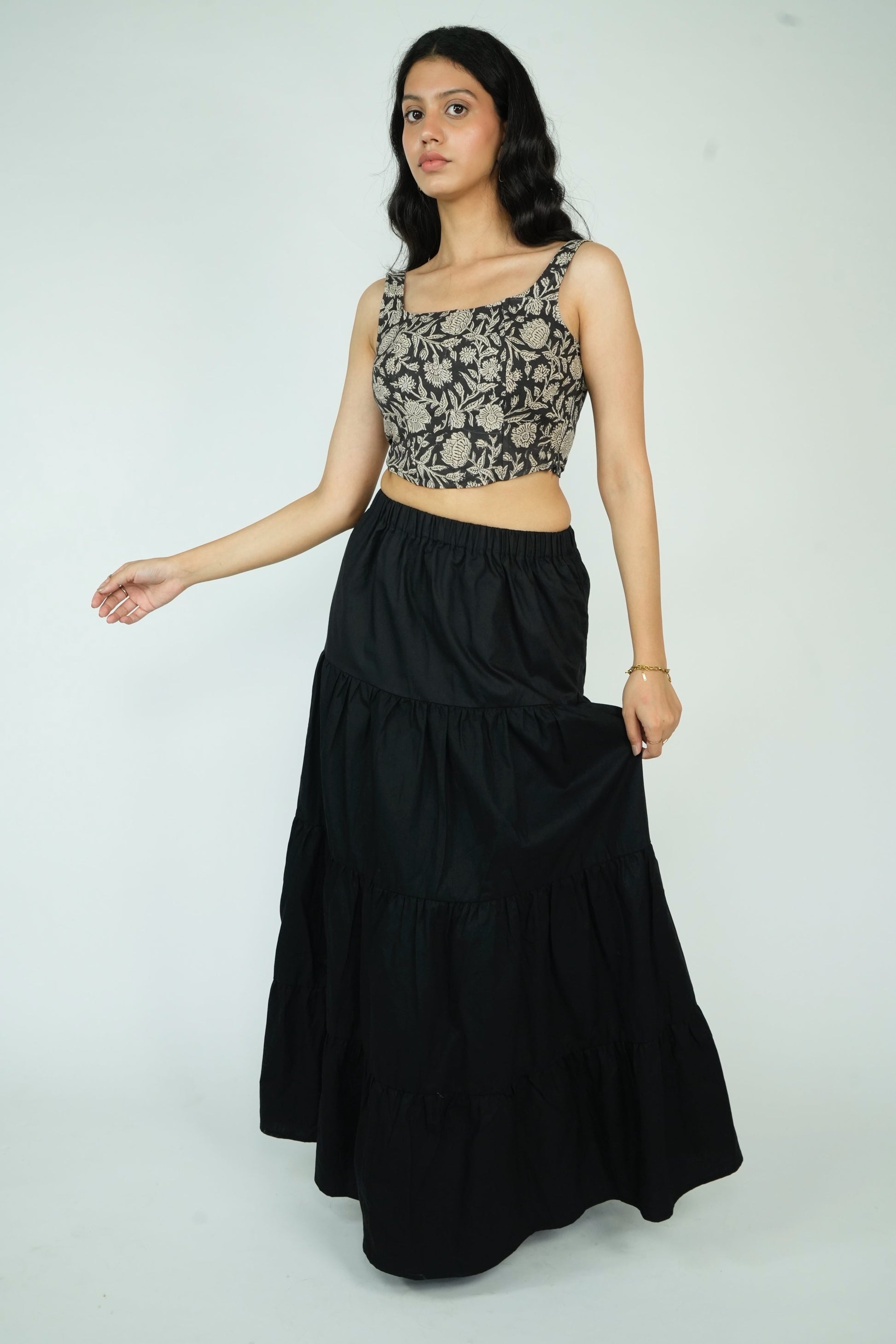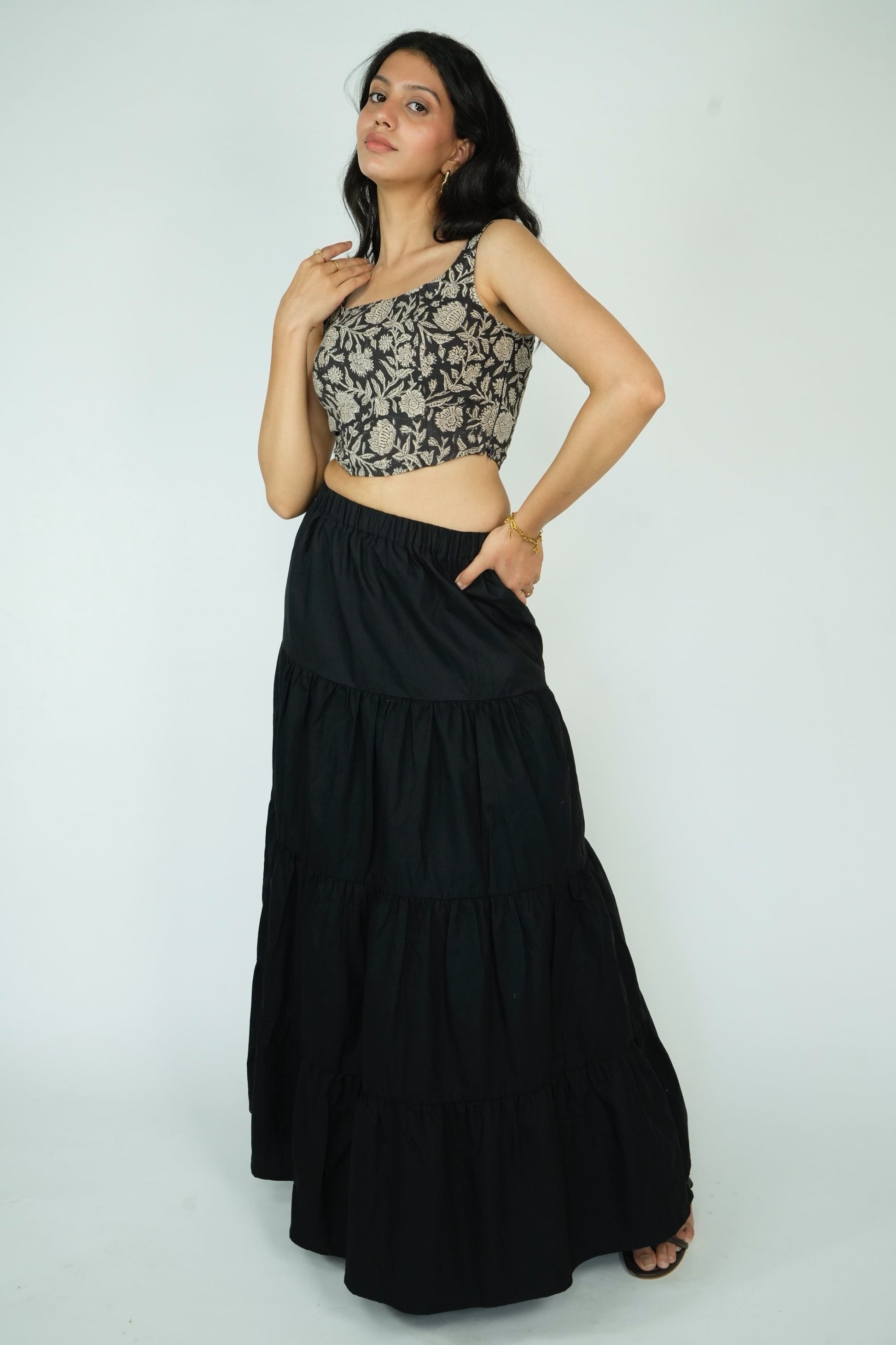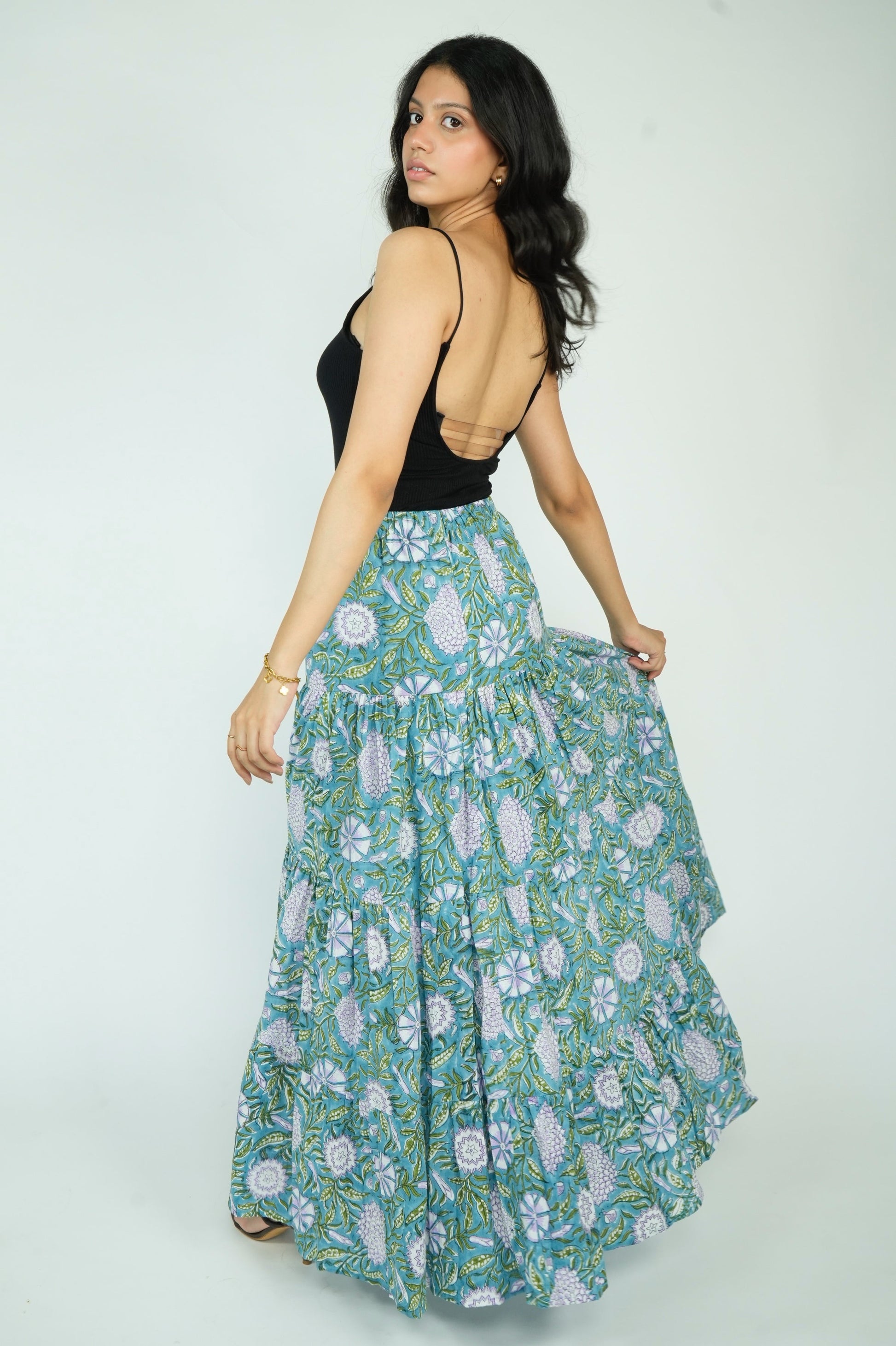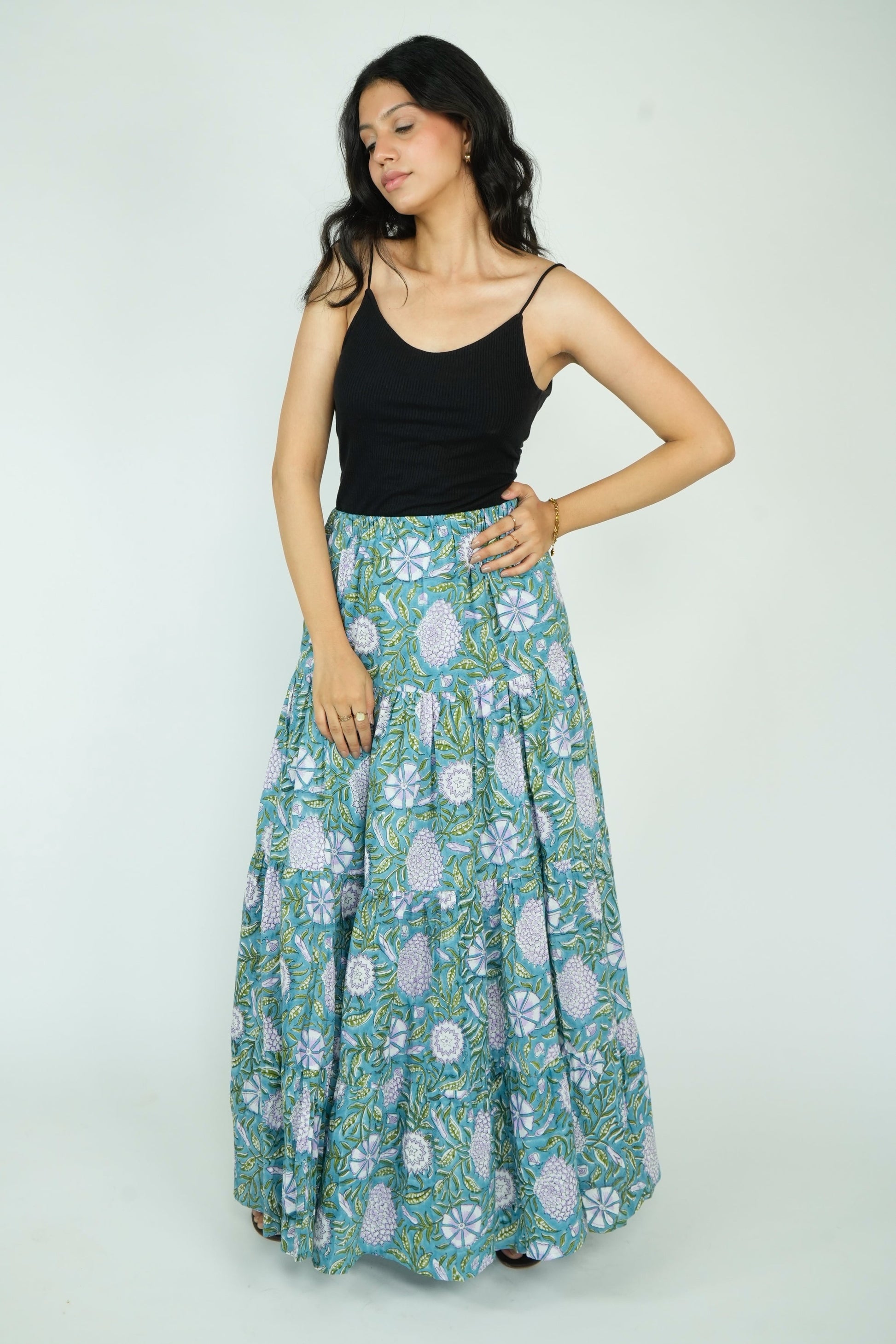 Elevate your style with our Layered Maxi Skirt. This flared skirt features an elasticated waistband with a drawstring closure for a perfect fit and a flared hem for a touch of elegance. Made from 100% premium cotton, it offers superior comfort and breathability. Available in four stunning prints, this skirt combines quality and style effortlessly.