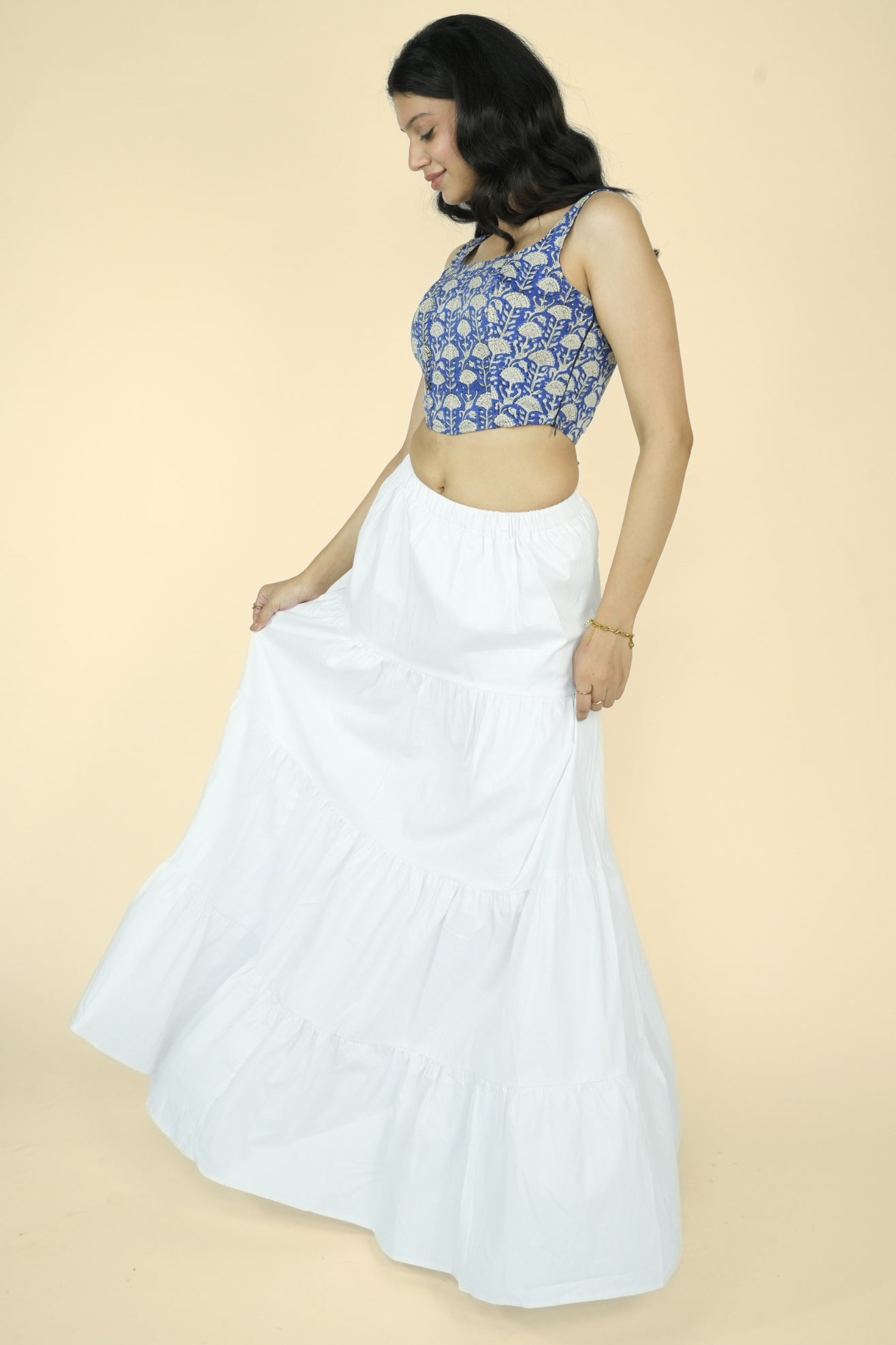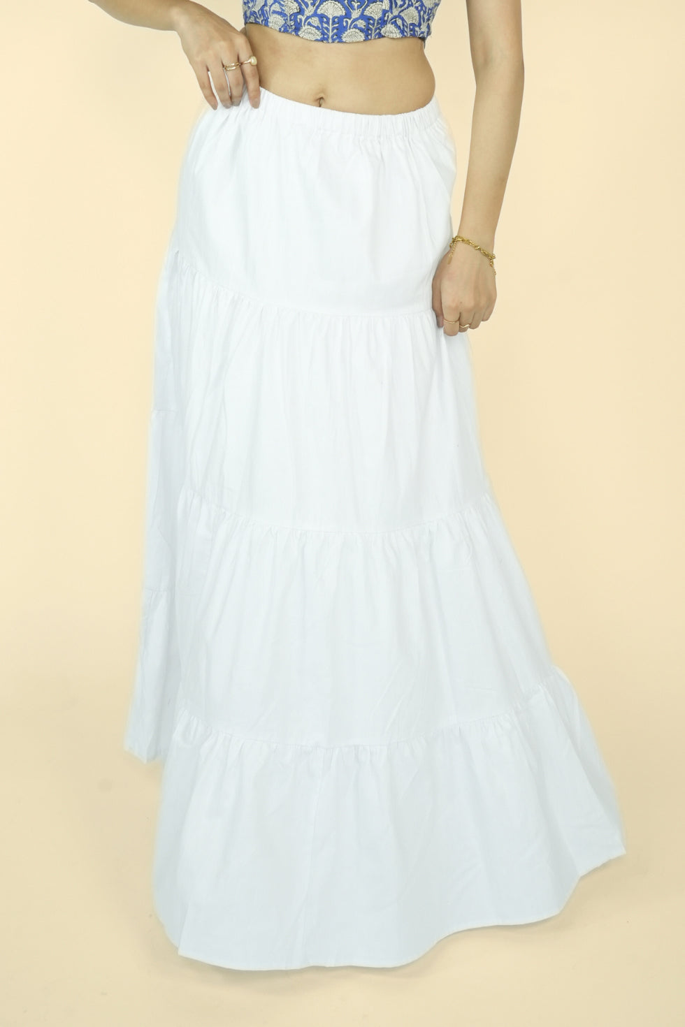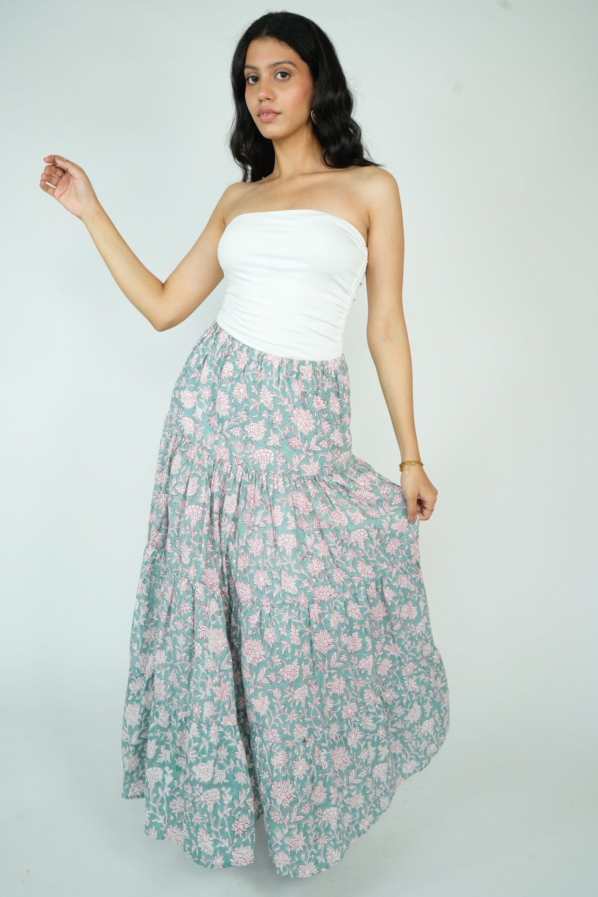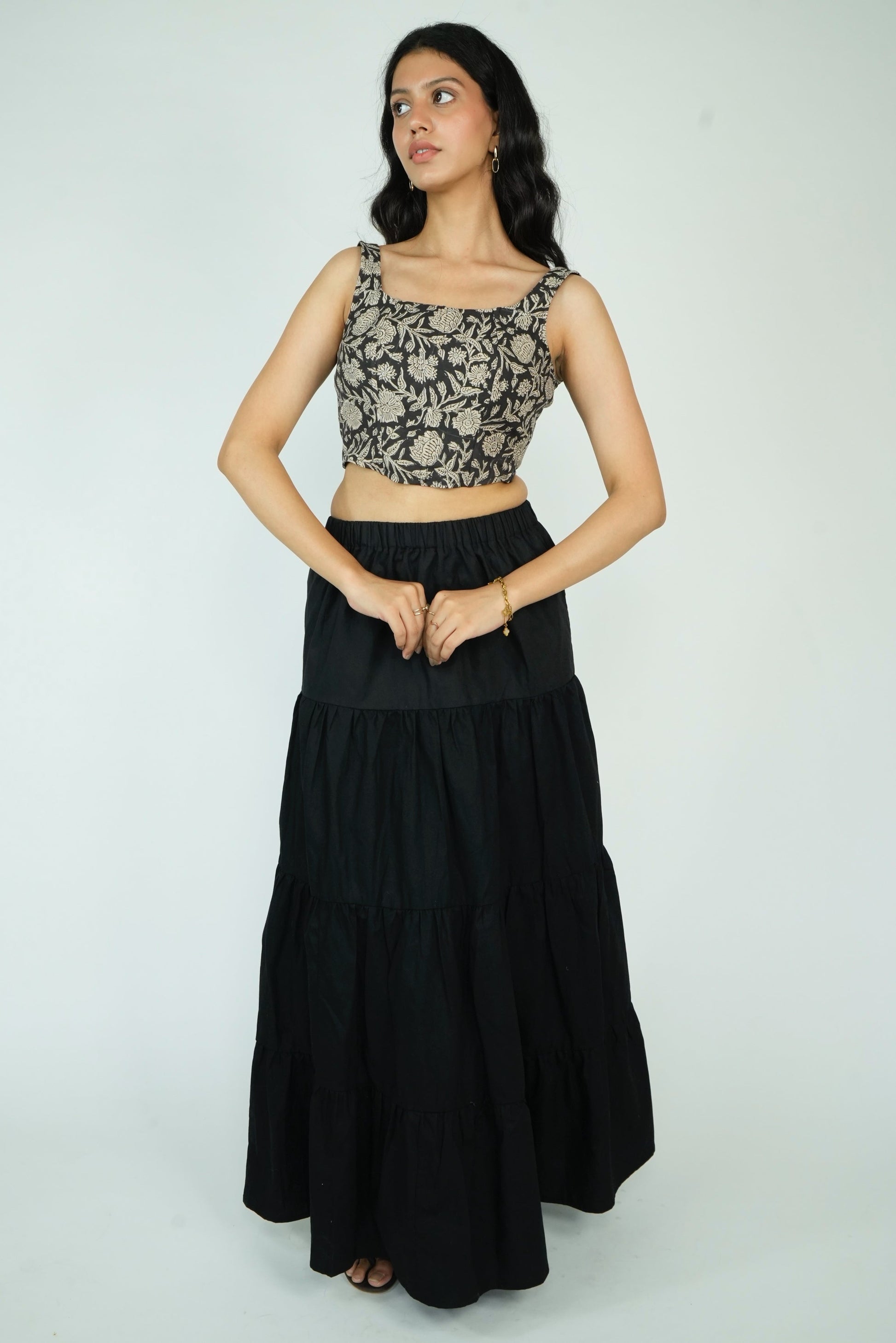 Elevate your style with our Layered Maxi Skirt. This flared skirt features an elasticated waistband with a drawstring closure for a perfect fit and a flared hem for a touch of elegance. Made from 100% premium cotton, it offers superior comfort and breathability. Available in four stunning prints, this skirt combines quality and style effortlessly.