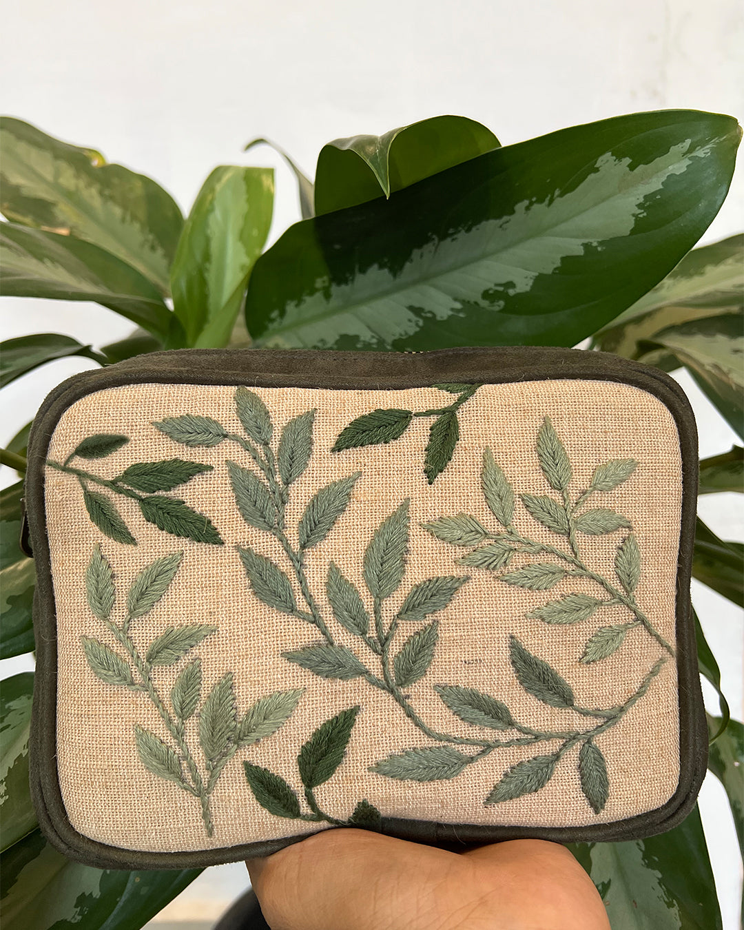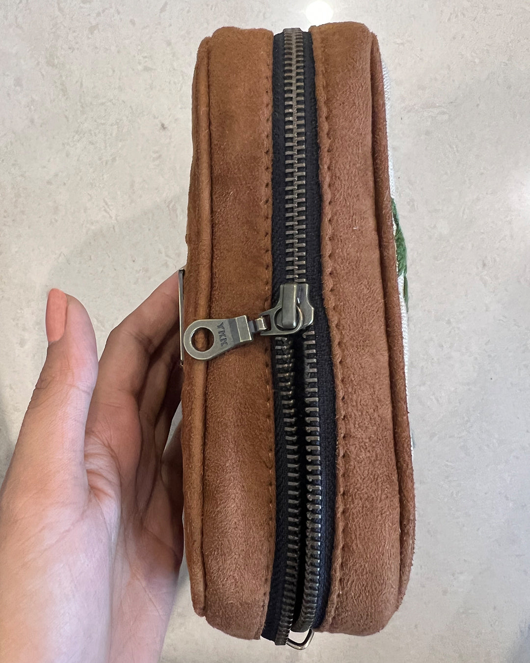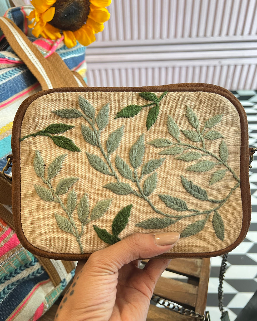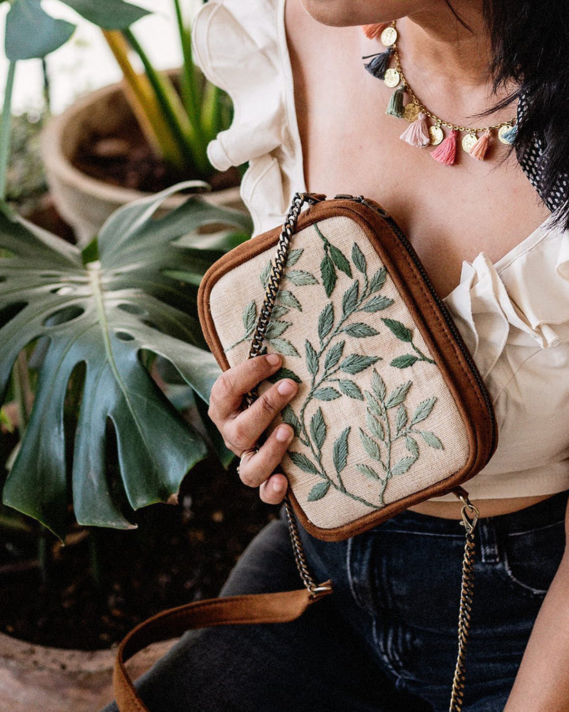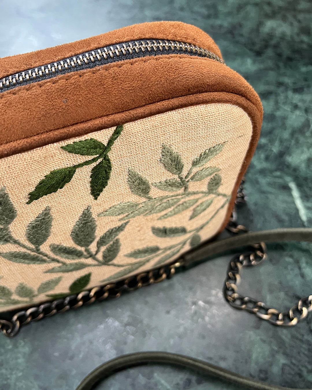 Leafy embroidery on vegan suede body comes in a compact size, perfect for everyday use. It has an attachable shoulder strap and loops at the back for you to use it as a belt bag.