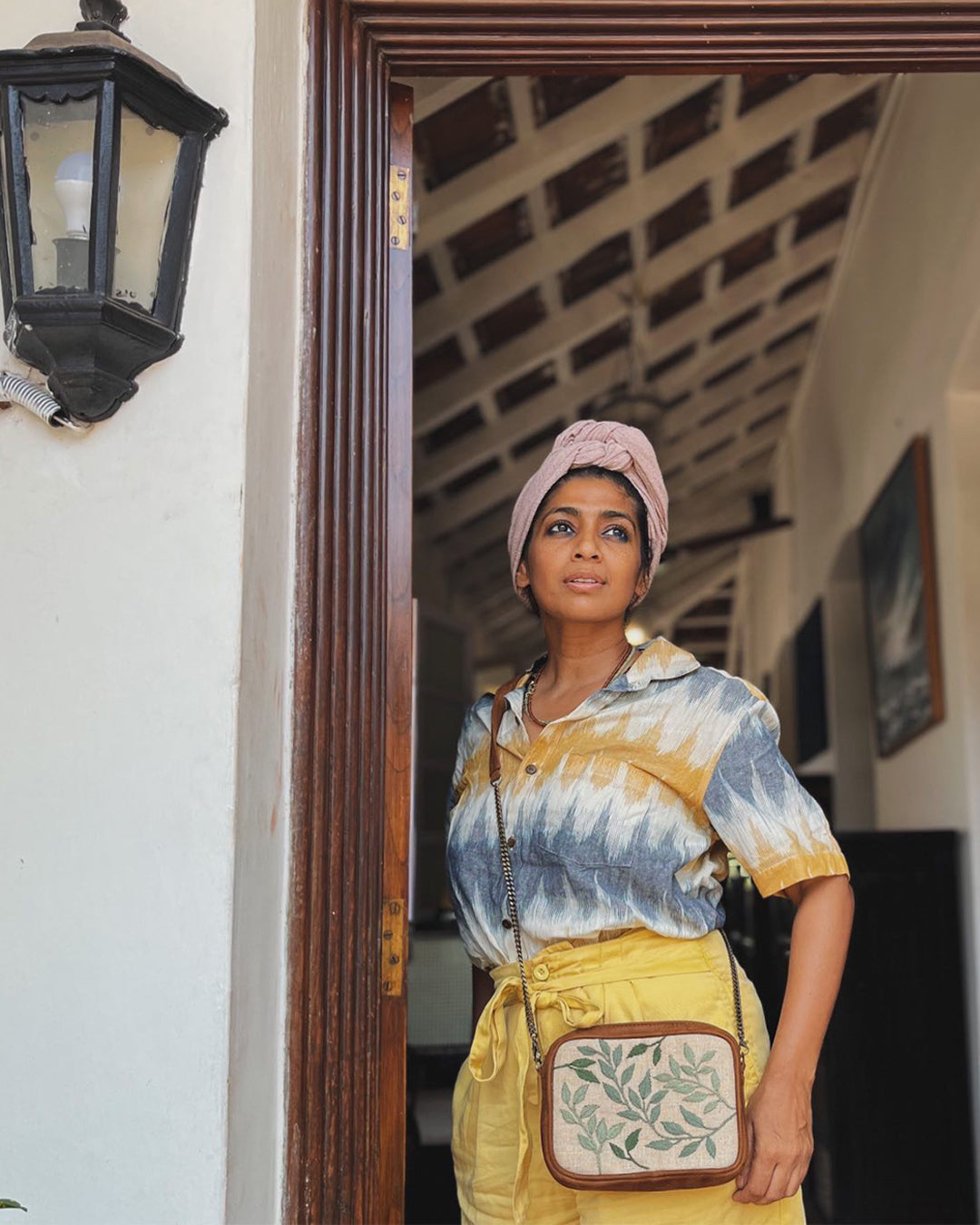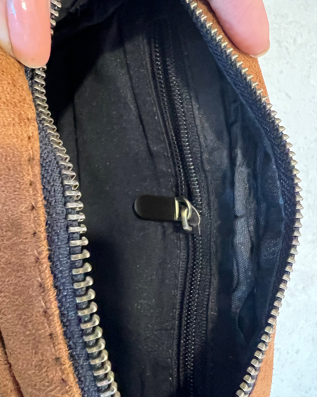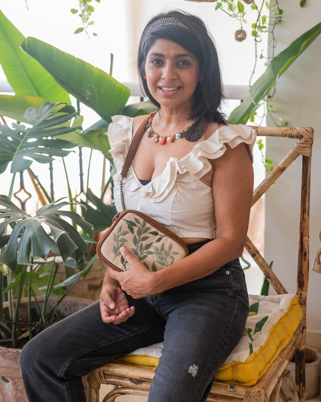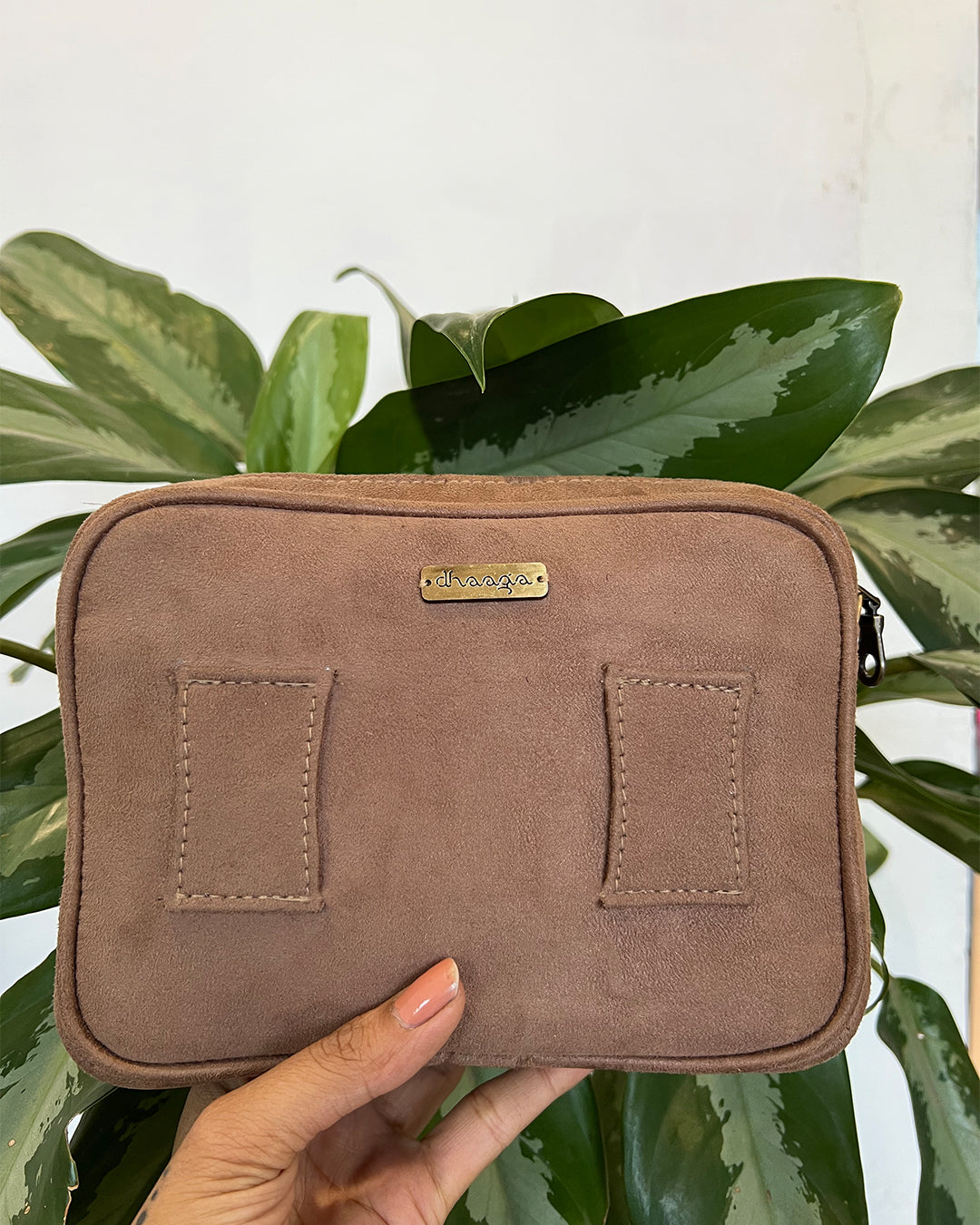 Leafy embroidery on vegan suede body comes in a compact size, perfect for everyday use. It has an attachable shoulder strap and loops at the back for you to use it as a belt bag.