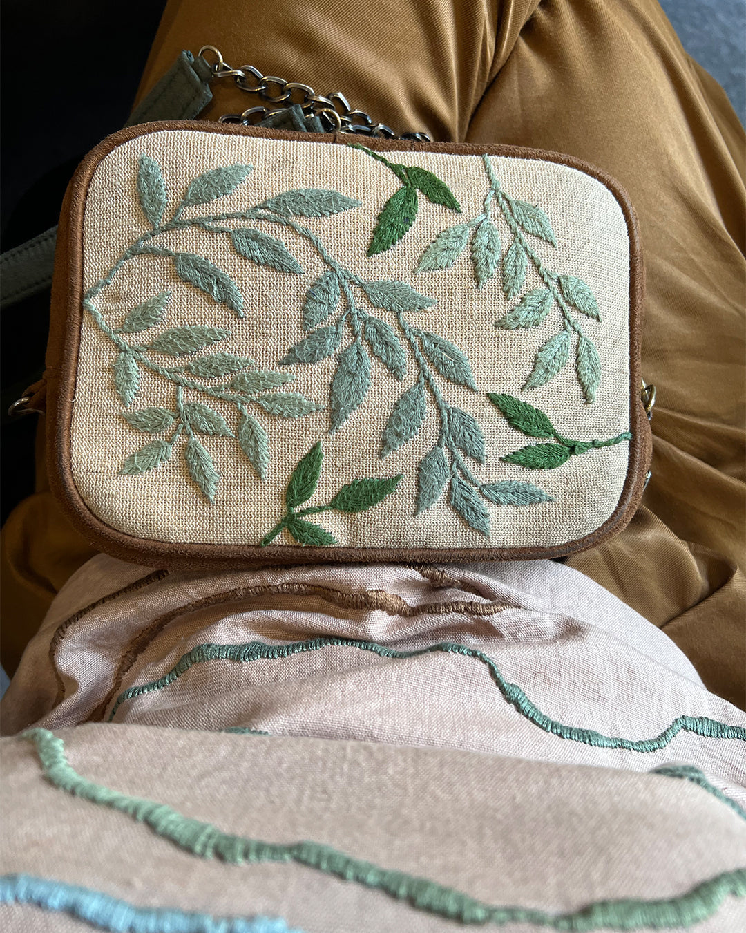 Materials: Hand-embroidery on Fabric, Vegan Suede, Metal chain