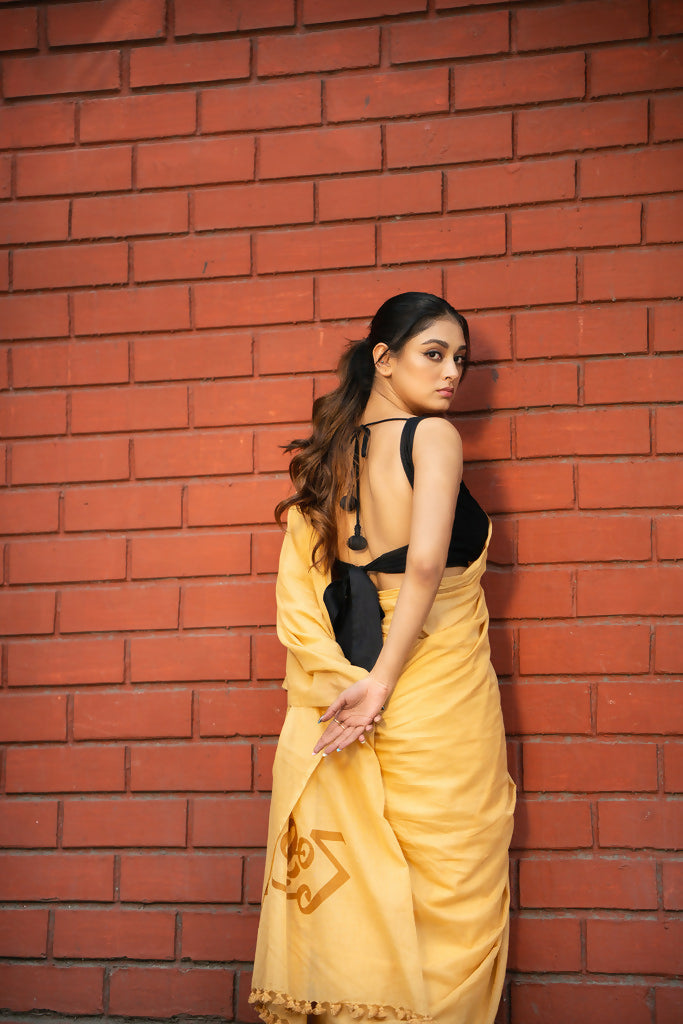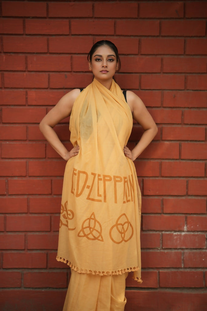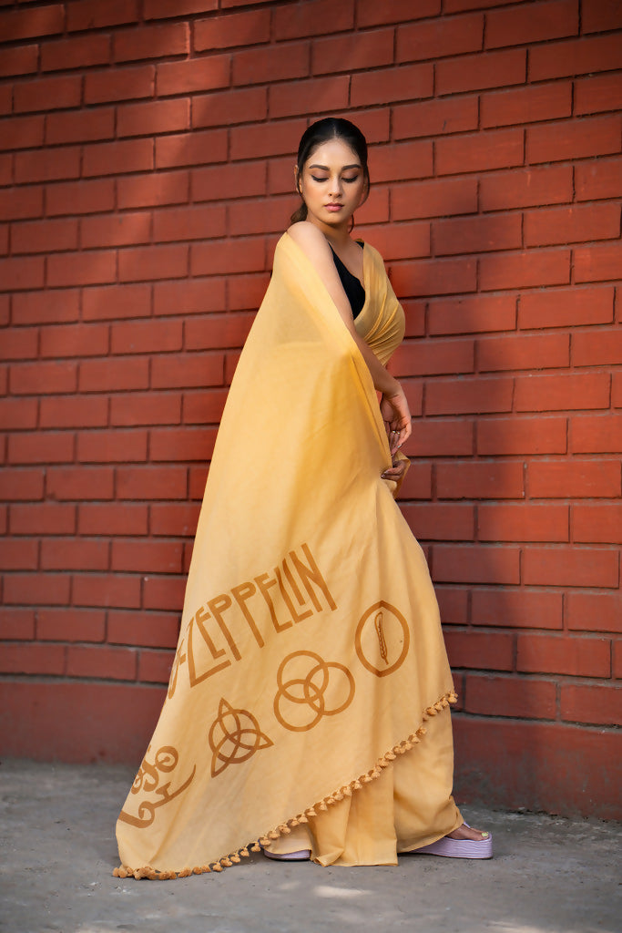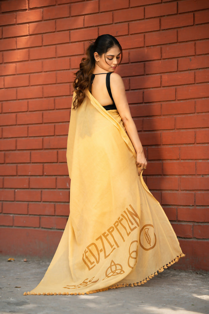 This golden-yellow saree is about to make you glitter like gold, isn't it the coolest outfit that you can carry? Obviously! The body is solid golden-yellow in color with the band's logo printed on the pallu.