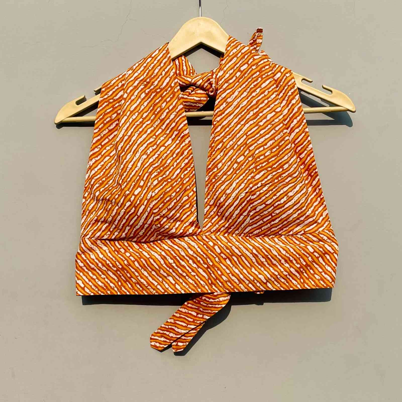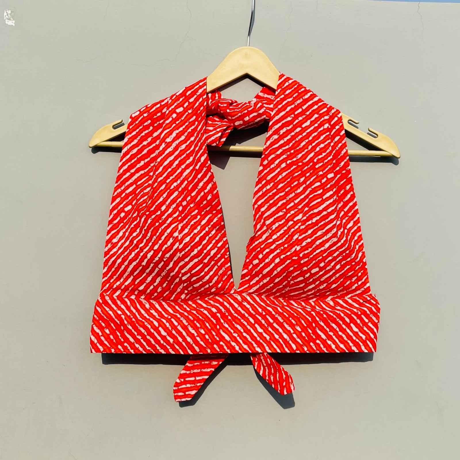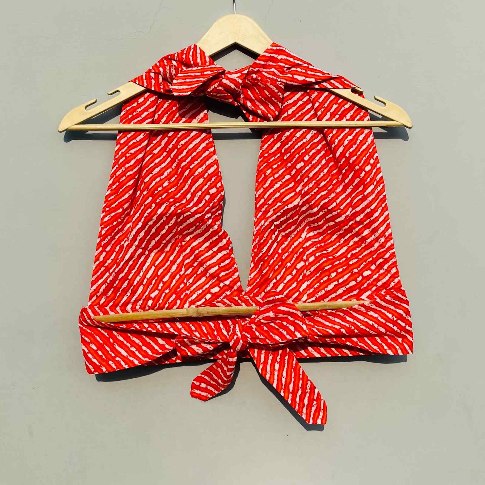 The Lehariya Halter Neck and Back Knot Top is a stylish blend of traditional and contemporary design. Featuring the classic Lehariya pattern, it captures vibrant, flowing waves of color. The halter neck adds a chic, modern touch, while the back knot detail creates a flattering, playful silhouette.