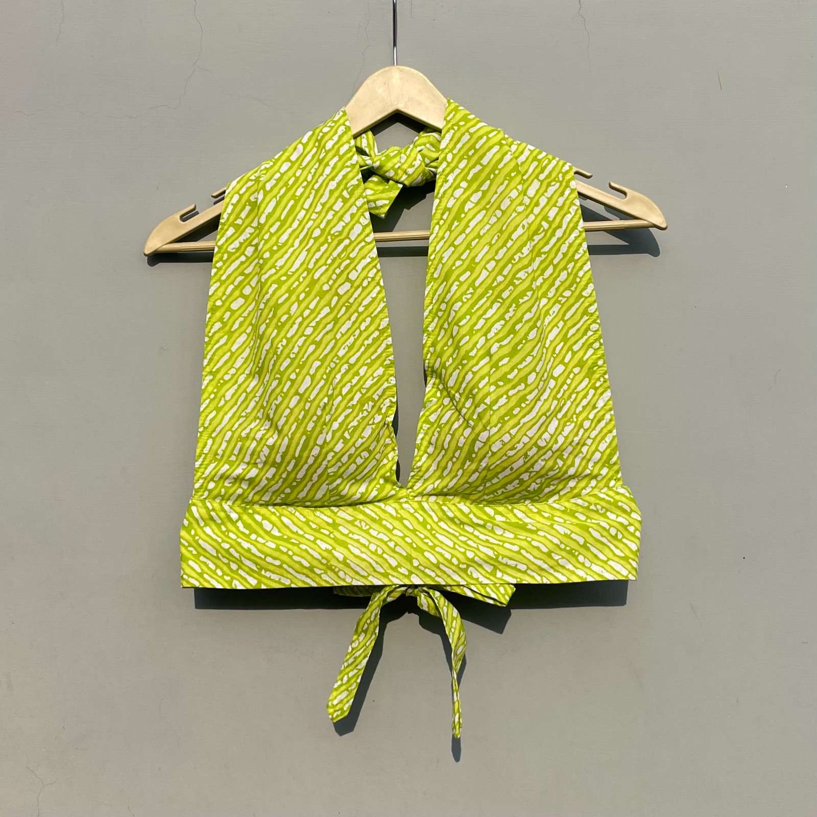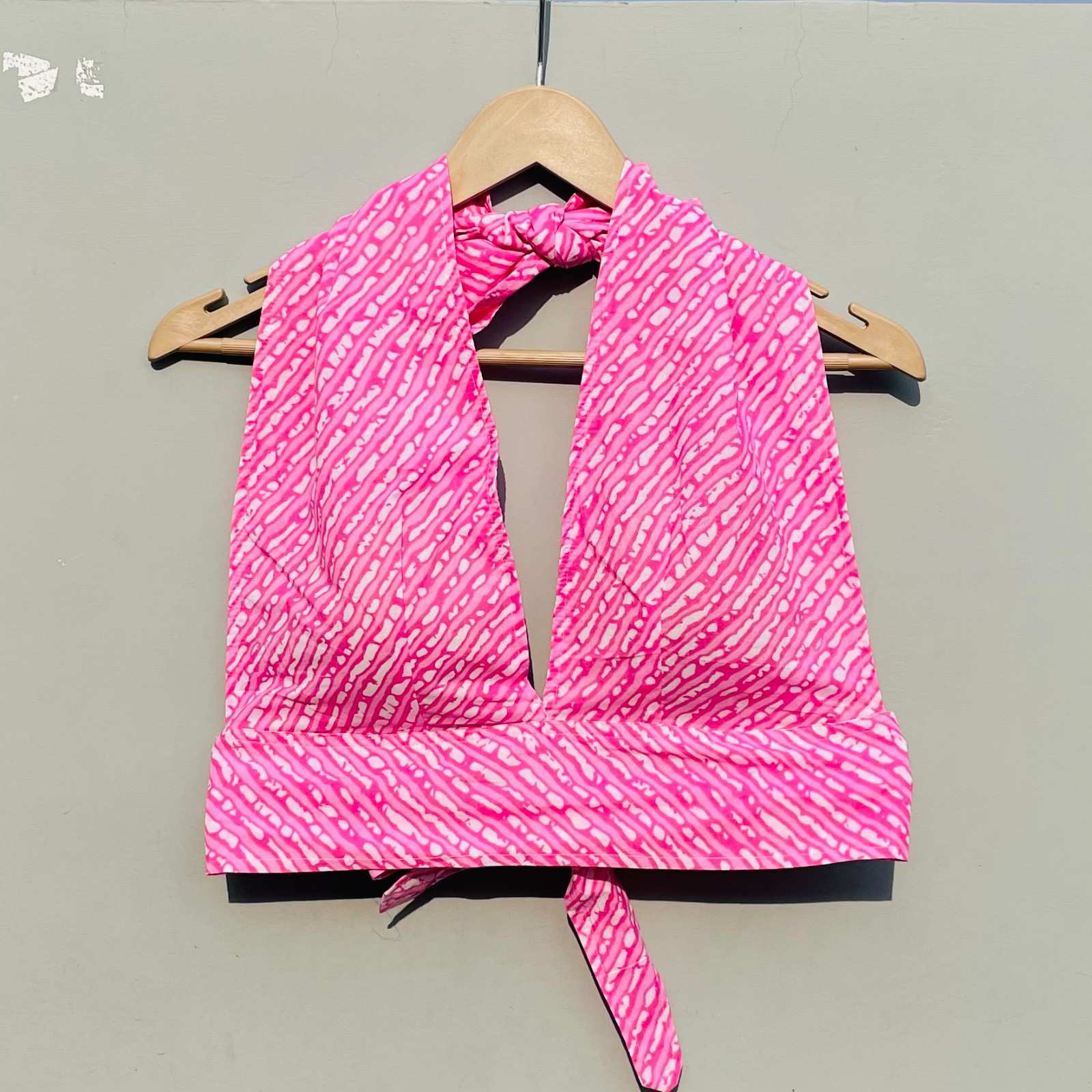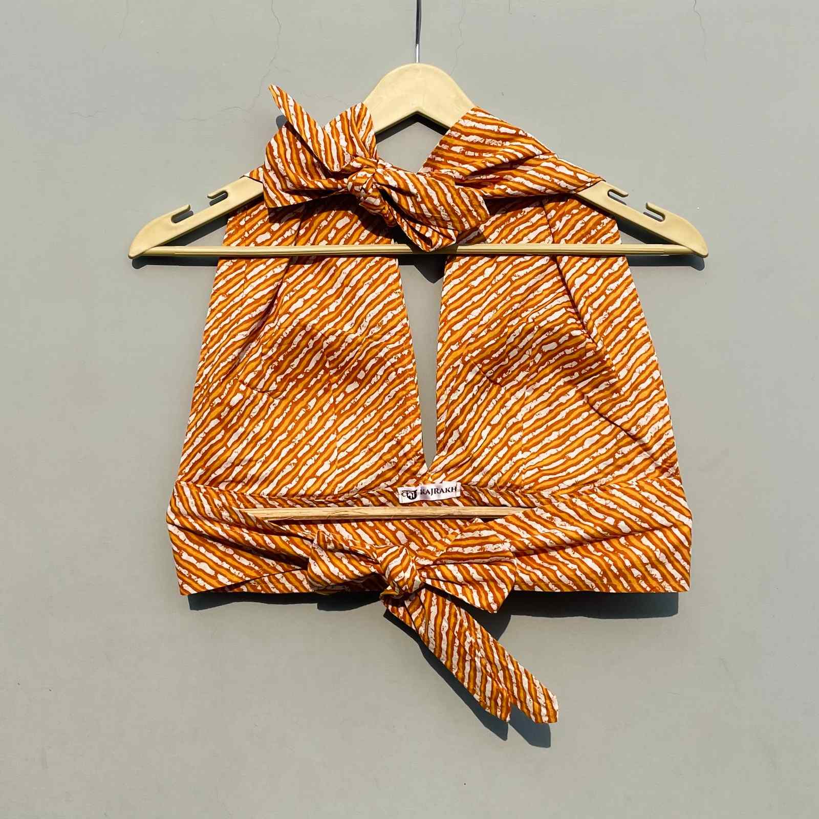 The Lehariya Halter Neck and Back Knot Top is a stylish blend of traditional and contemporary design. Featuring the classic Lehariya pattern, it captures vibrant, flowing waves of color. The halter neck adds a chic, modern touch, while the back knot detail creates a flattering, playful silhouette.