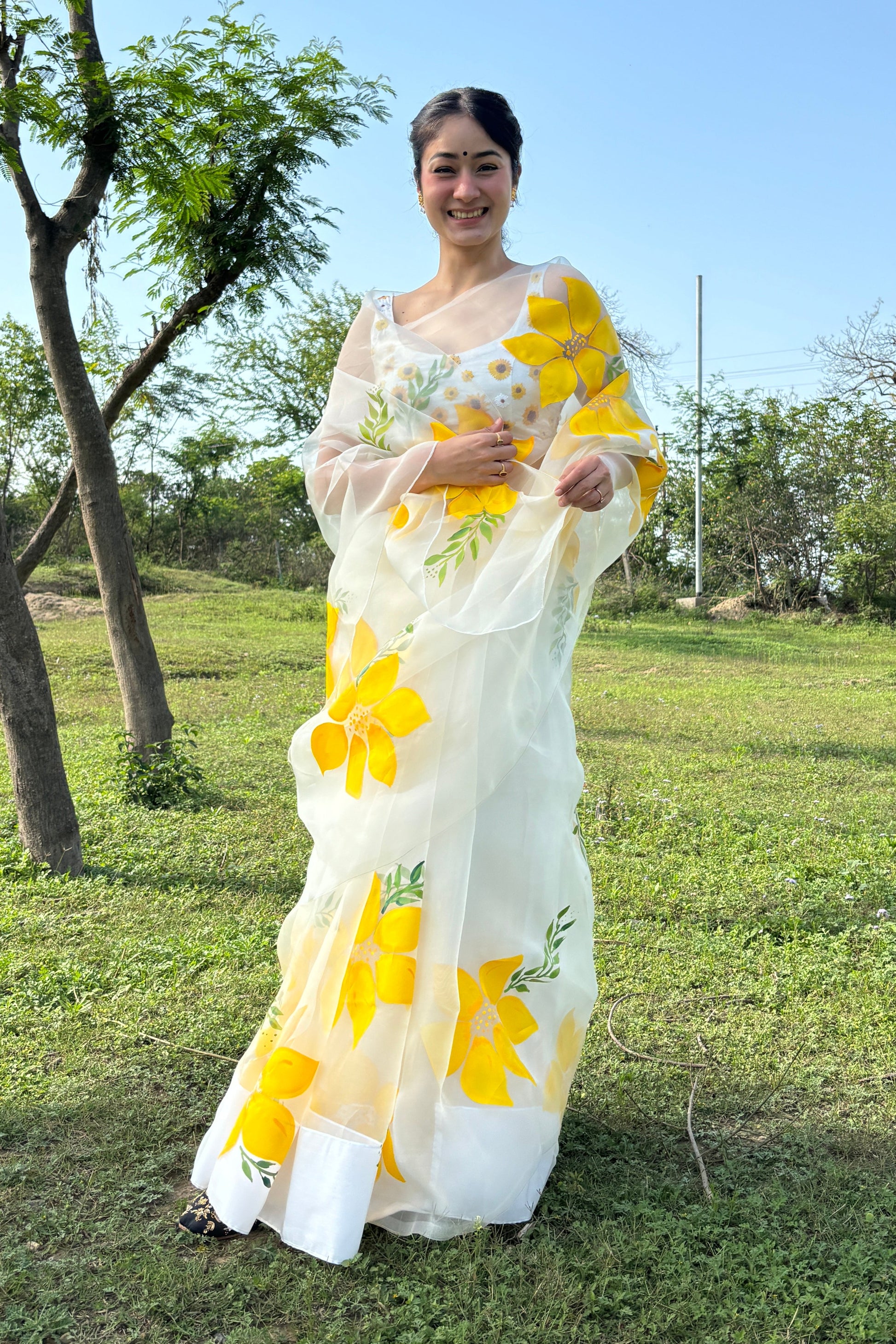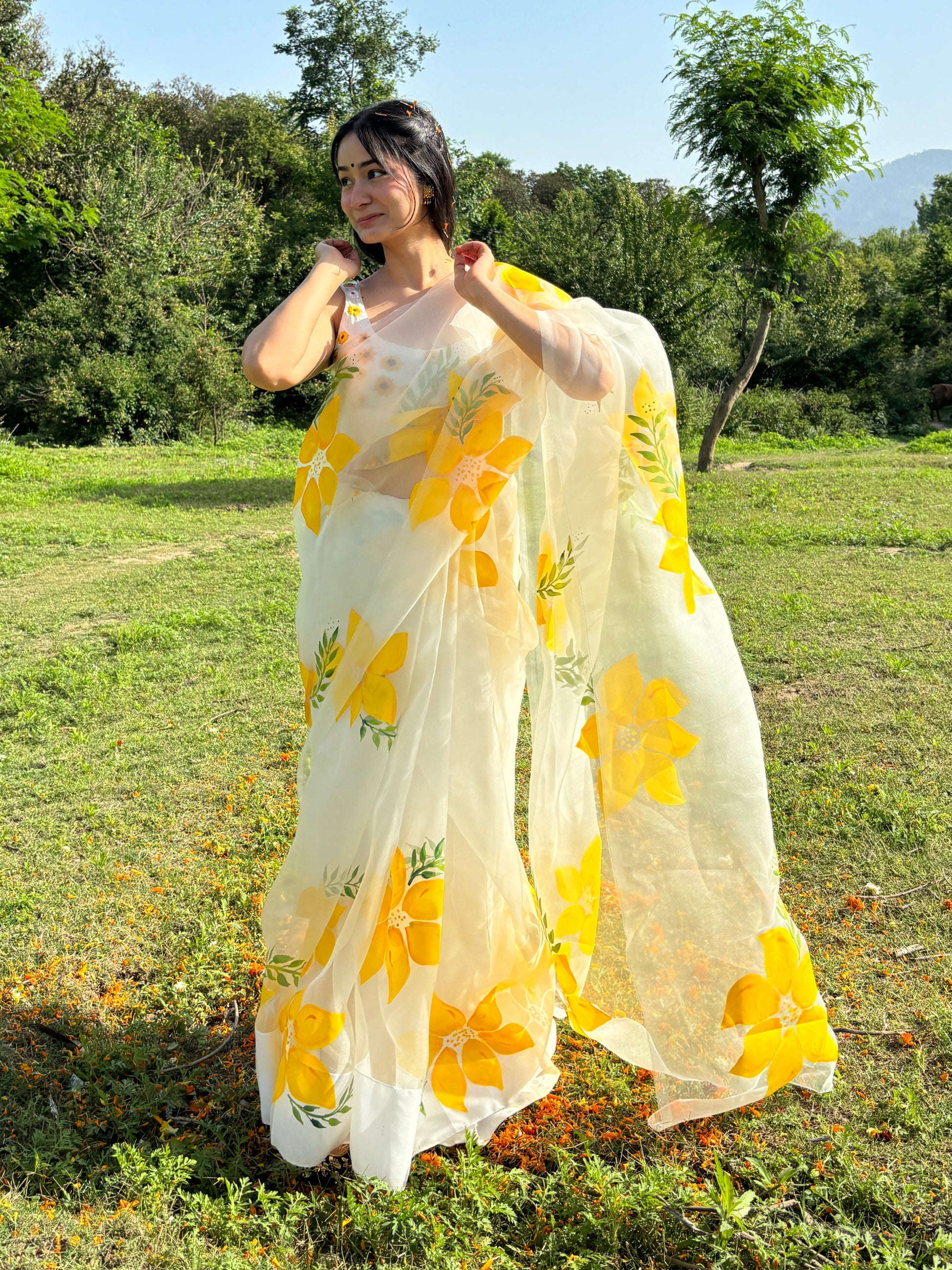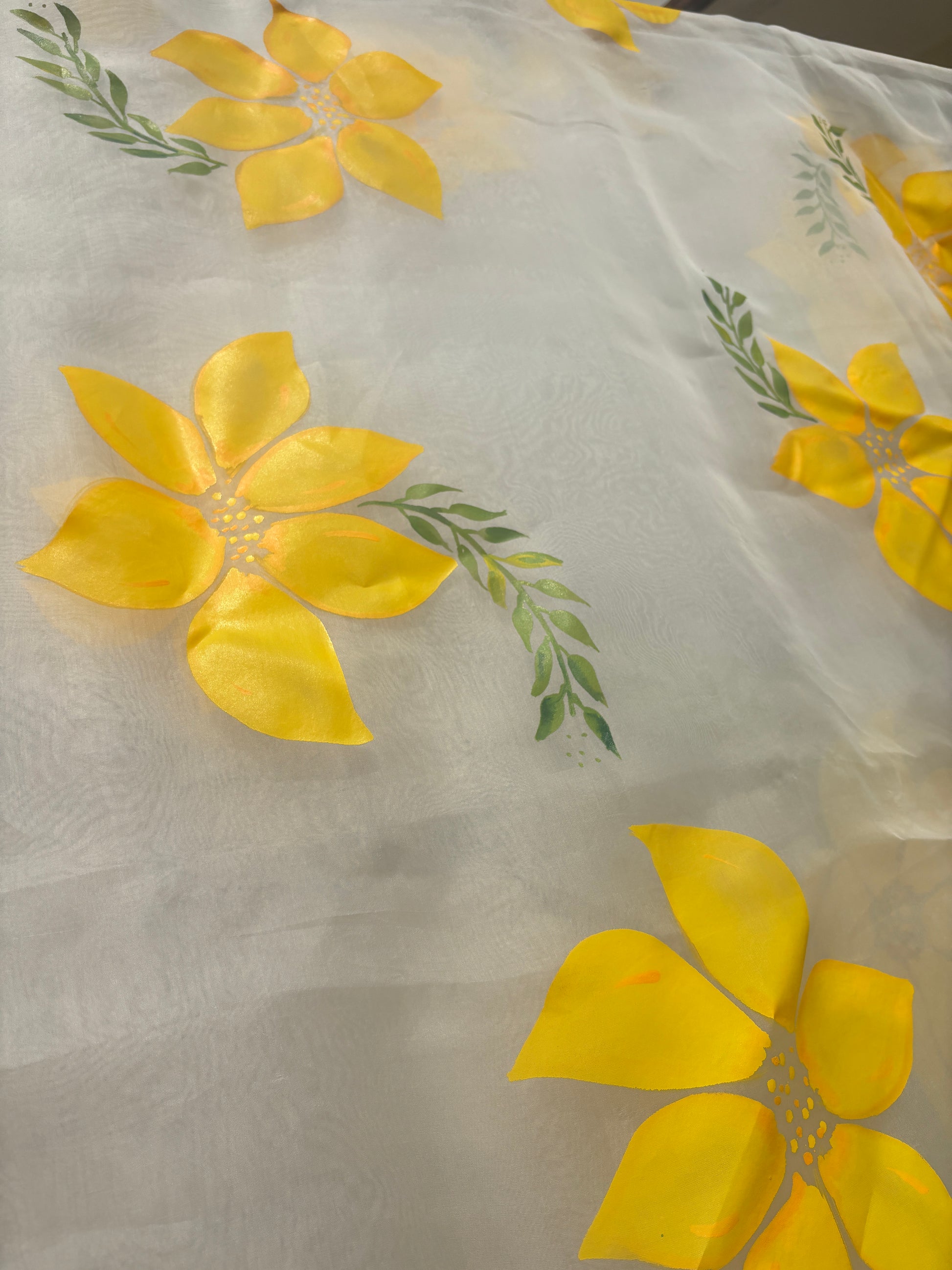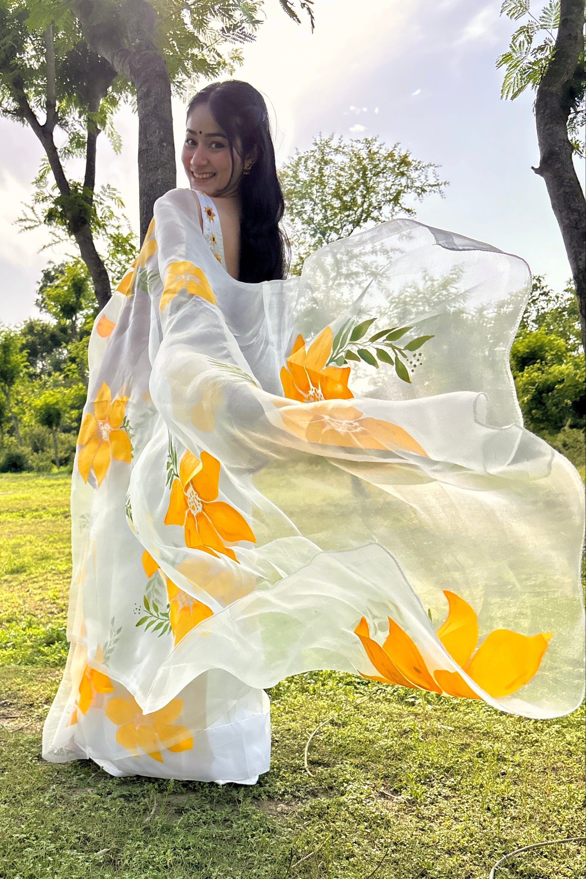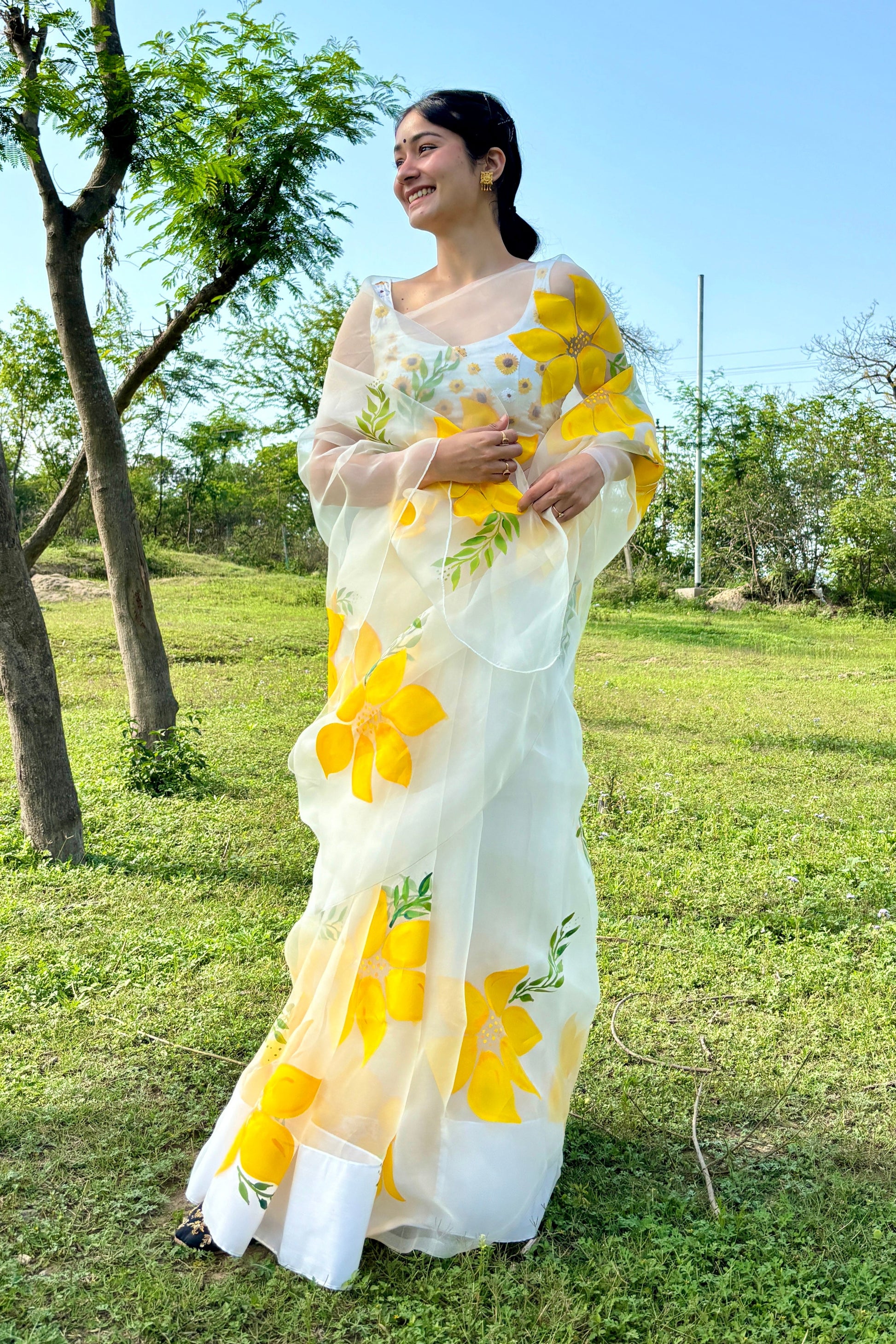 This hand-painted organza saree features a beautiful floral print. Lightweight and elegant, it's perfect for special occasions, offering a blend of traditional charm and modern grace.