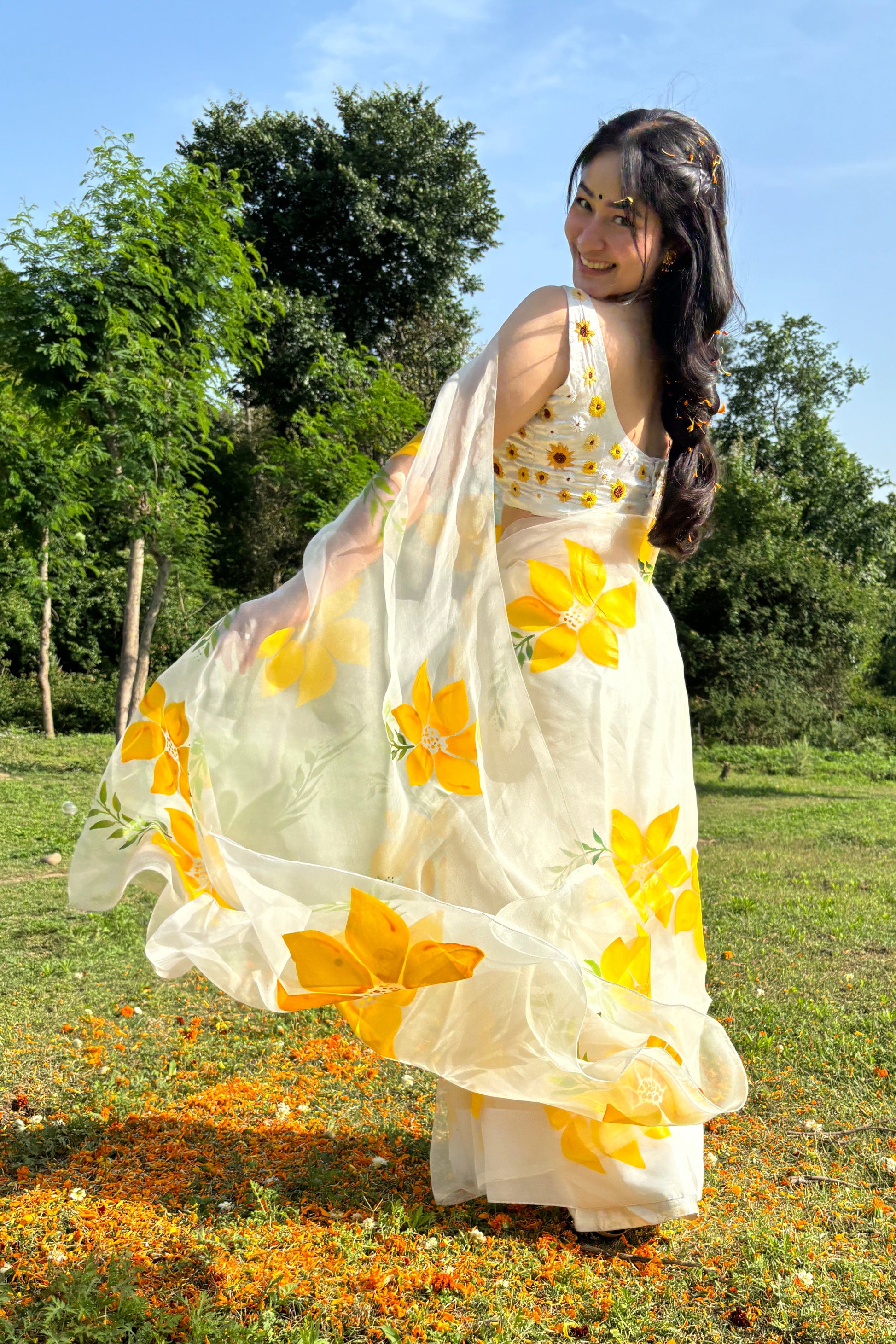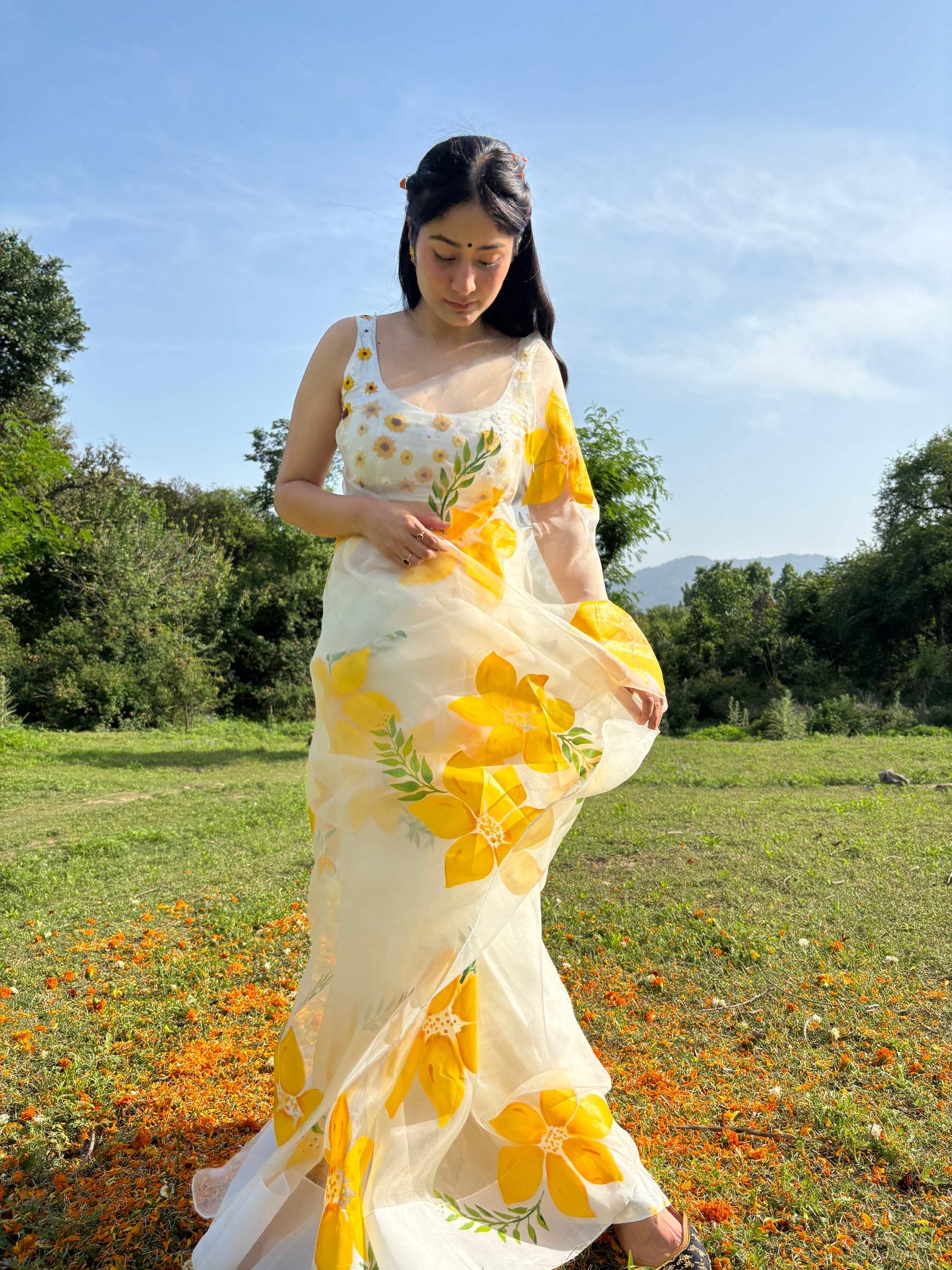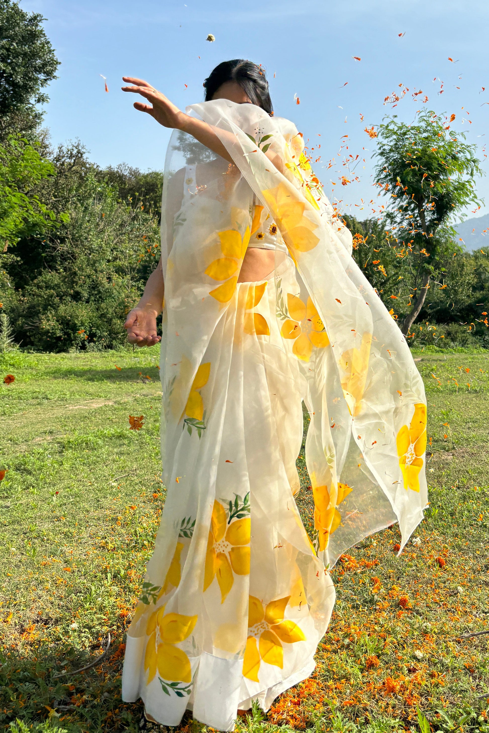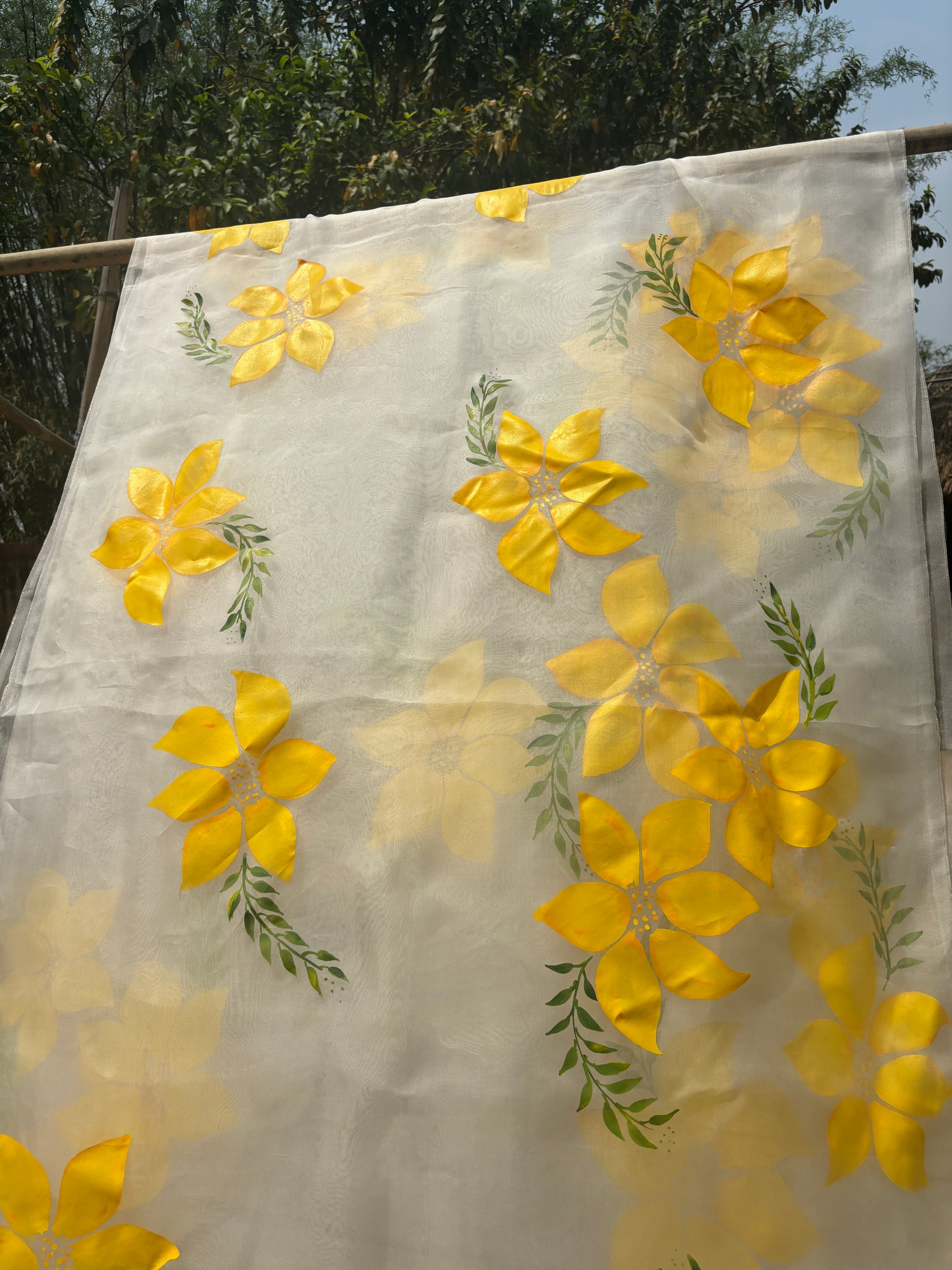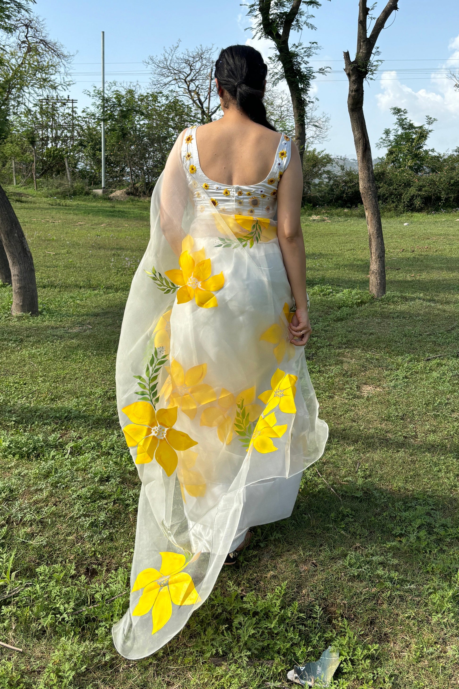 This hand-painted organza saree features a beautiful floral print. Lightweight and elegant, it's perfect for special occasions, offering a blend of traditional charm and modern grace.