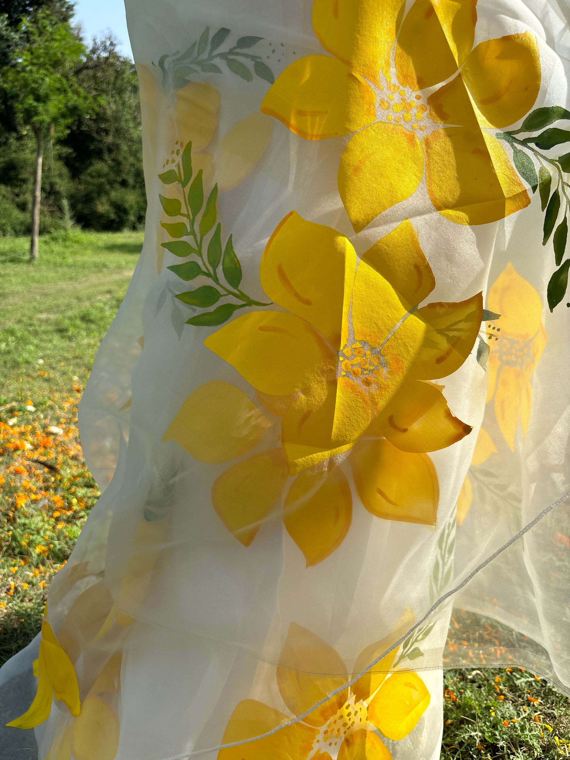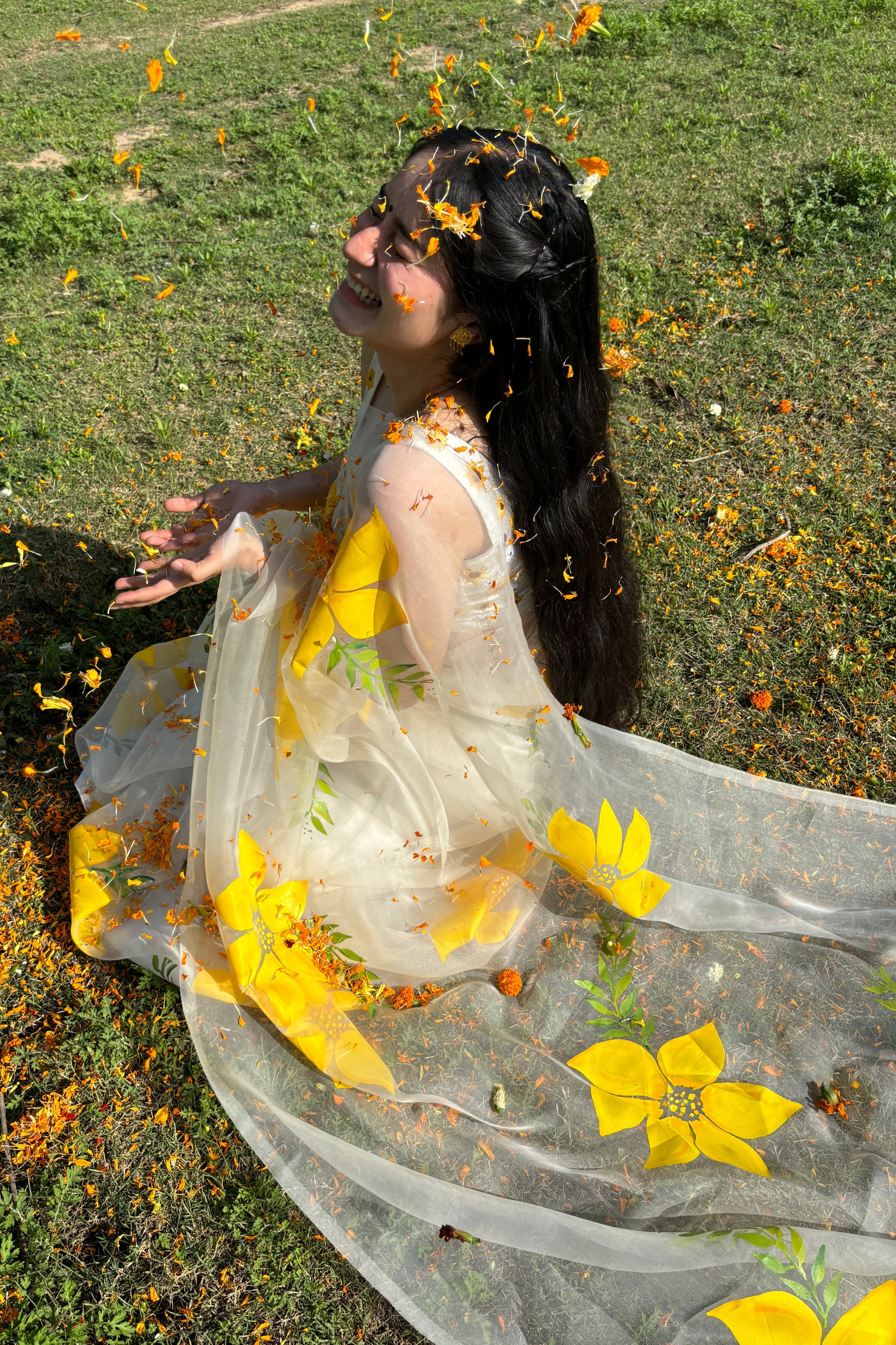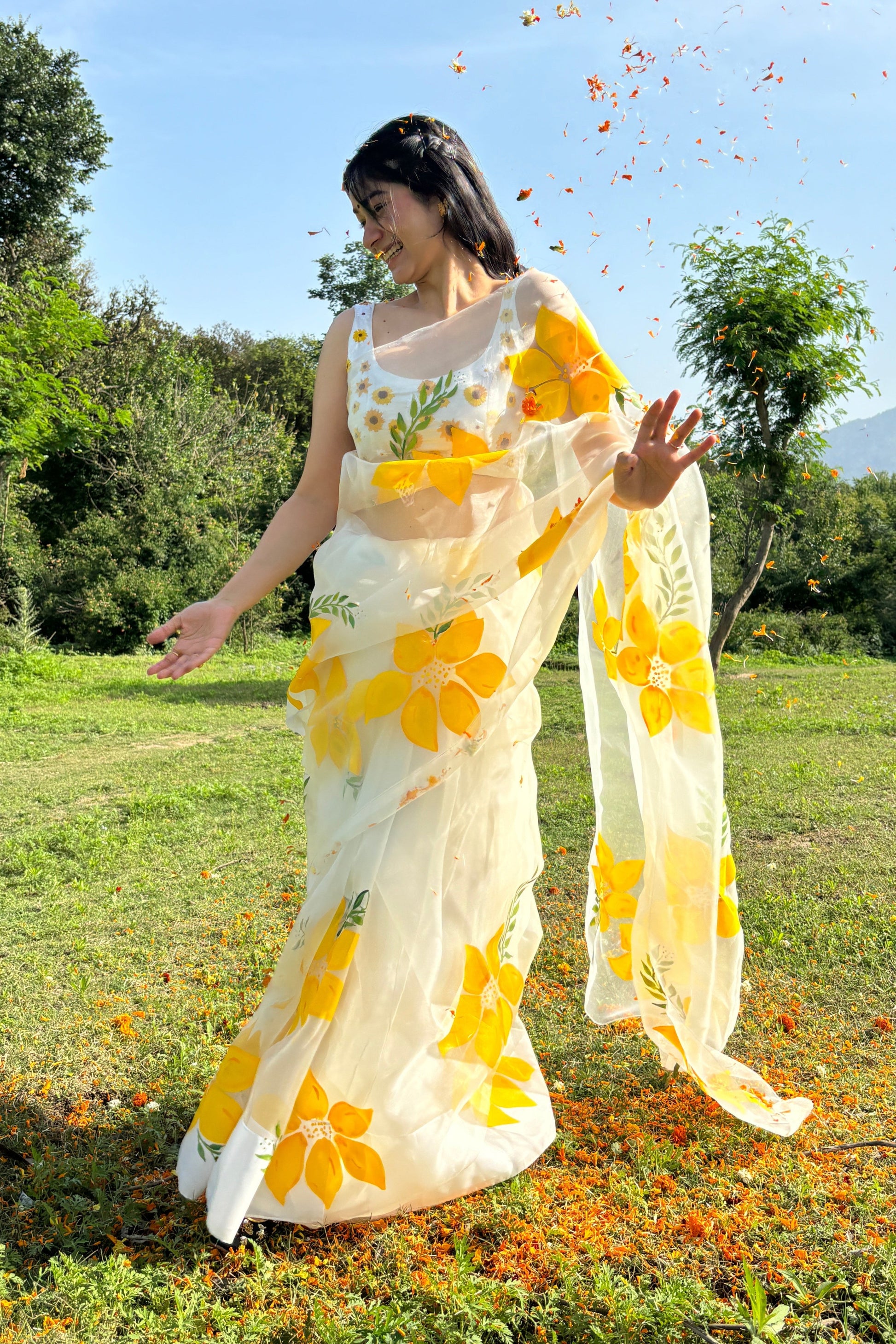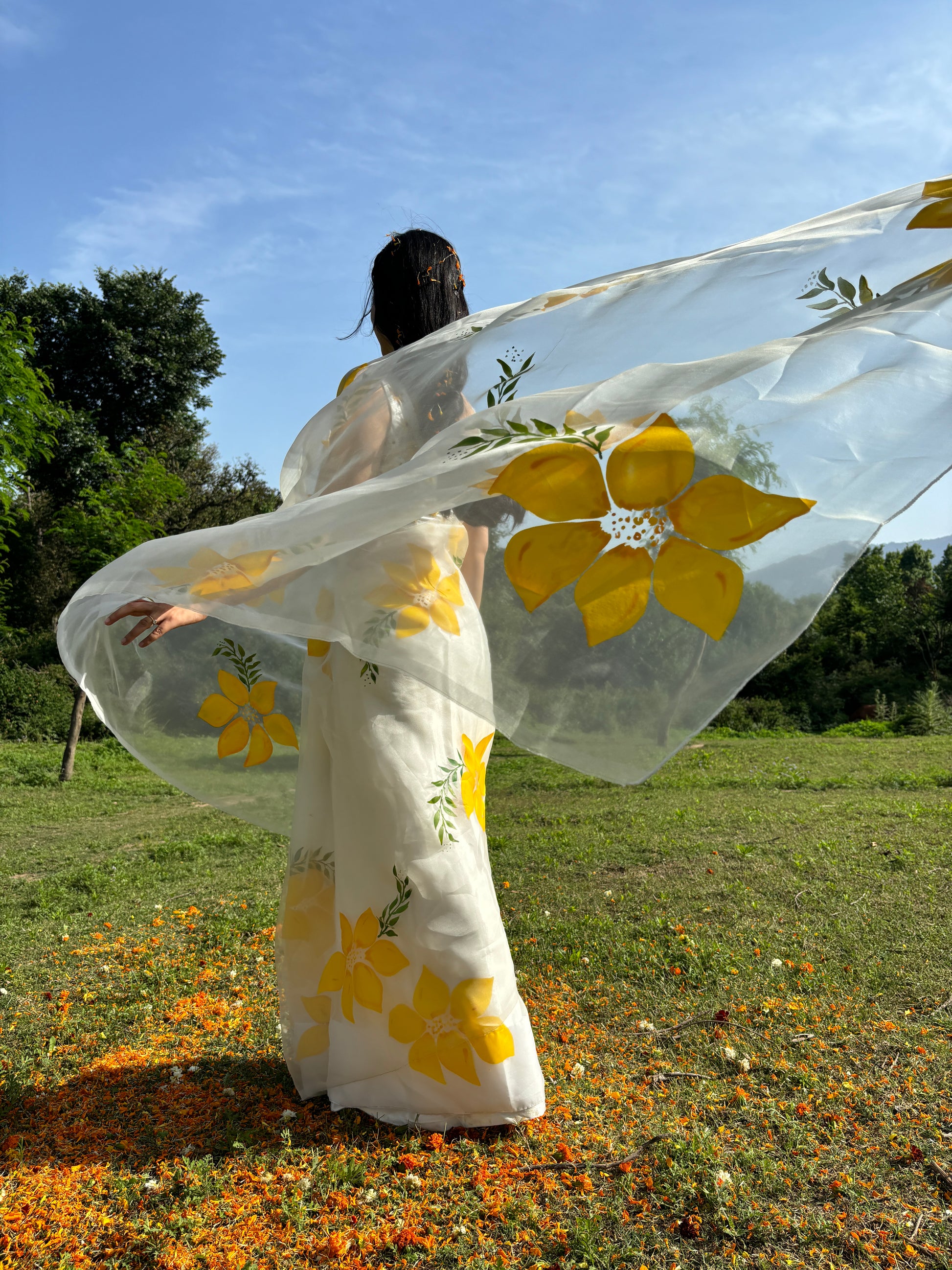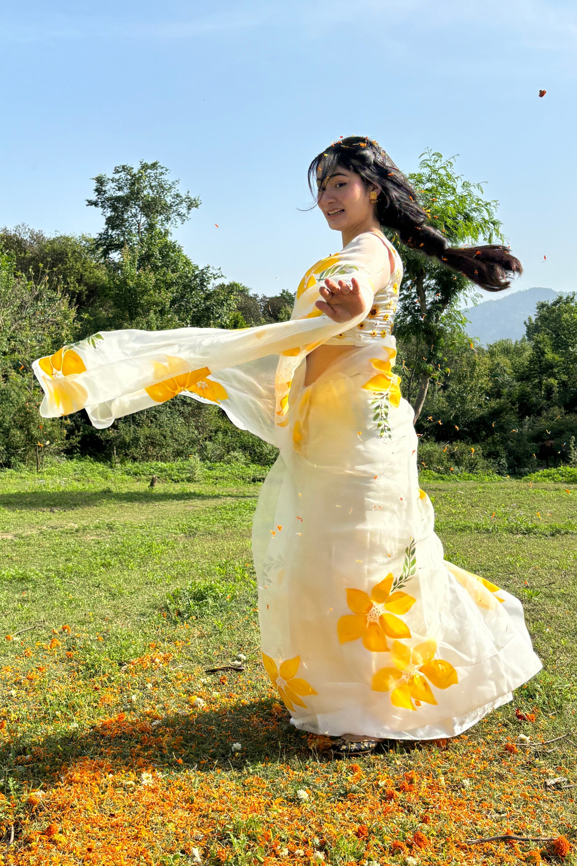 This hand-painted organza saree features a beautiful floral print. Lightweight and elegant, it's perfect for special occasions, offering a blend of traditional charm and modern grace.