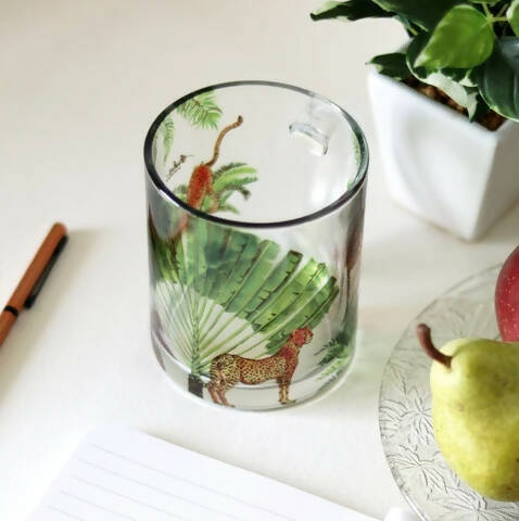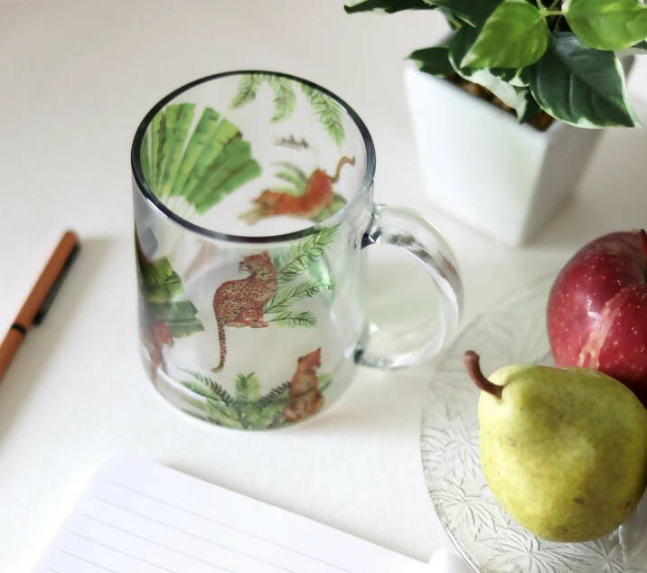 The Leopard Print Clear Glass Mug is a botanical design print that can make a wonderful gift for your loved ones or a unique addition to your own collection.