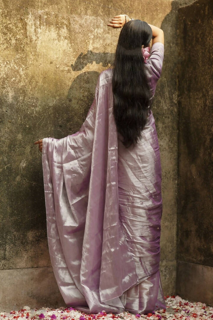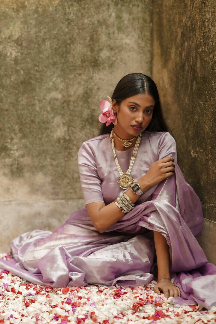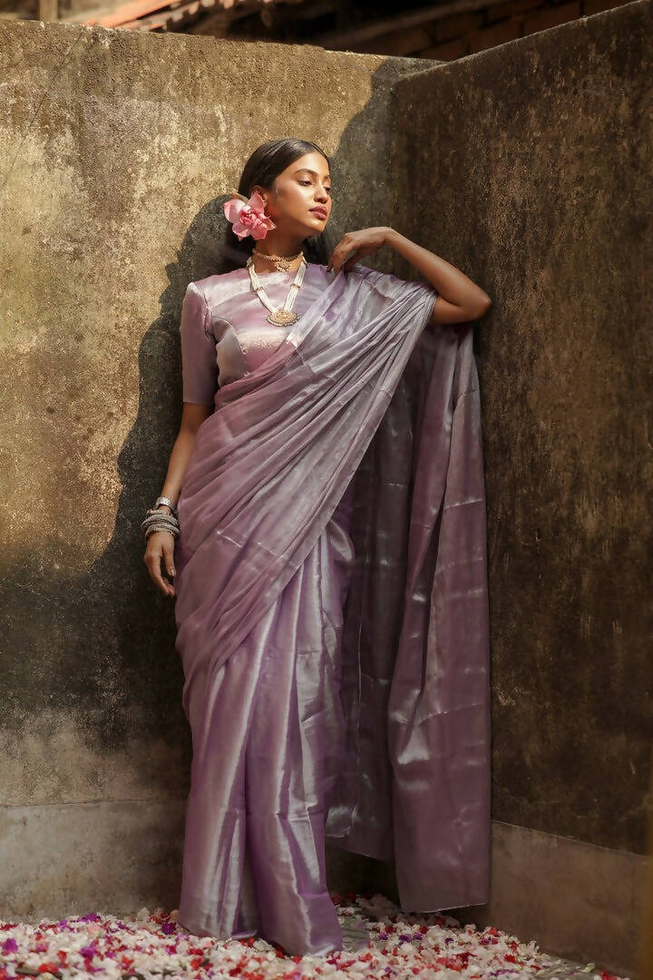 Lilac Lily handloom tissue saree is a classic and can be styled in multiple ways! Style it for a casual event or pair it with heavy jewellery for an intimate event. You can also opt for contrasting blouse to make a statement!