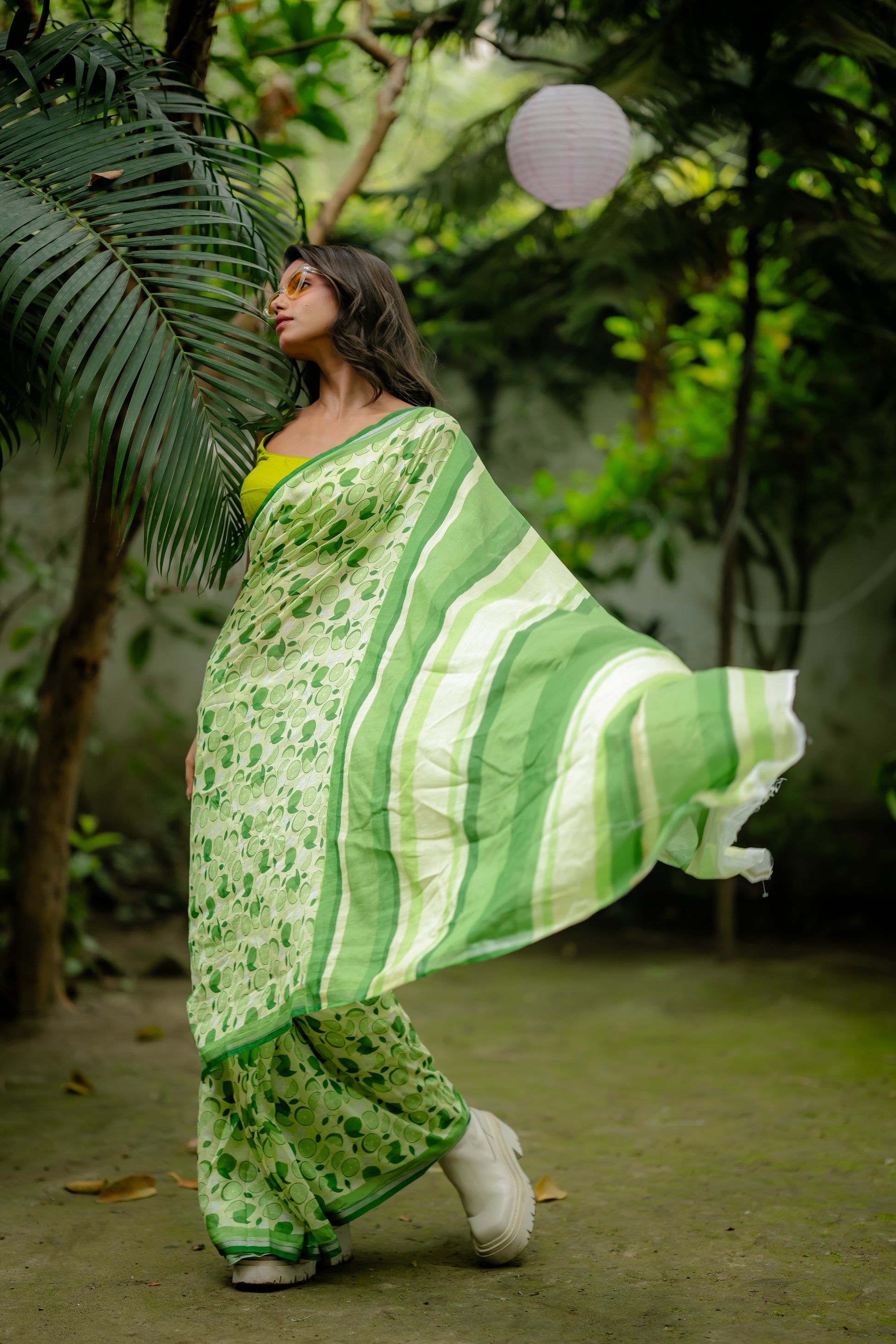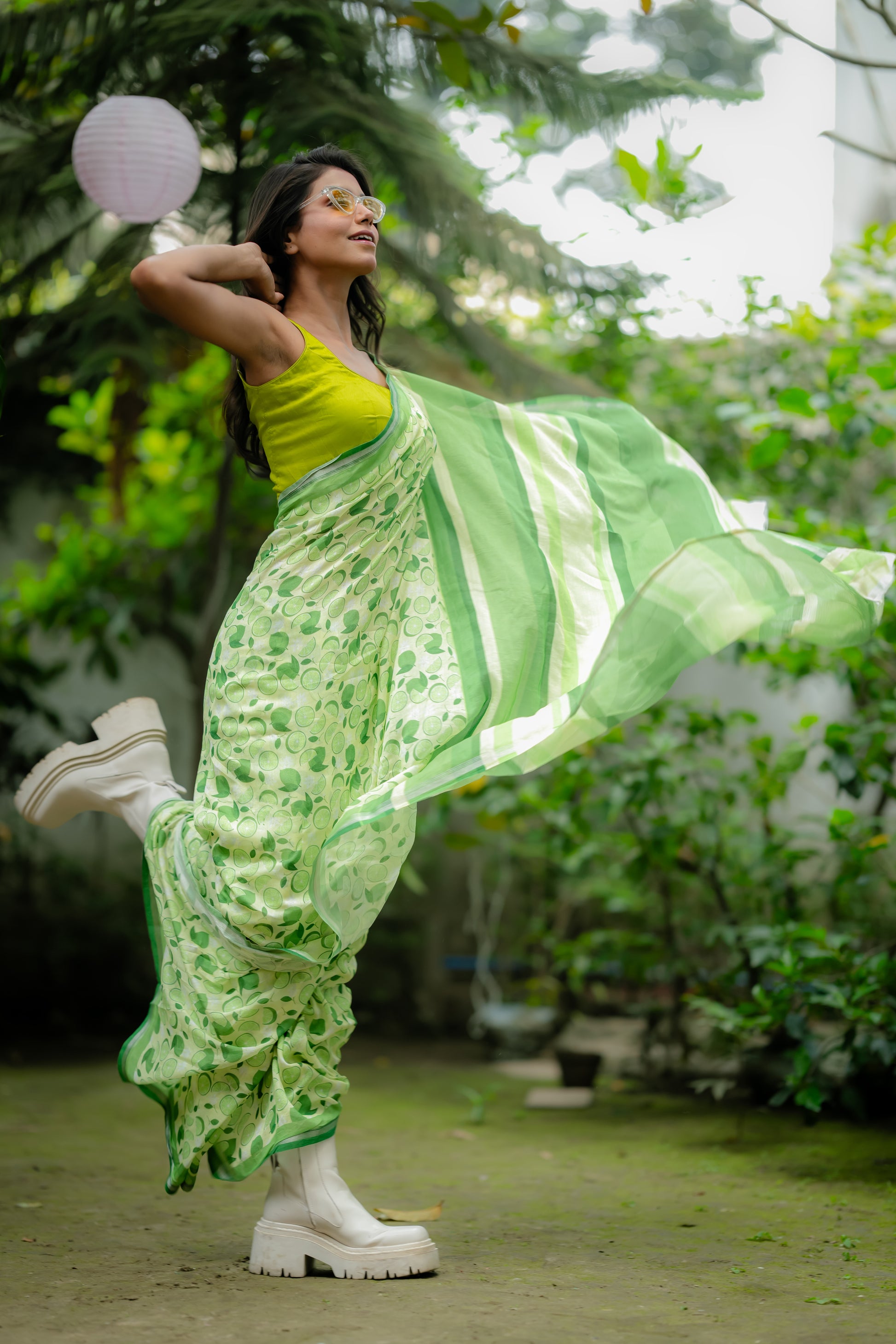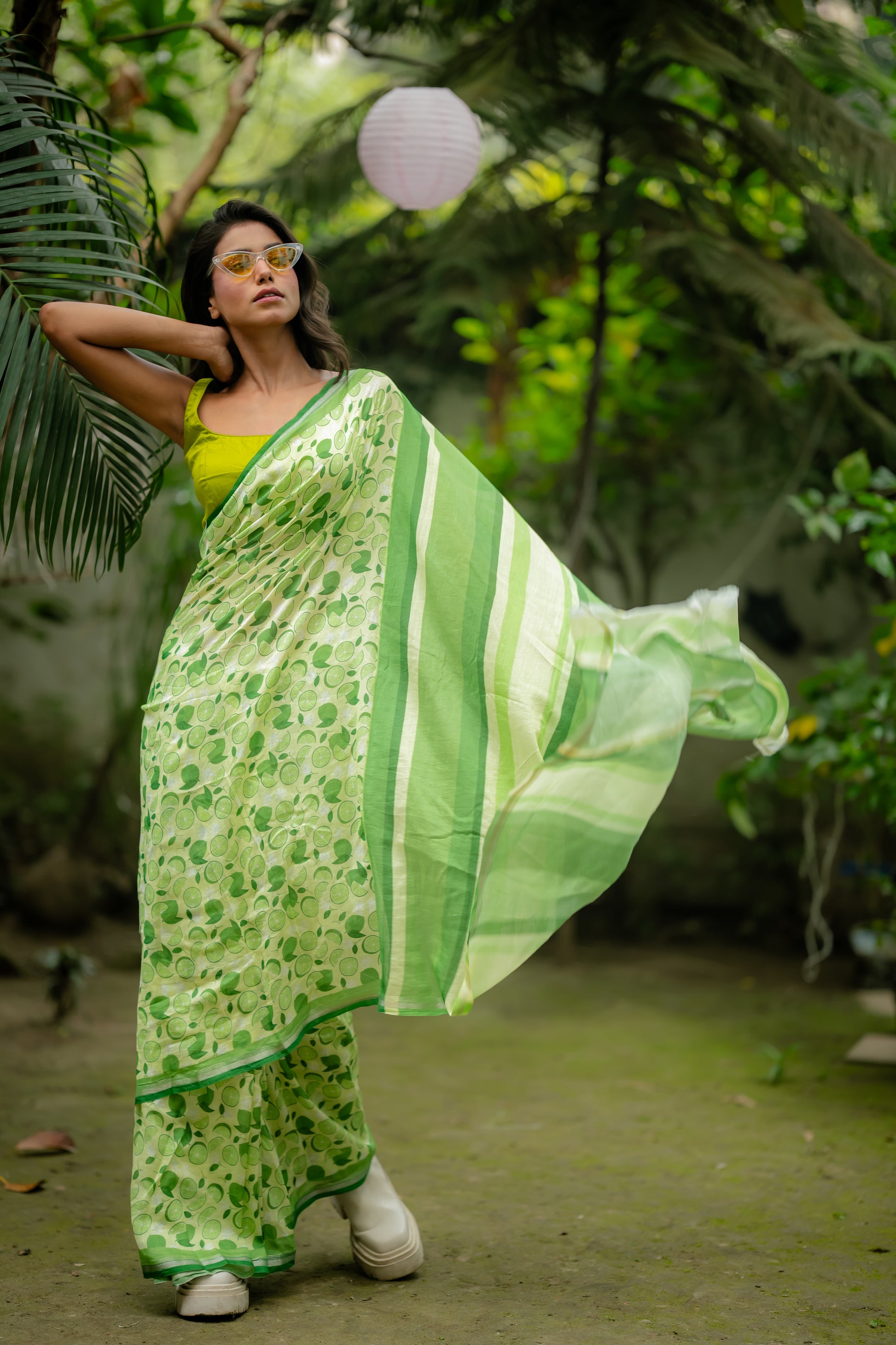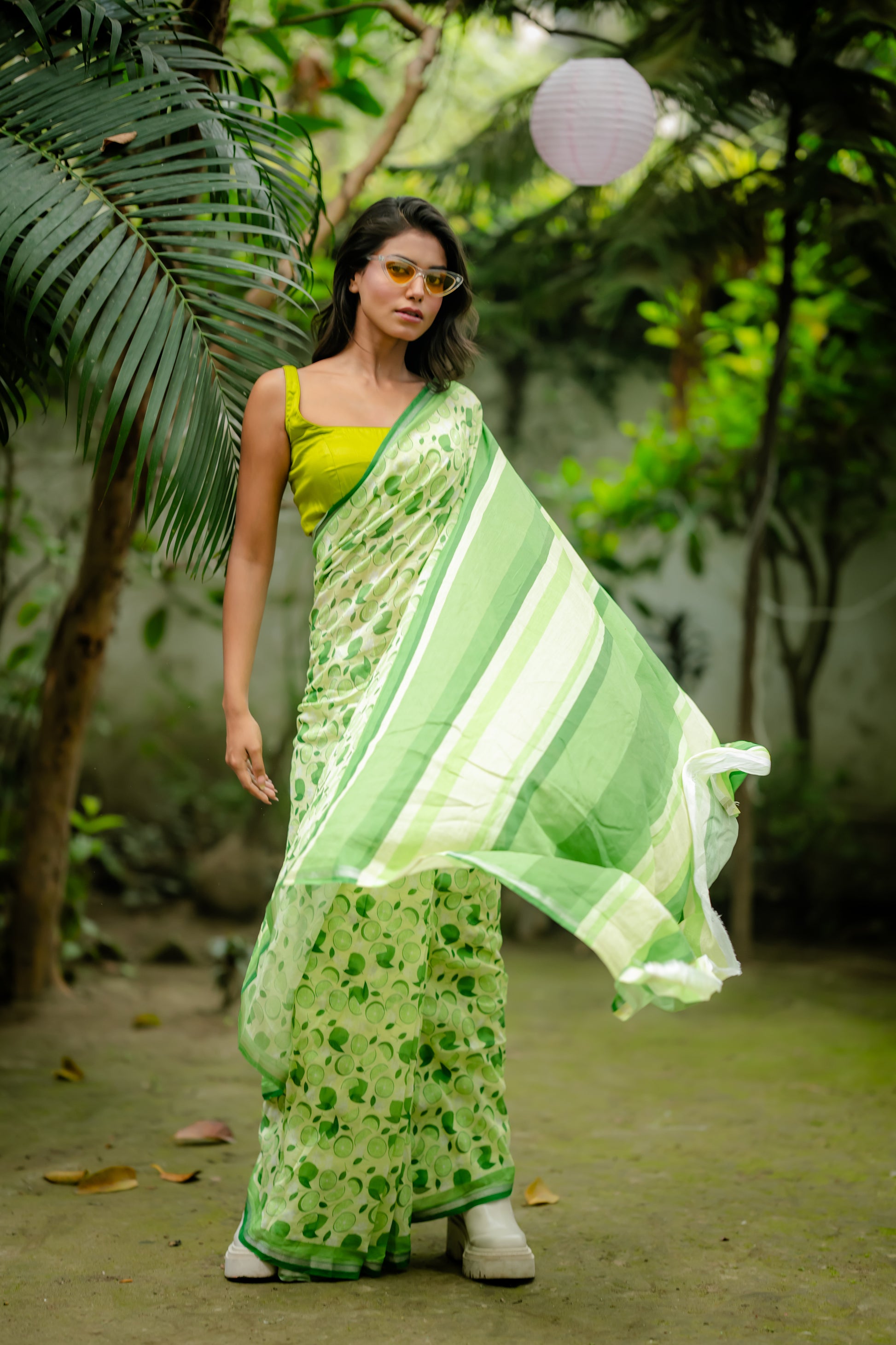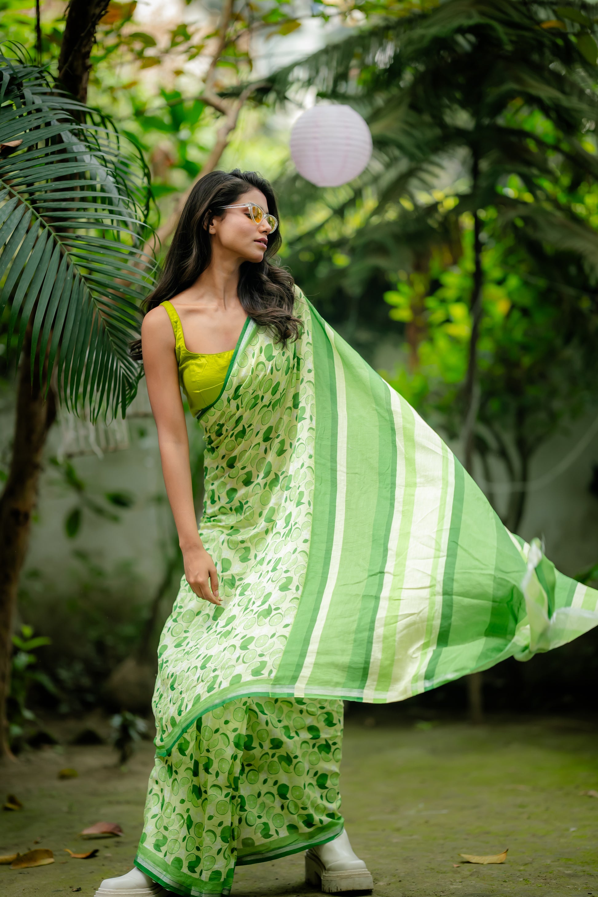 “Lime & Lemony”, a delightful and refreshing ensemble that evokes memories of iconic advertisements and the invigorating sensation of citrusy freshness. This saree, adorned with playful lemon prints, captures the essence of summer in a vibrant and spirited way, like the memorable Liril and Limca ads that left an indelible mark on our minds. The bright and cheerful lemon prints against a backdrop of lush green hues instantly uplift the mood and rejuvenate the senses, reminiscent of the crisp, tangy aroma of citrus fruits.