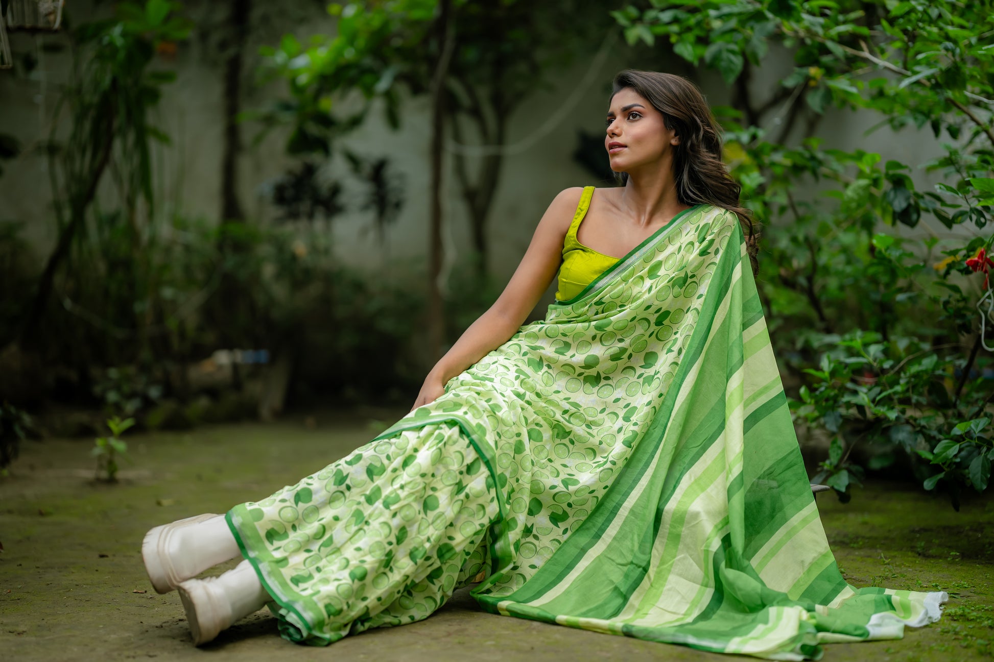Whether you are lounging by the pool, attending a garden party, or simply enjoying a leisurely stroll in the evening, this saree keeps you feeling cool, fresh, and effortlessly chic.Crafted from lightweight fabric, the saree drapes gracefully and allows for easy movement, ensuring comfort even on the hottest of days. Pair it with minimalistic jewellery and sandals for a relaxed yet stylish look.