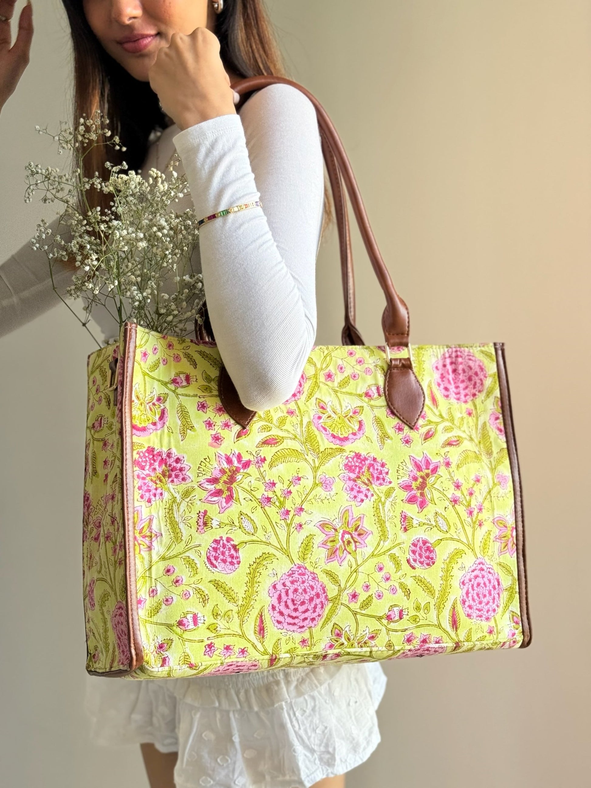 Our versatile tote with a vibrant lime green and pink, hand-printed floral design. This office essential features a zippered main compartment, a dedicated laptop sleeve section with an additional compartment, and a detachable long leather tan-coloured sling for comfortable carrying.