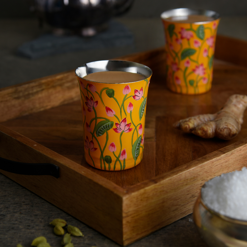 Take a trip down the memory lane when a stainless-steel glass of chilled water or sherbet would cool you down on a hot day. Elevate that feeling with our enameled stainless steel set of glasses which have been hand-painted by our artisans with motifs inspired from a lotus pond – buds, florals in full bloom and stylized leaves on a base of rich turmeric yellow. Serve your guests water, sherbets and mocktails in these stylish glasses.