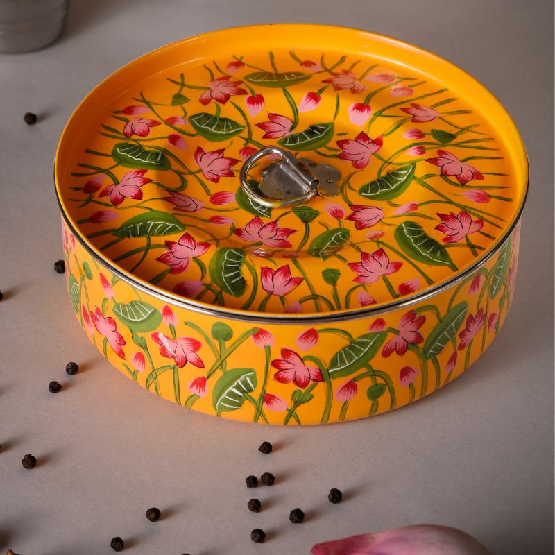 The brightest, most colourful and aromatic essence to Indian cooking, the spices require a special space in your kitchen. Elevate your traditional masala dani with an enameled stainless steel one, hand-painted by master artisans with motifs inspired from a lotus pond – buds, florals in full bloom and stylized leaves on a base of rich turmeric yellow.