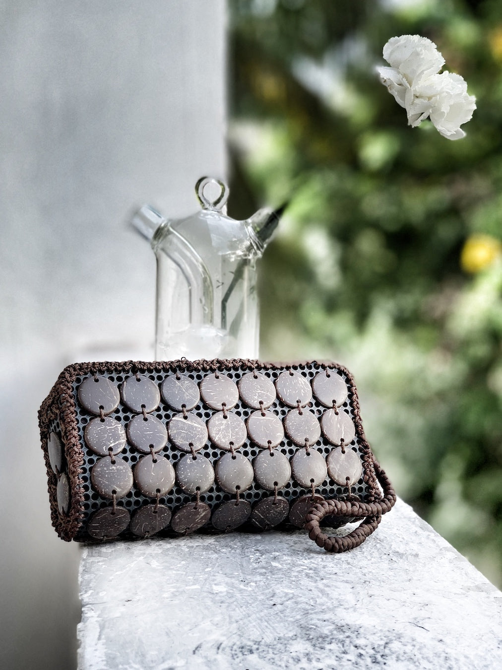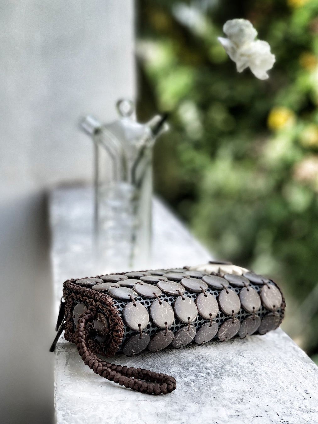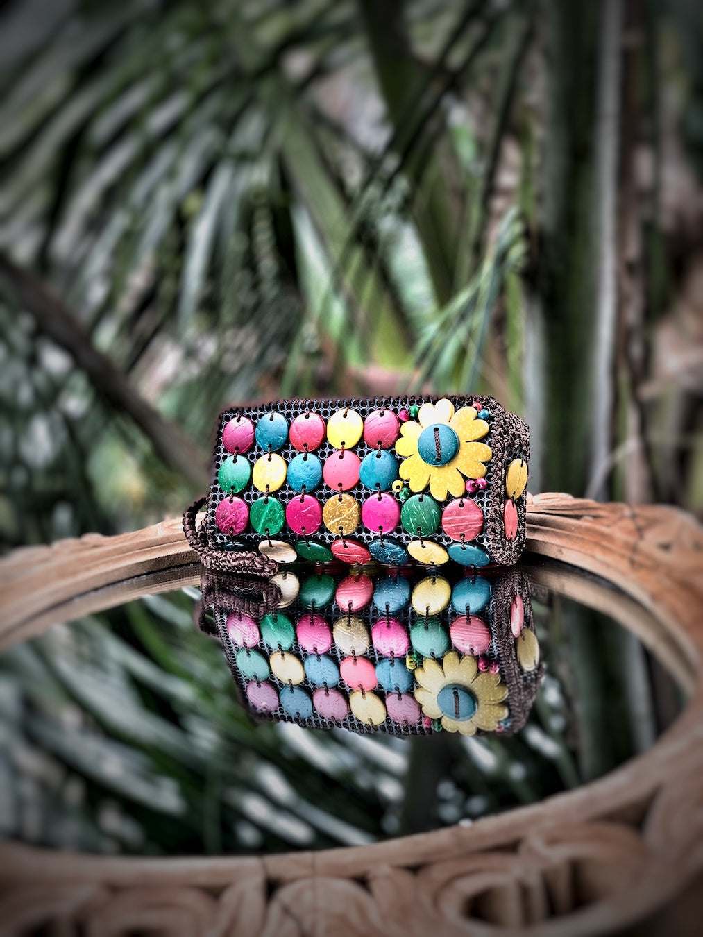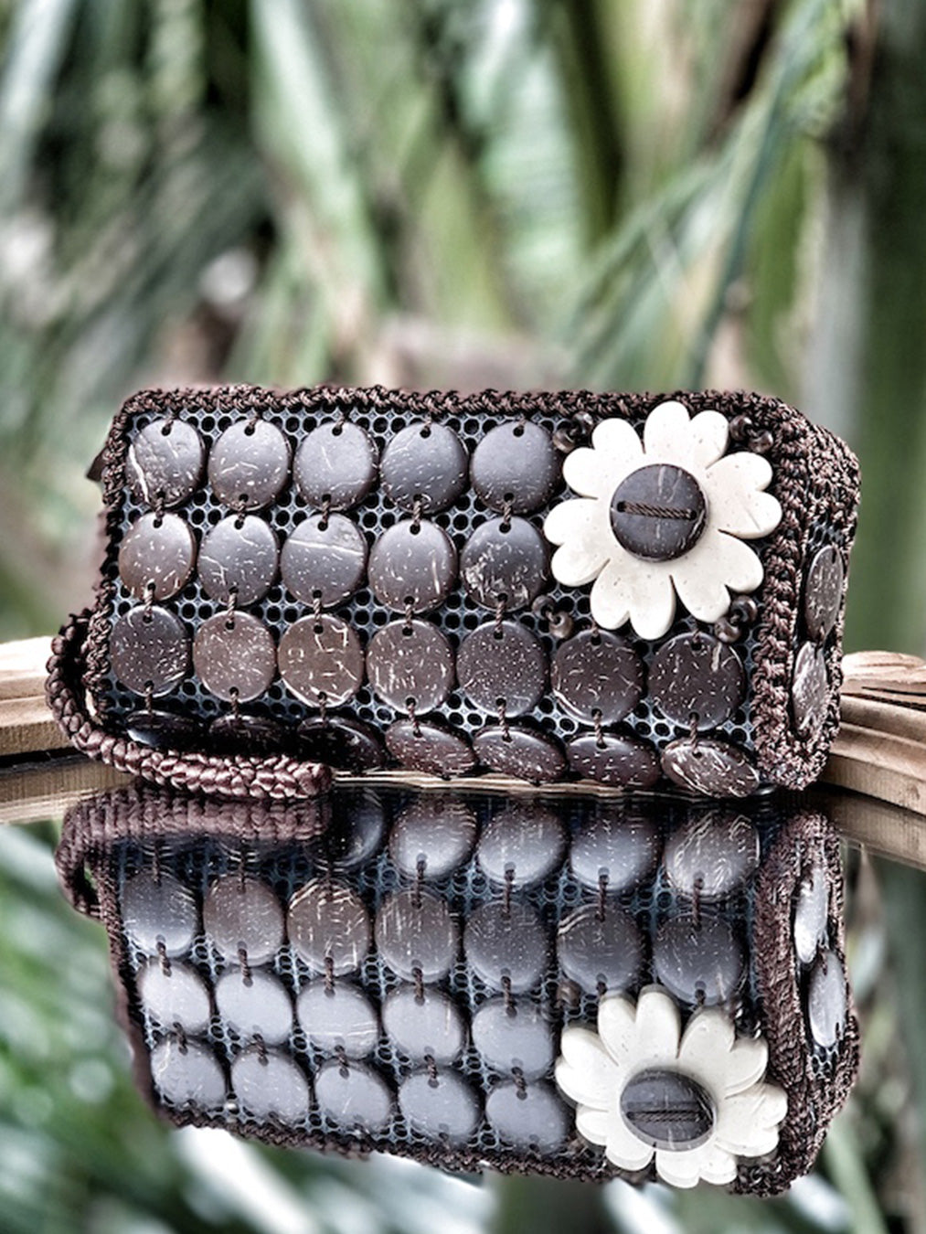 Natural coconut shells beautifully handcrafted into different shapes and sizes... floral motifs, ditsy buttons, discs and cubes. Hand stitched on recycled PU mesh with Korean silk seams and strap.