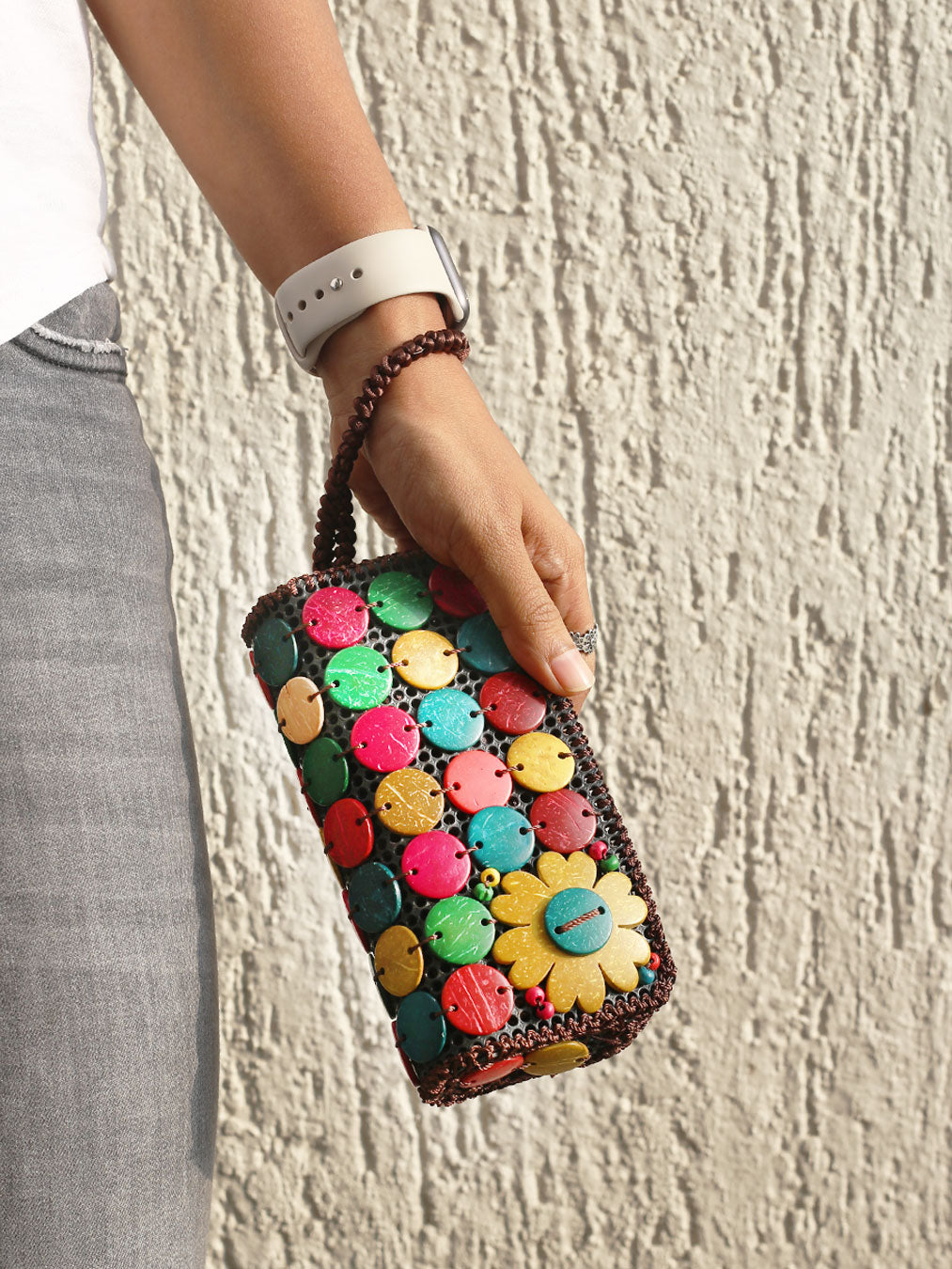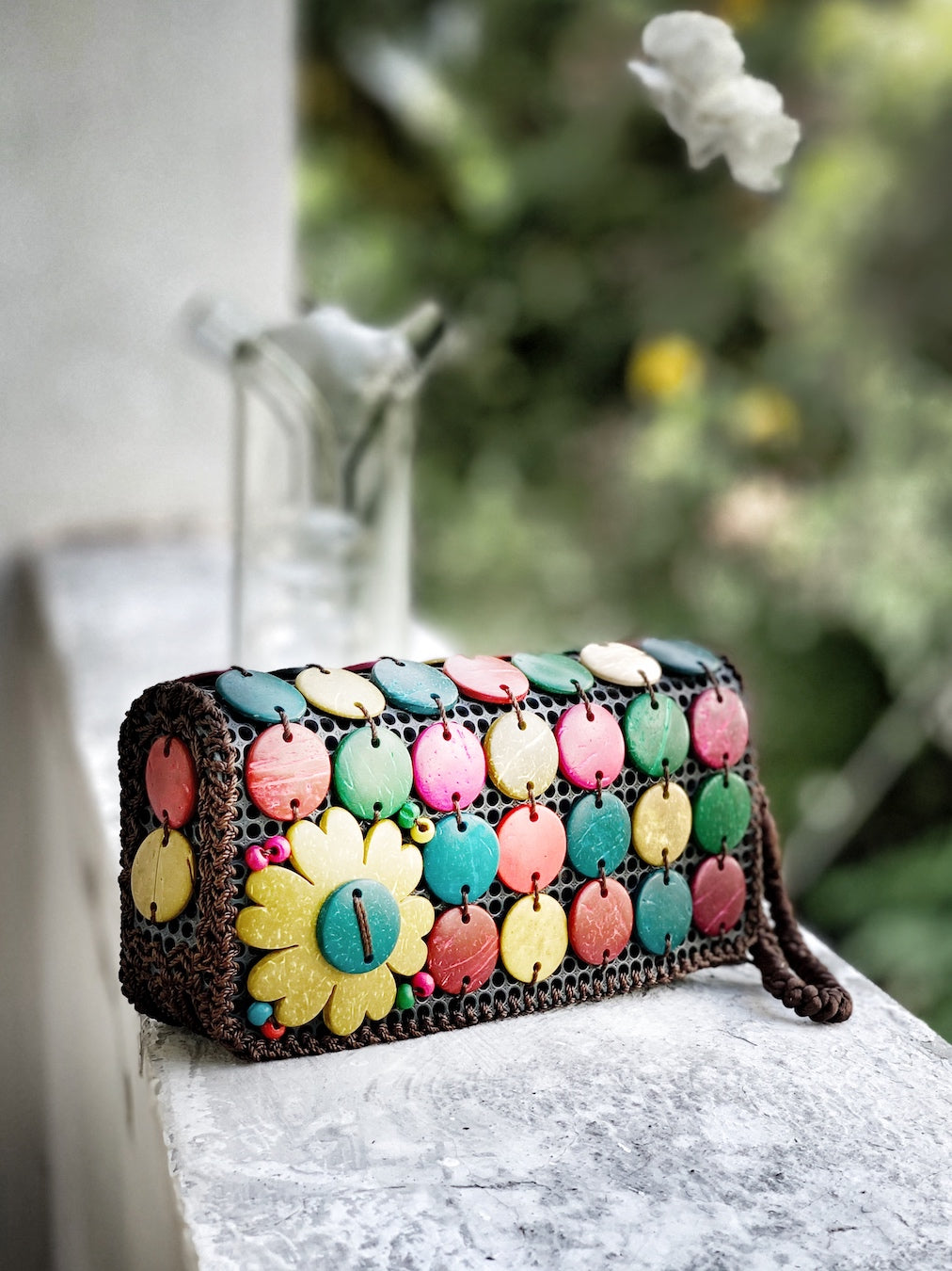 Coconut shells handcrafted into discs and flower motif - for an earthy vibe and a dash of pop colors!