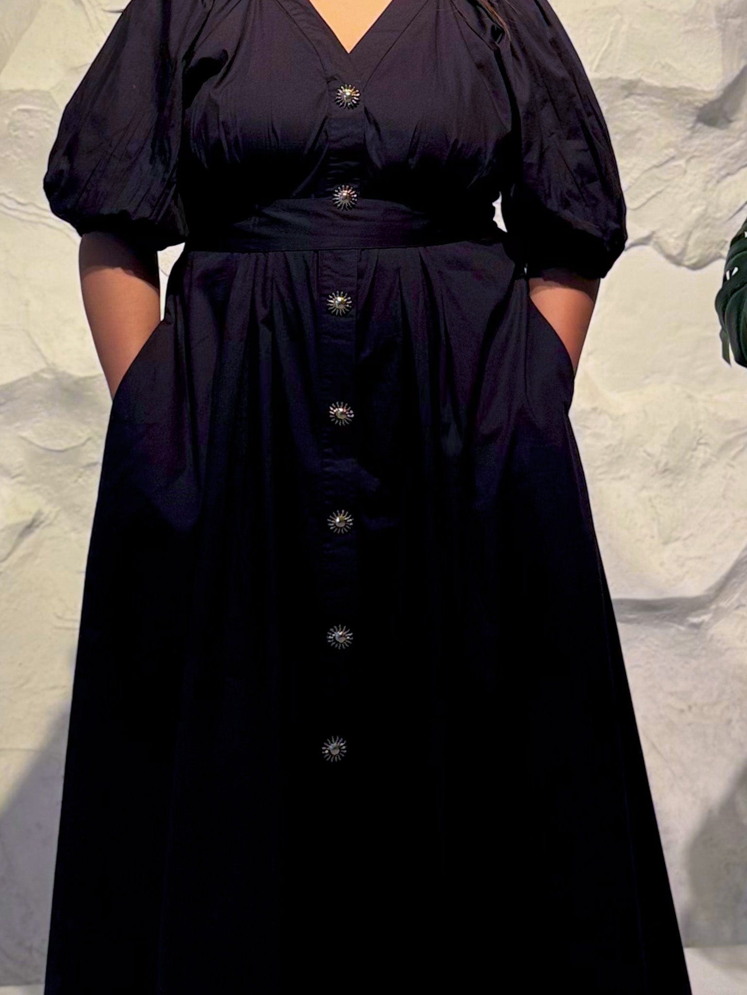 A dreamy cotton-rayon maxi dress featuring romantic puff sleeves, a cinched waist, and a self-tie belt for a flattering silhouette. Finished with sun-shaped gold-plated buttons along the front, it blends soft structure with standout detail—perfect for brunches, celebrations, or elevated everyday style.