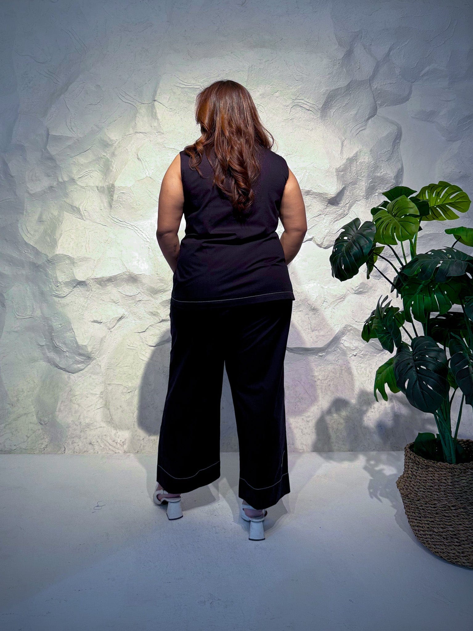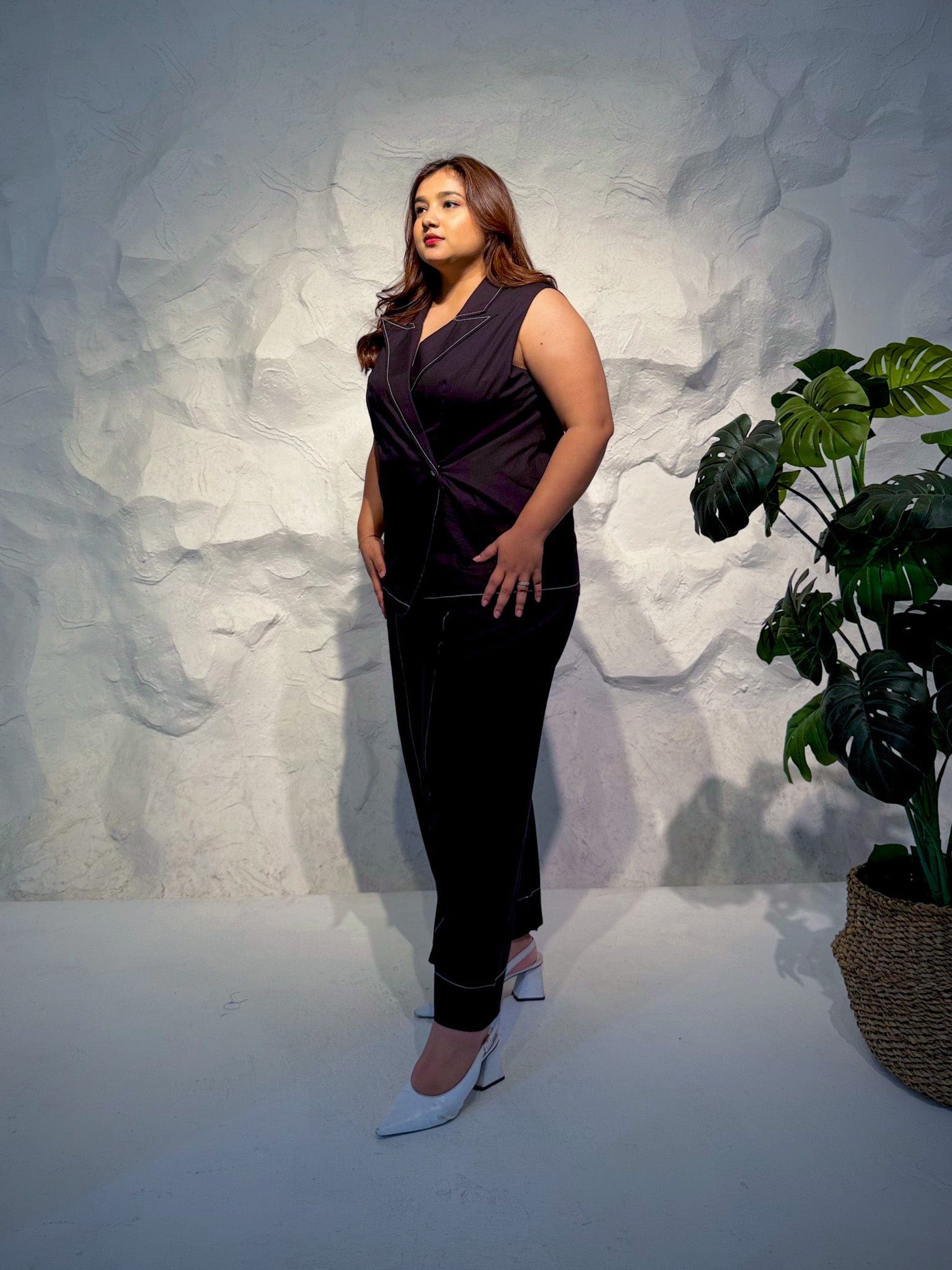 A power-packed co-ord set featuring a long, tailored vest-coat with sharp lapels and gold-plated front buttons, paired with straight-fit pants accented with subtle contrast thread detailing. Designed for the modern boss woman, this set blends structure with statement—perfect for workdays, events, or confident day-to-night transitions.