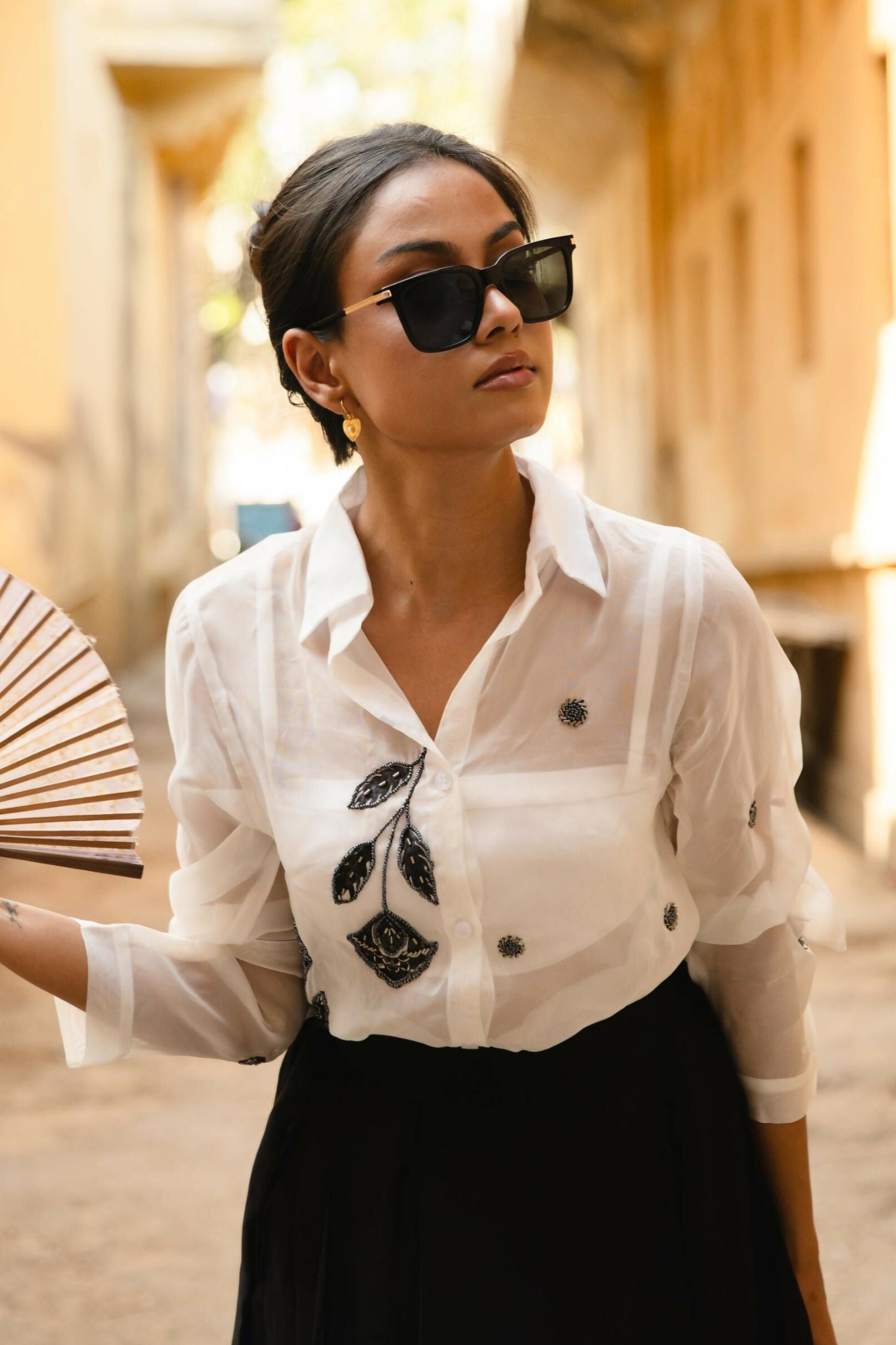 Introducing the Luna Organza White Hand-Painted Shirt made from exceptionally soft organza, this exquisite white shirt features intricate hand-painted designs and delicate hand-embroidered accents. Perfect for adding a touch of elegance and artistry to any wardrobe.
