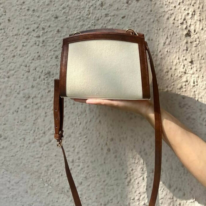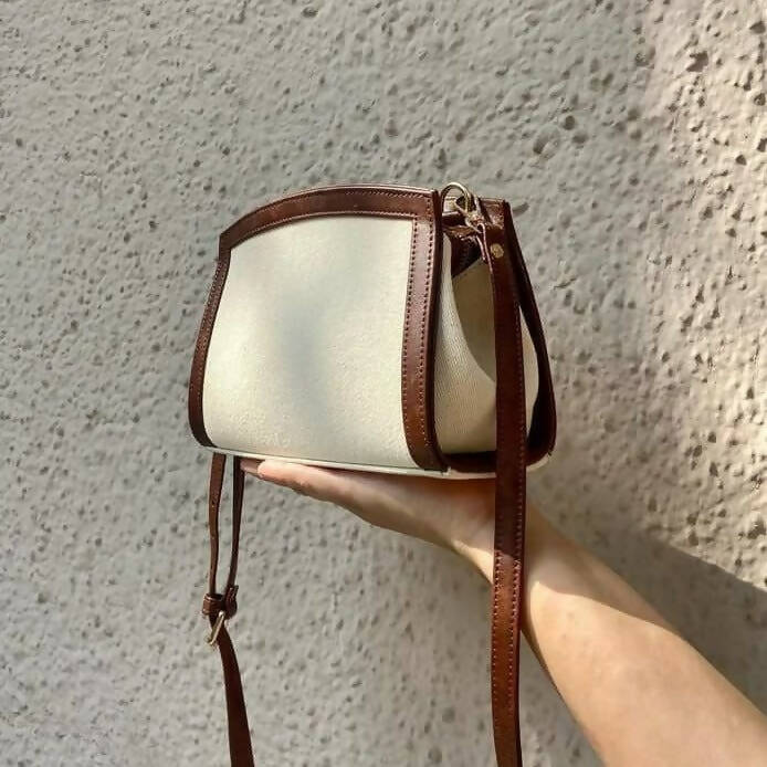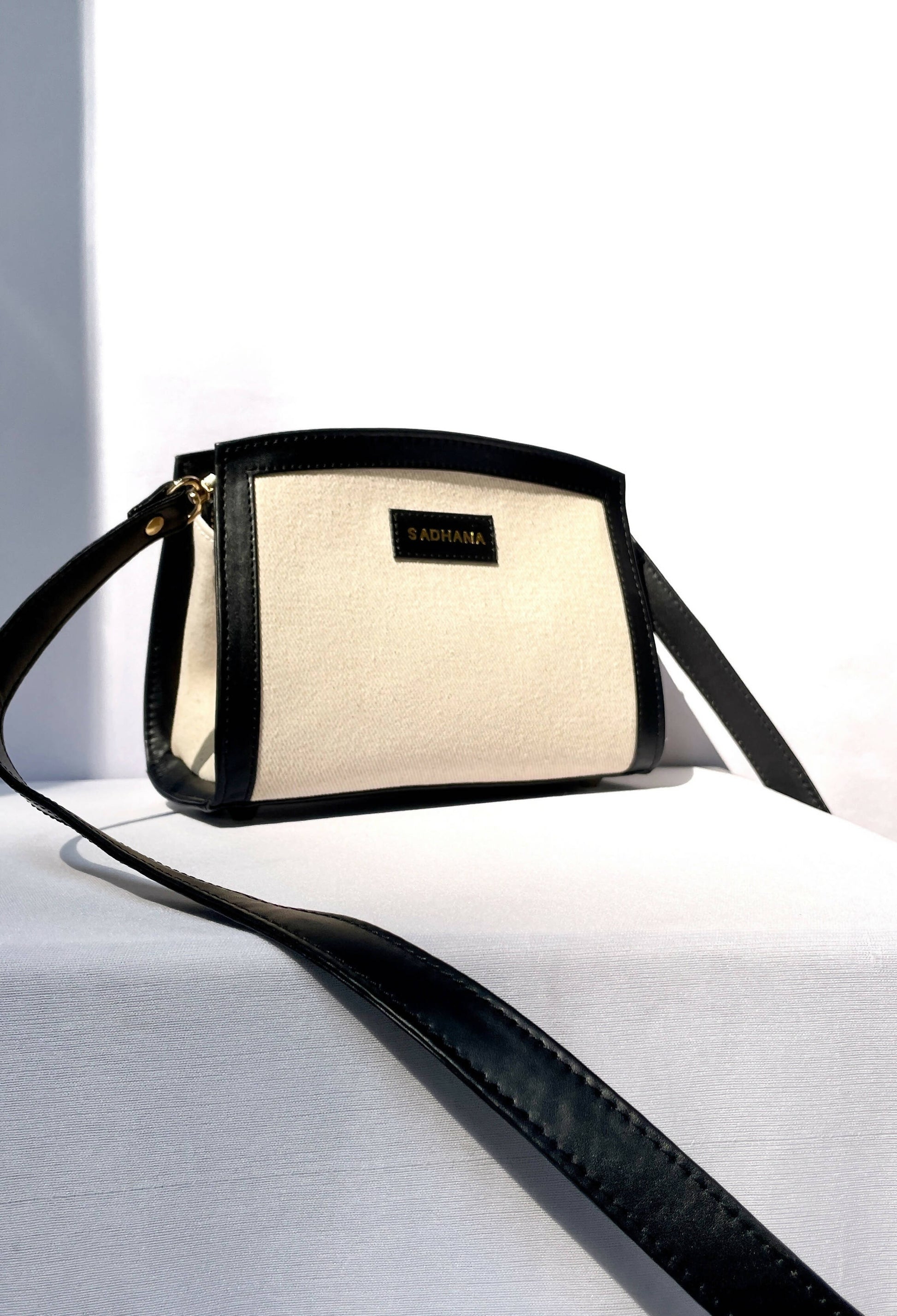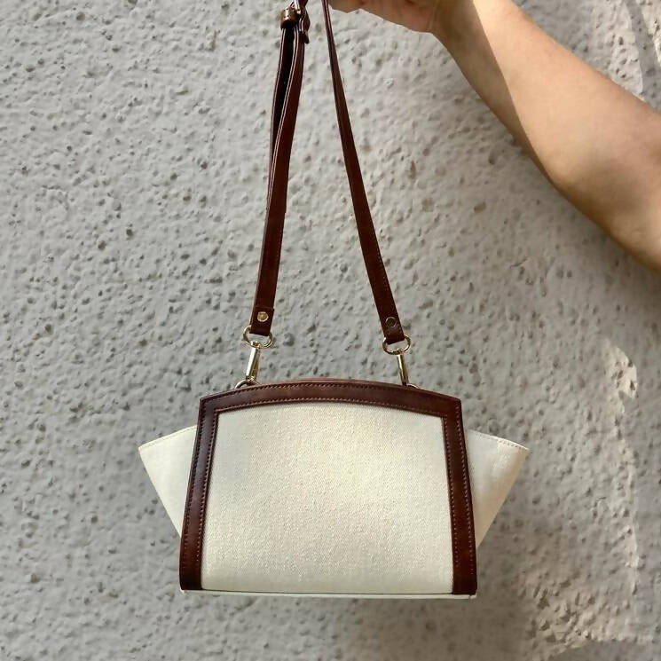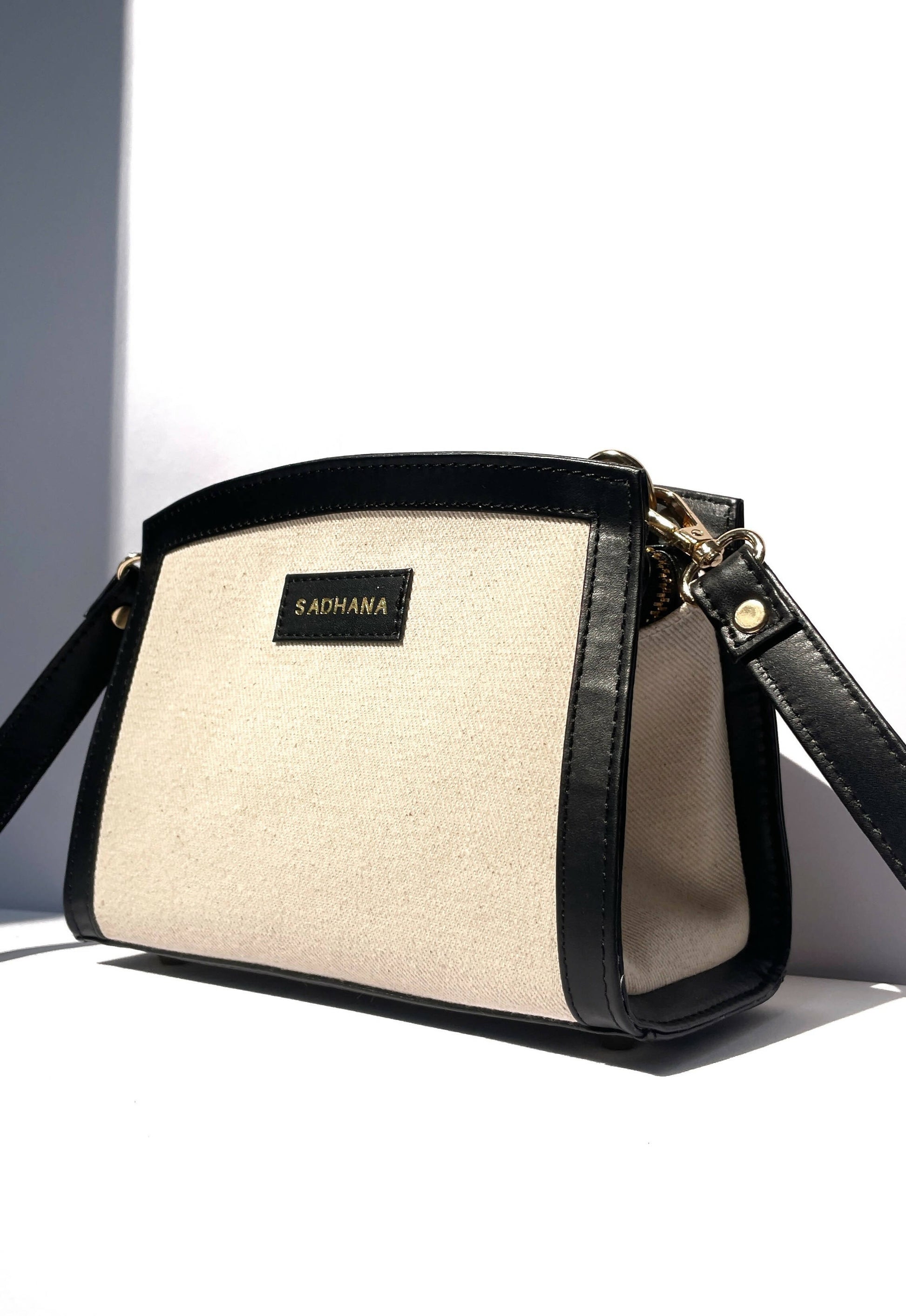 It's a sling bag made of faux leather and canvas combination. Suitable for all everyday essentials.
