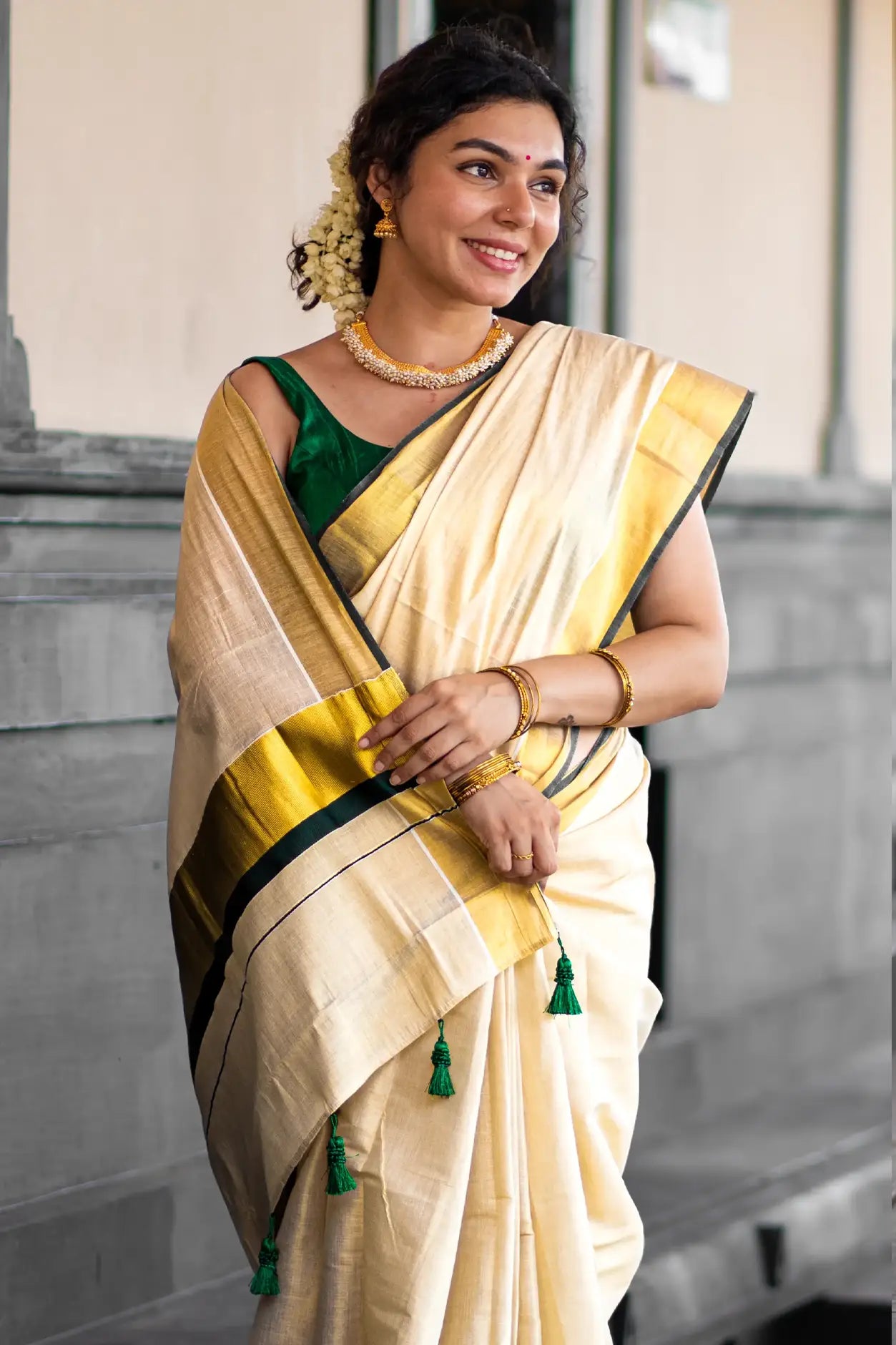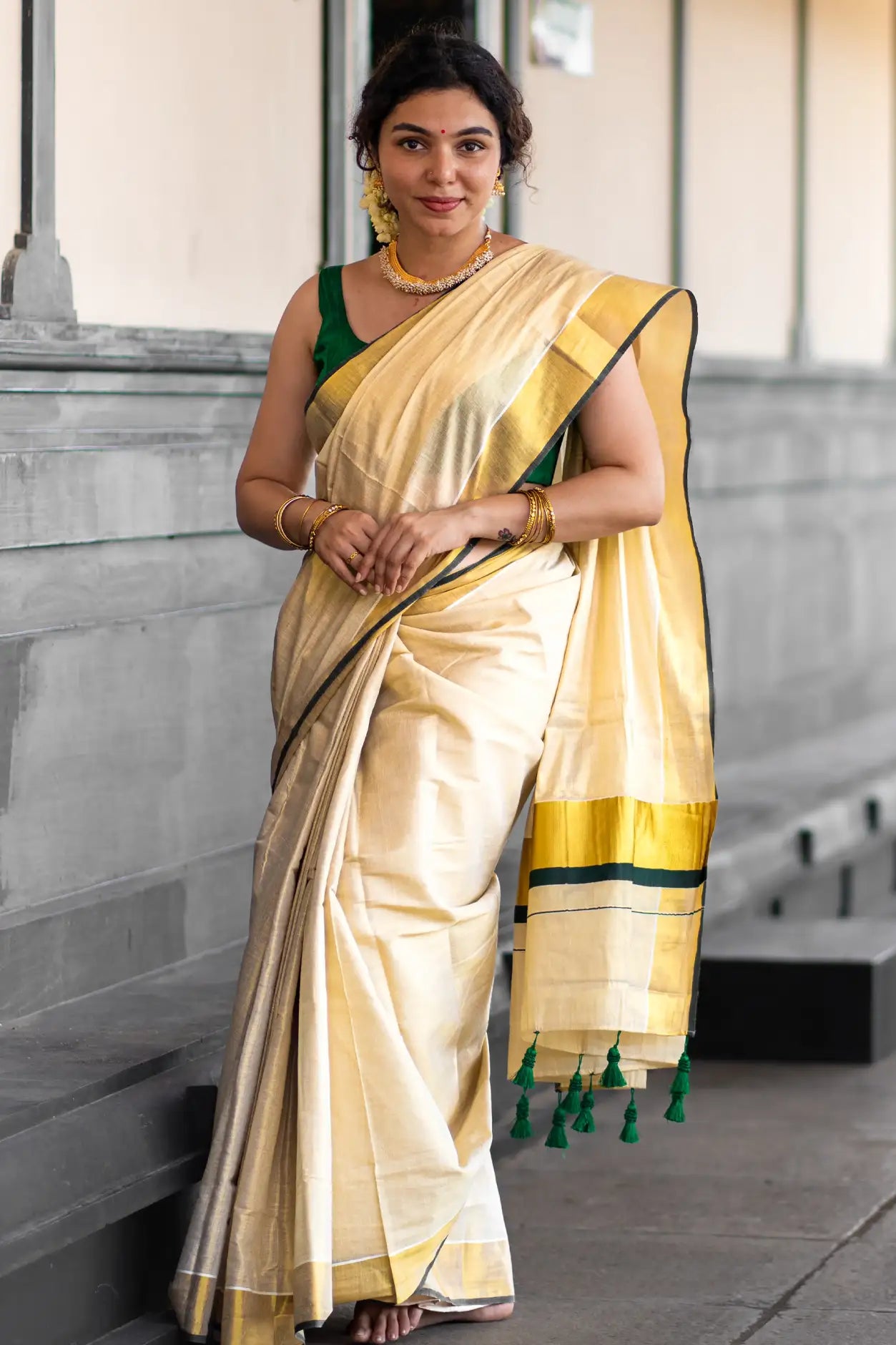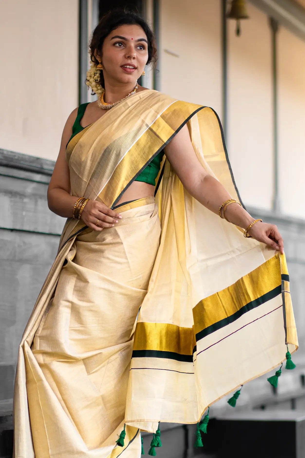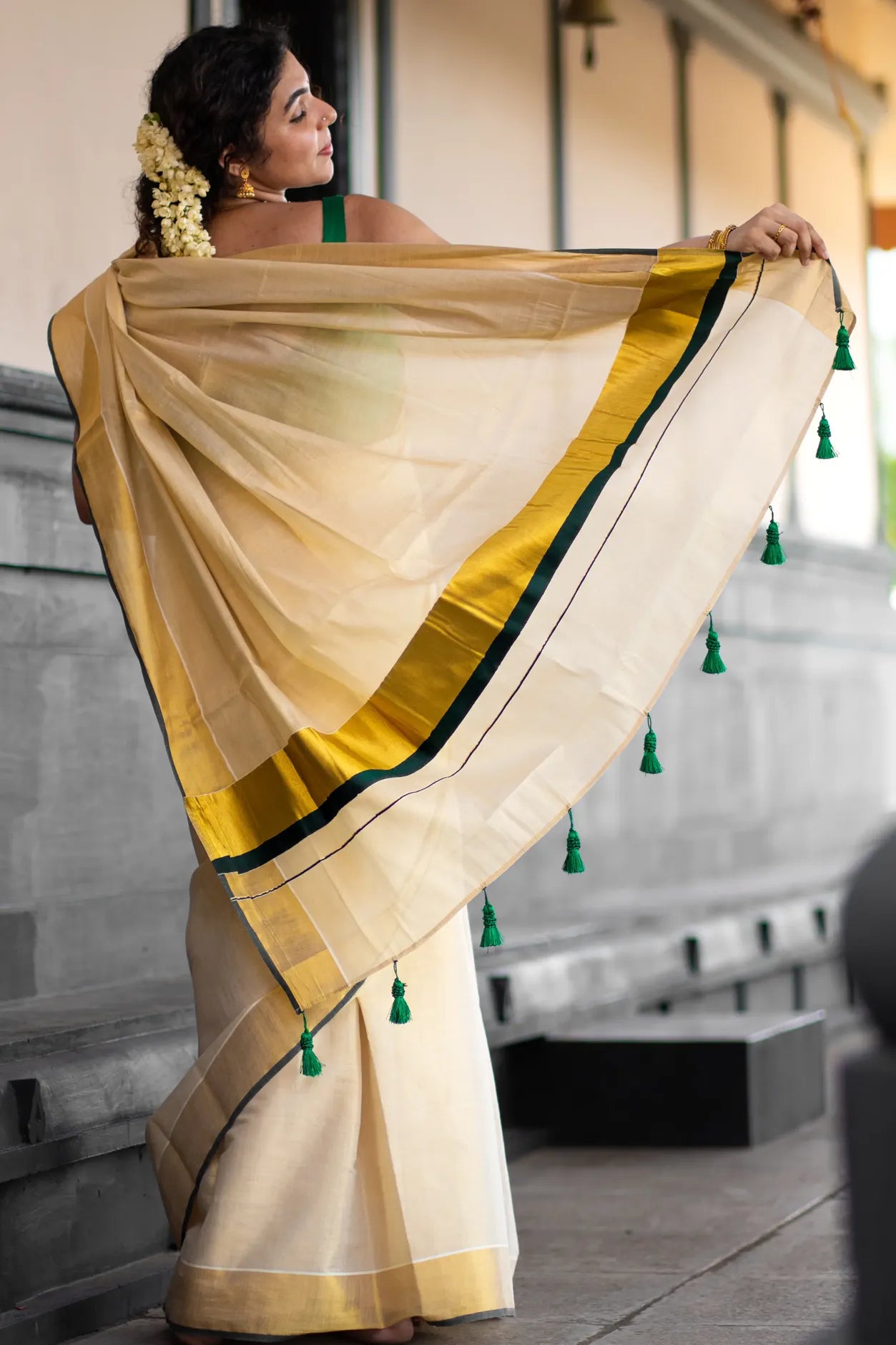 Introducing the classic Kerala Saree - hand-loomed with pure tissue fabric, boasting green & golden zari at the border. The chic hanging tassels at the Pallu add that modern touch. Searching for a traditional kasavu saree? Look no further! Elevate your cultural style with our premium quality collection. Order now for a sprinkle of tradition at your doorstep, shipping across India on the house!