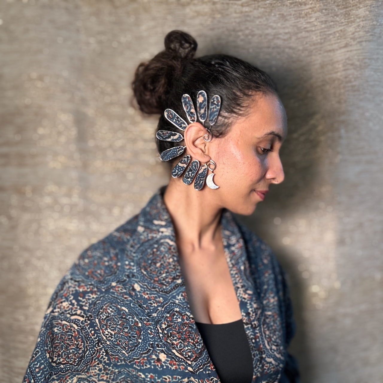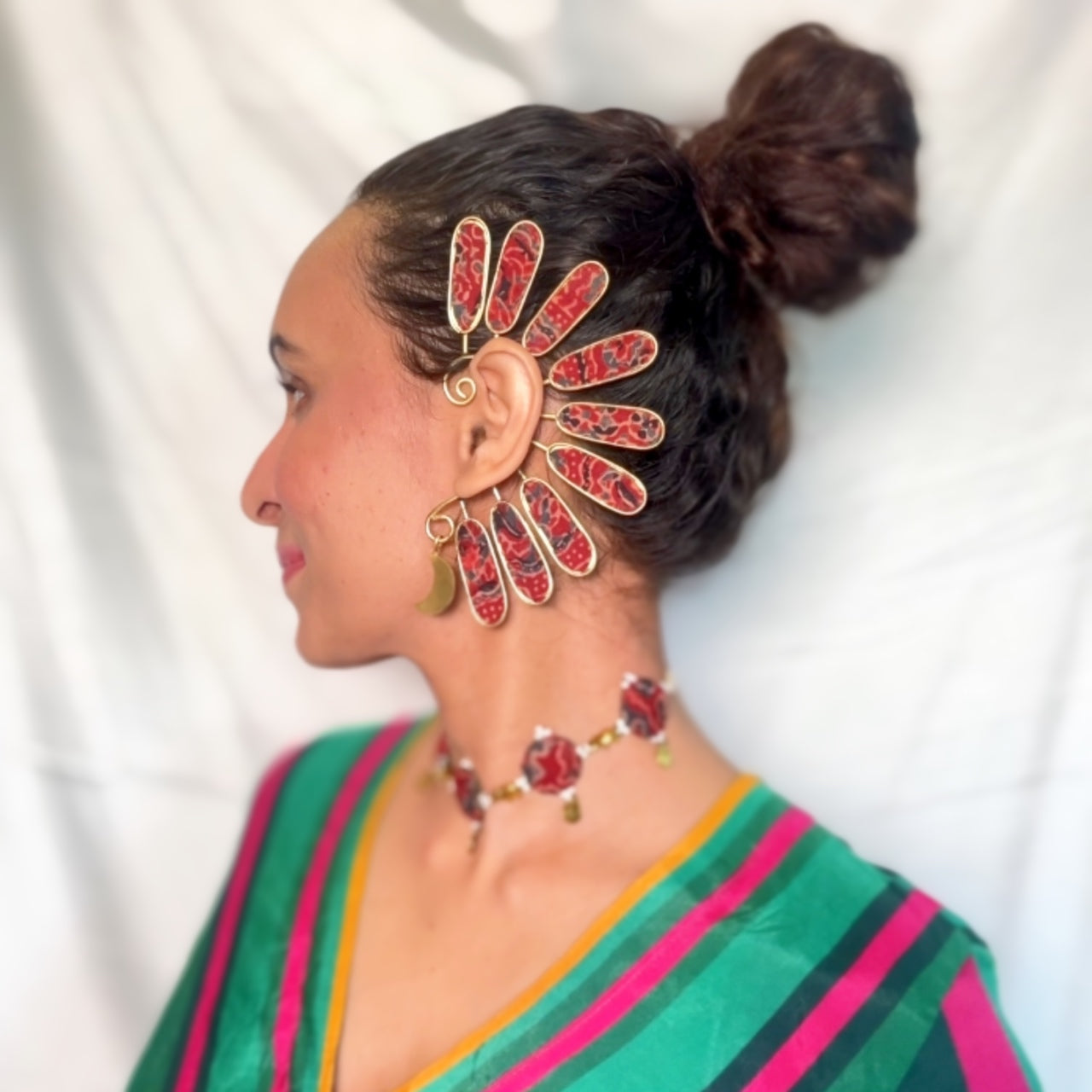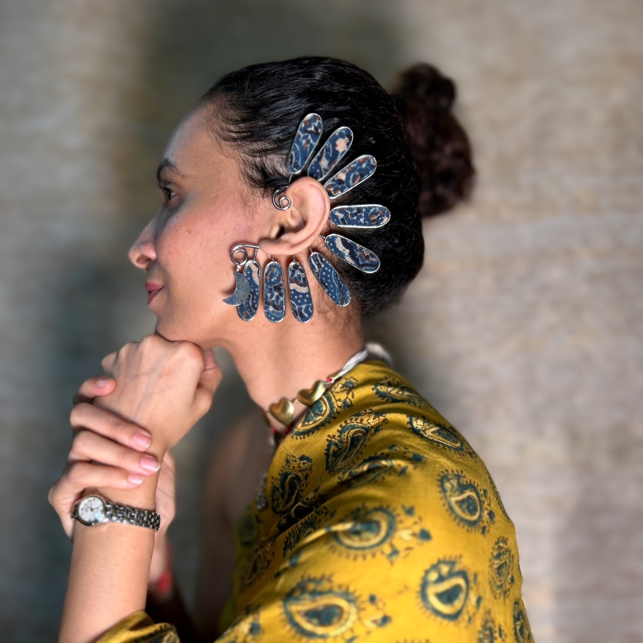 Inspired by the vibrant feathers of the Macaw bird, this stunning ear cuff blends the richness of brass with the intricate beauty of Ajrakh textile. Nature is our muse, and this piece reflects its splendor through the craftsmanship of skilled artisans. A perfect fusion of color, texture, and elegance, this ear cuff brings the beauty of the natural world into your style.