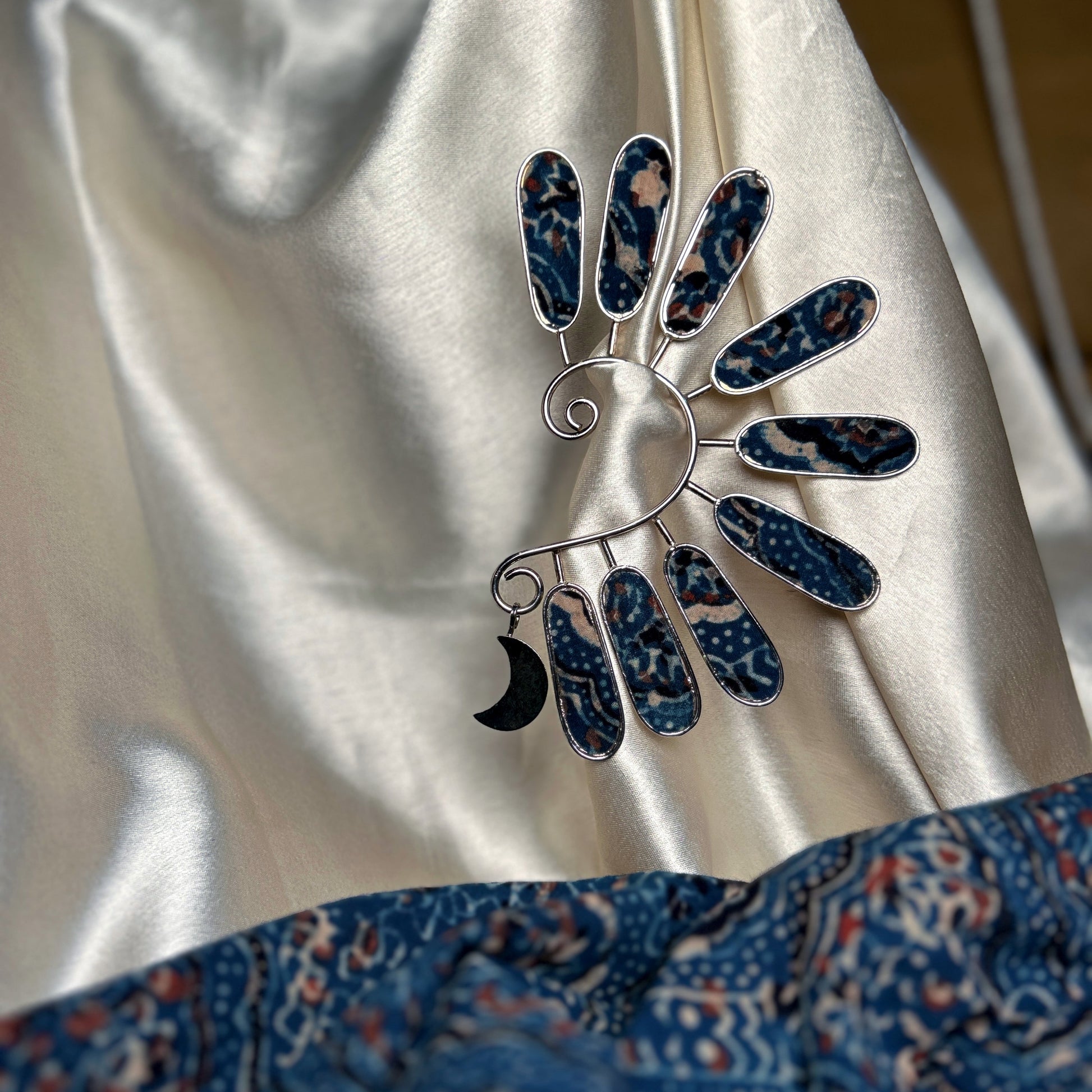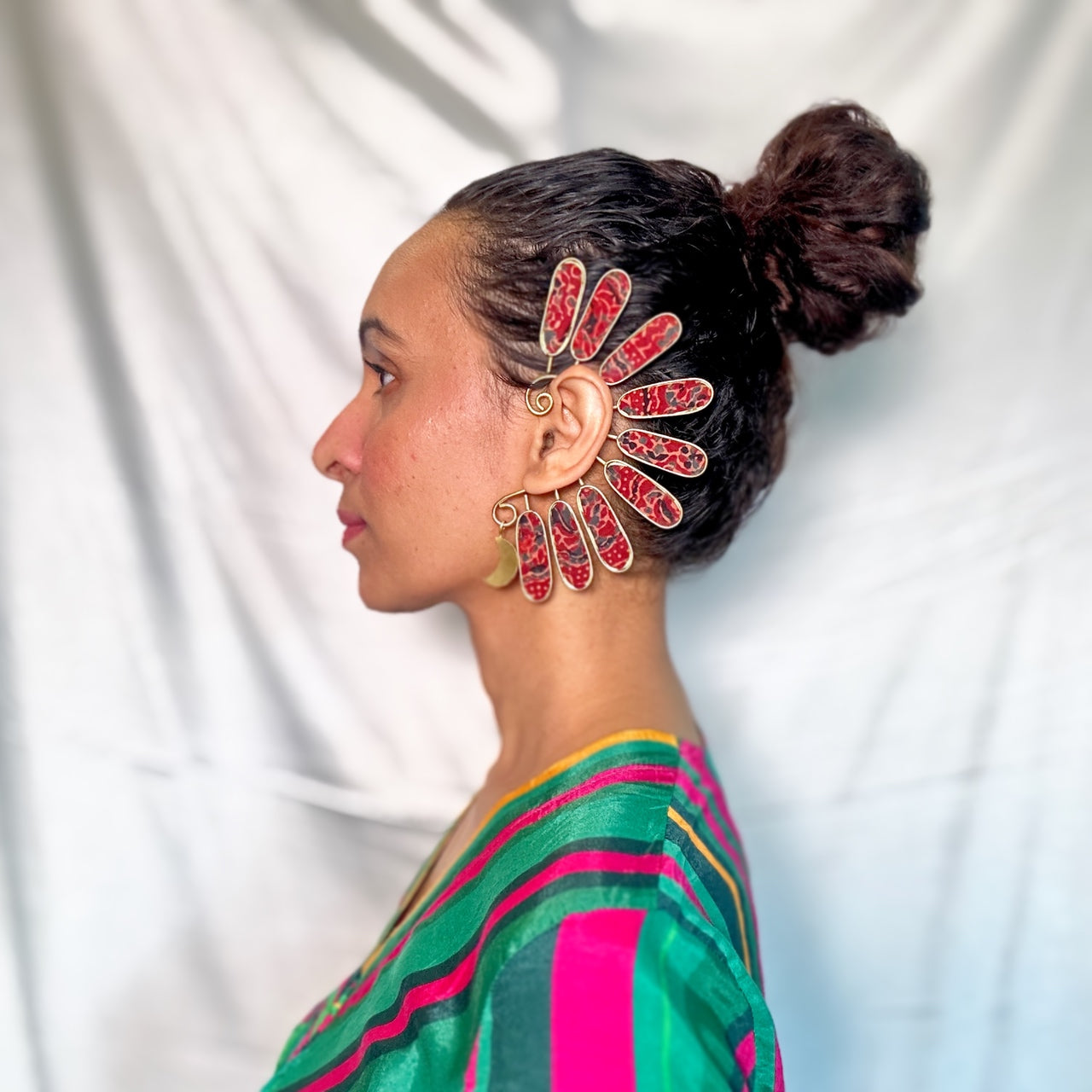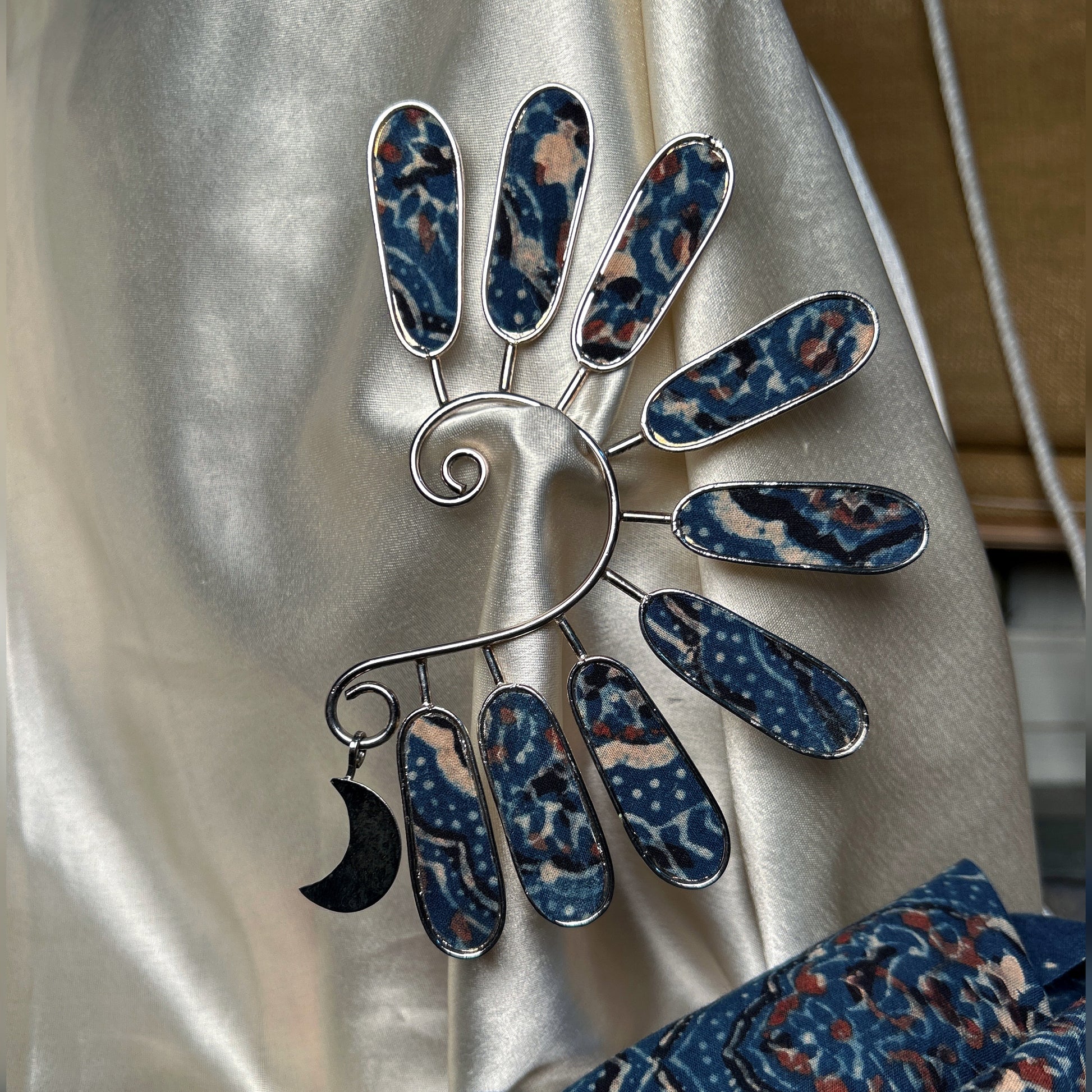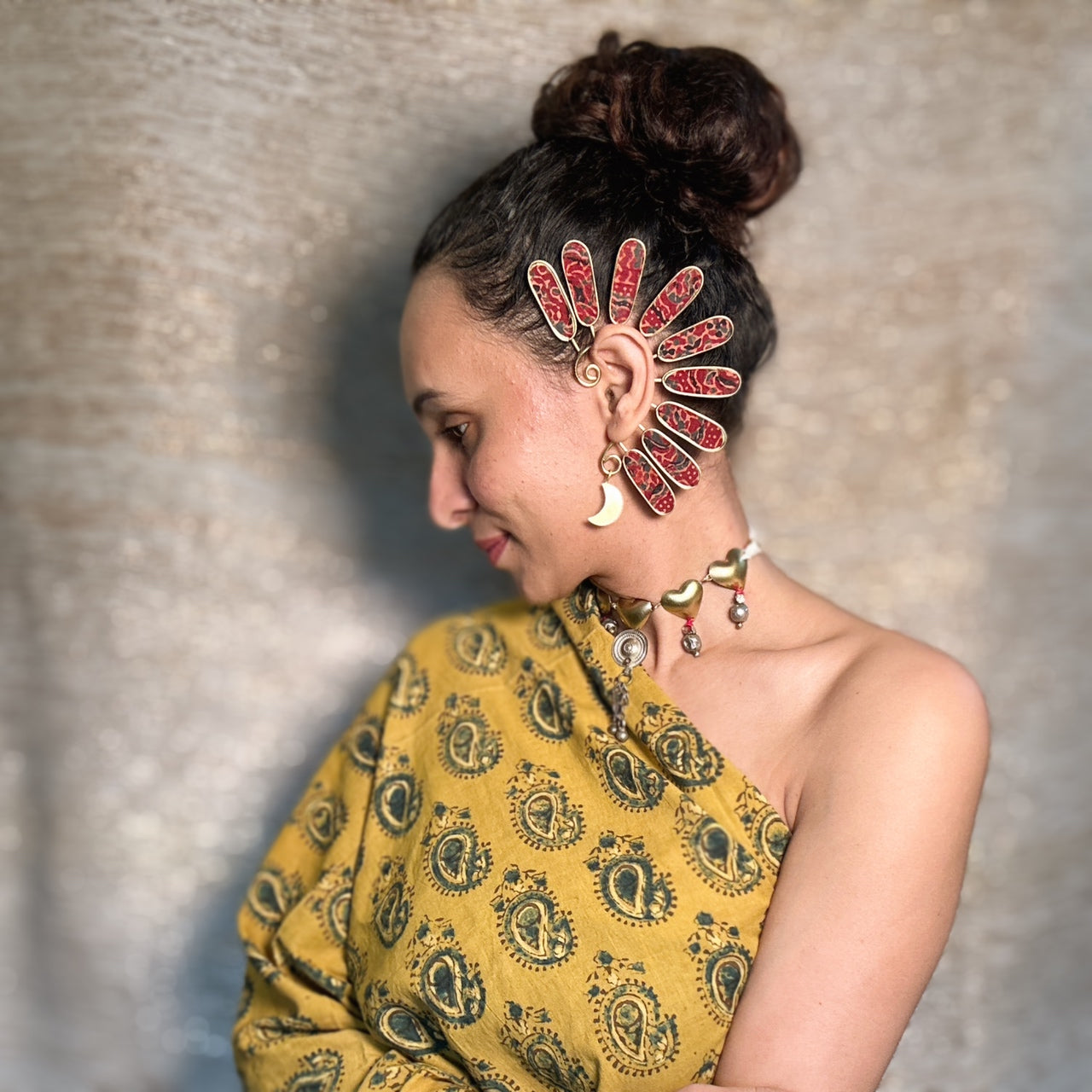 Inspired by the vibrant feathers of the Macaw bird, this stunning ear cuff blends the richness of brass with the intricate beauty of Ajrakh textile. Nature is our muse, and this piece reflects its splendor through the craftsmanship of skilled artisans. A perfect fusion of color, texture, and elegance, this ear cuff brings the beauty of the natural world into your style.