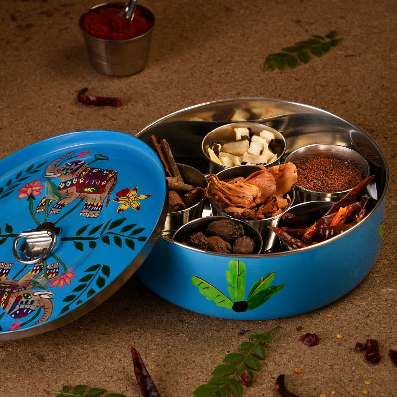 Capturing the essence of traditional Indian kitchens, a masala daani (spice box) in enamelled stainless steel that has six containers inside and a small spoon to store your favourite spices. It is dotted with stylised floral motifs, hand-painted by skilled Kashmiri artisans. Also, a great gifting option for someone who loves cooking.
