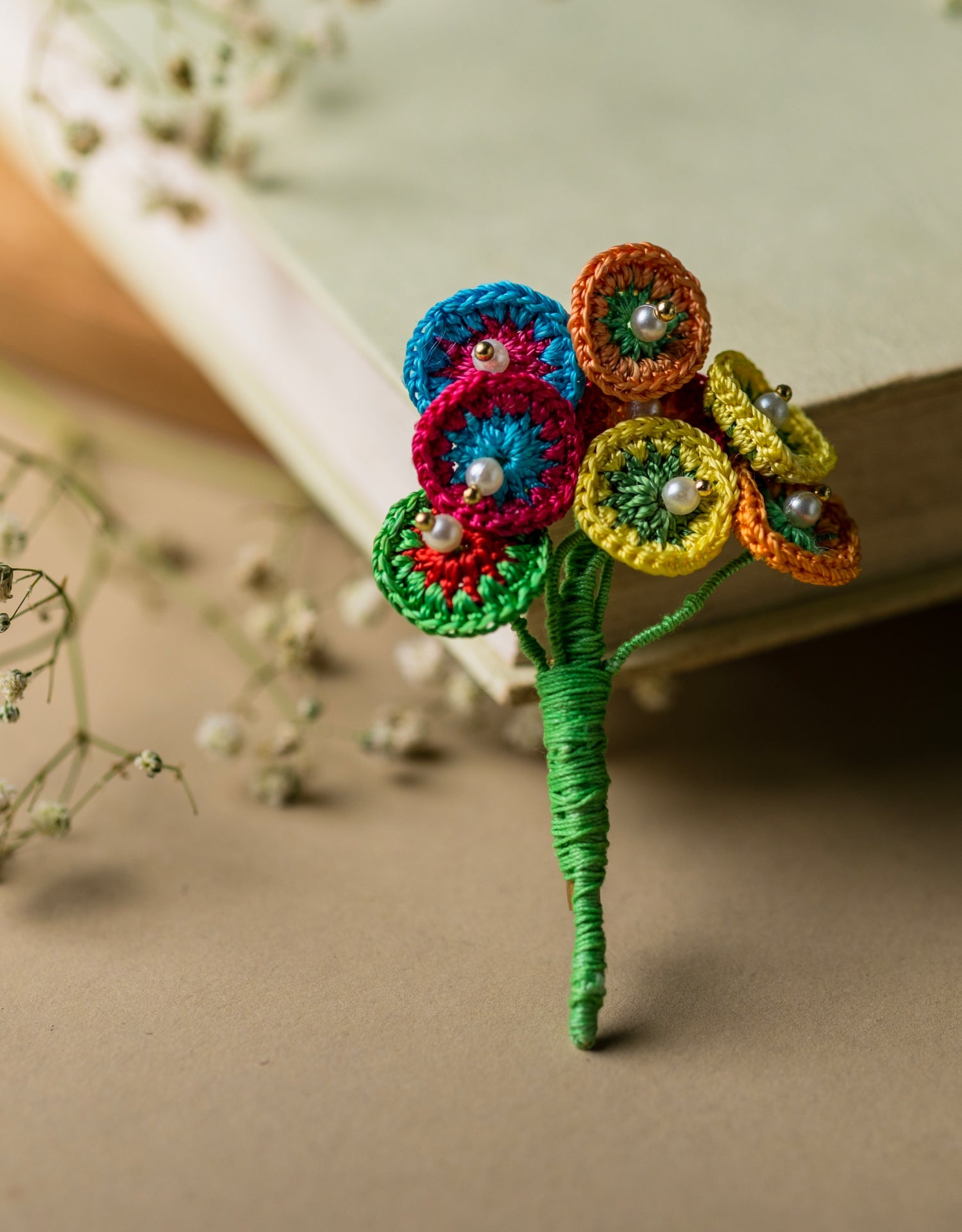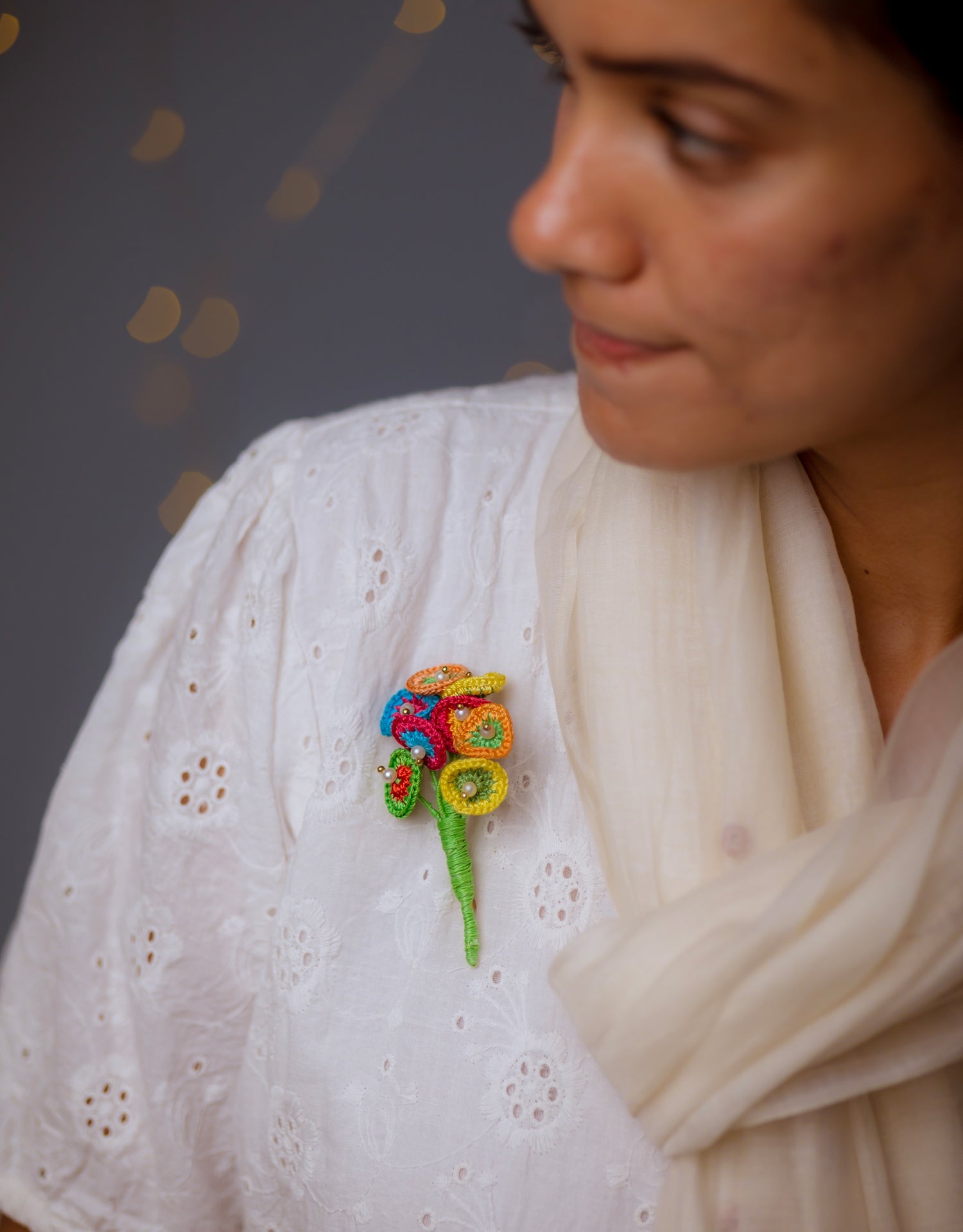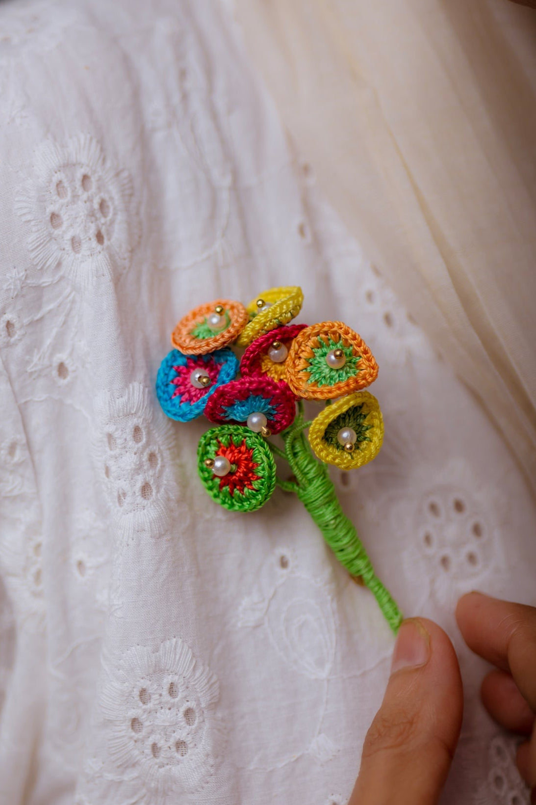 Materials: Viscose thread, Cotton thread, Pearl beads, Brass, Brooch pin