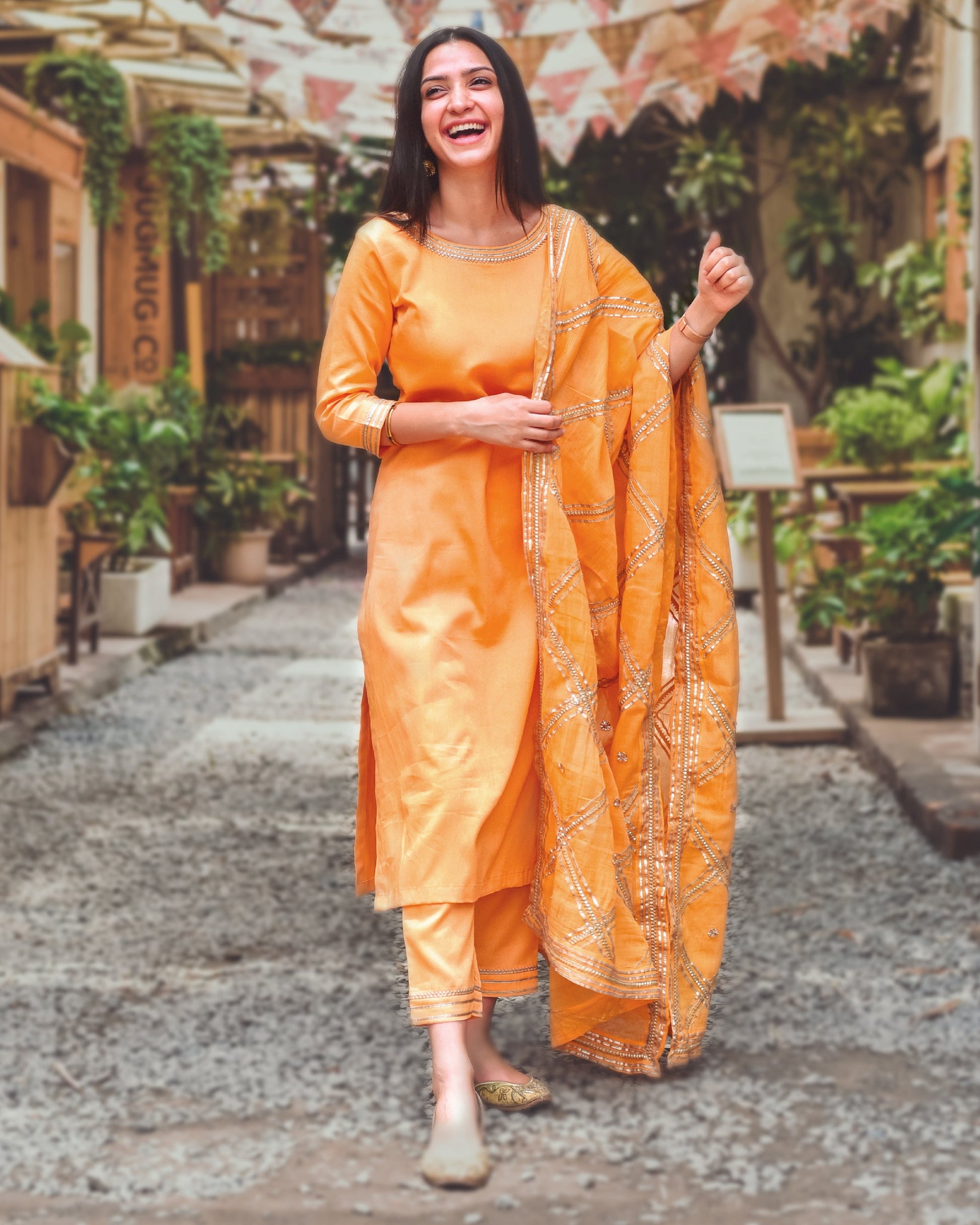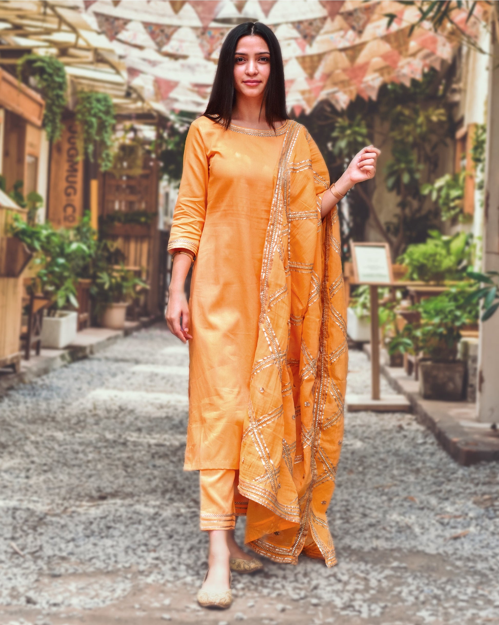 Mango yellow cotton set, with gota detailing on pants, sleeves and around the neck. The set is paired with a cotton dupatta with gota work all over. Style it for a casual event or pair it with heavy jewellery for an intimate gathering!