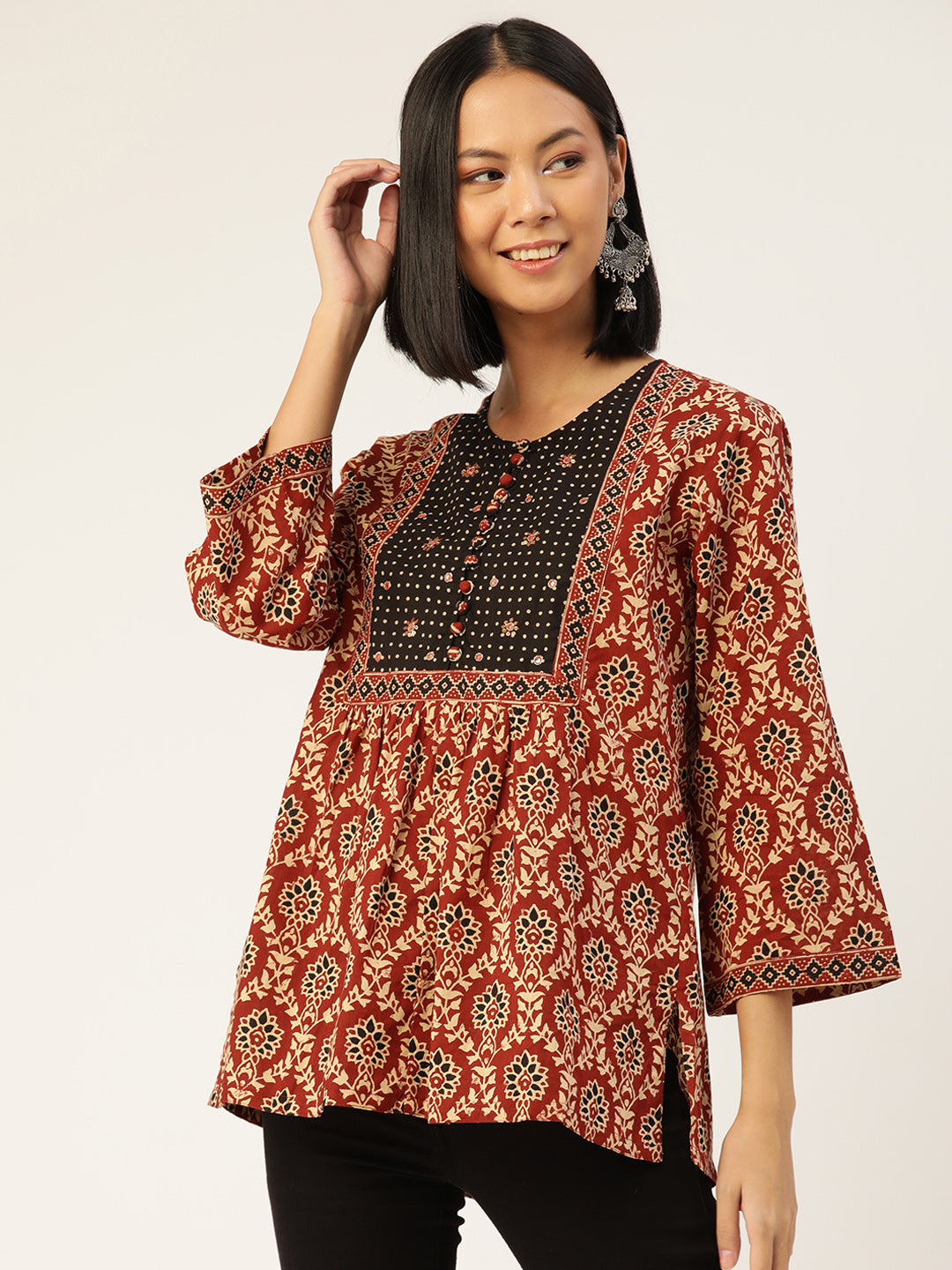 Brighten your wardrobe with this stylish maroon and beige top featuring beautiful ethnic motifs. The round neck and three-quarter regular sleeves provide a comfy fit, while the woven cotton fabric ensures breathability. With a button closure adding a chic touch, this top is perfect for both casual outings and festive occasions!