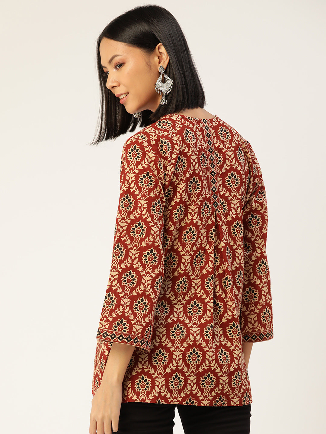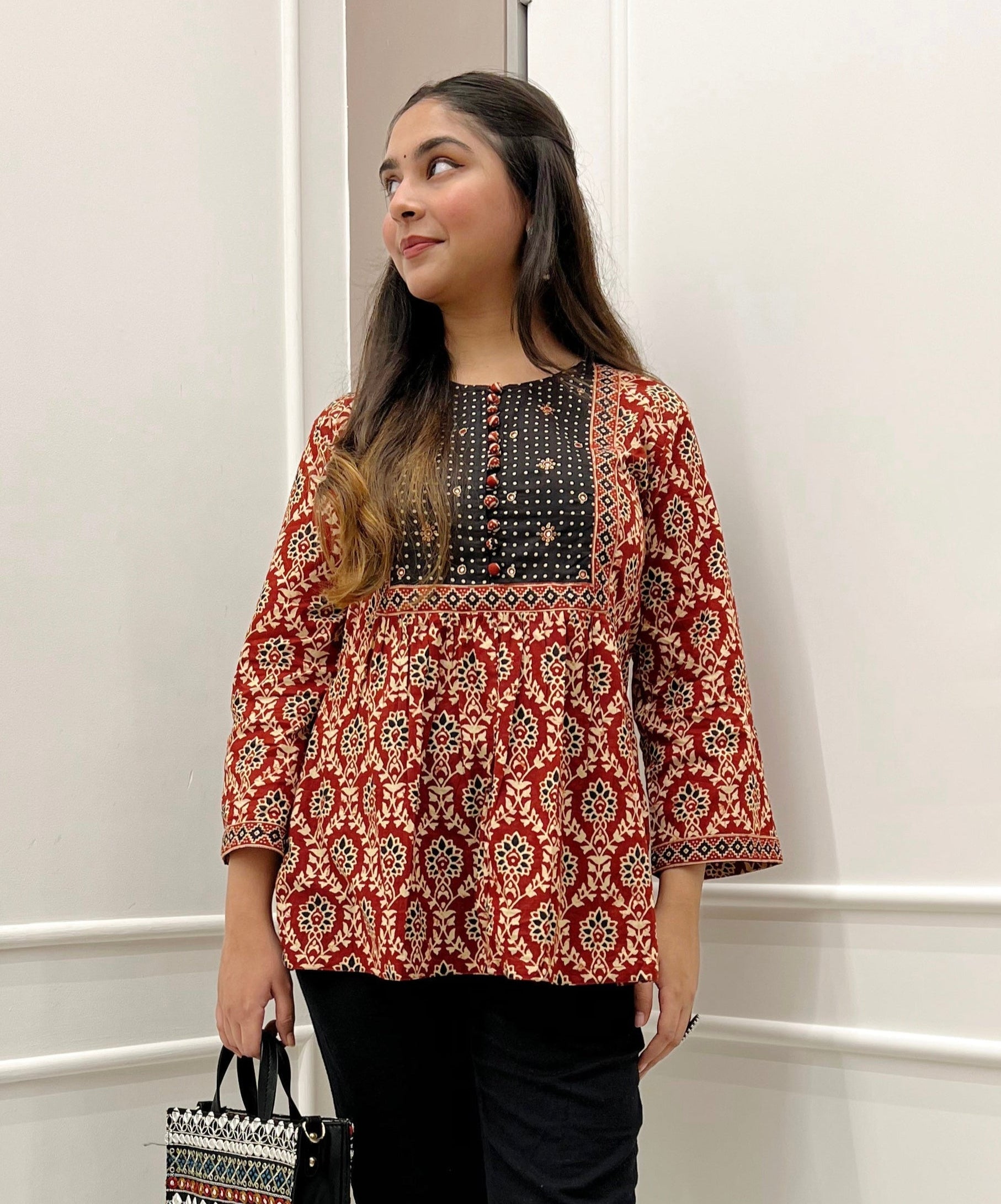 Maroon Cotton Ethnic Hand Block Print A-Line Top