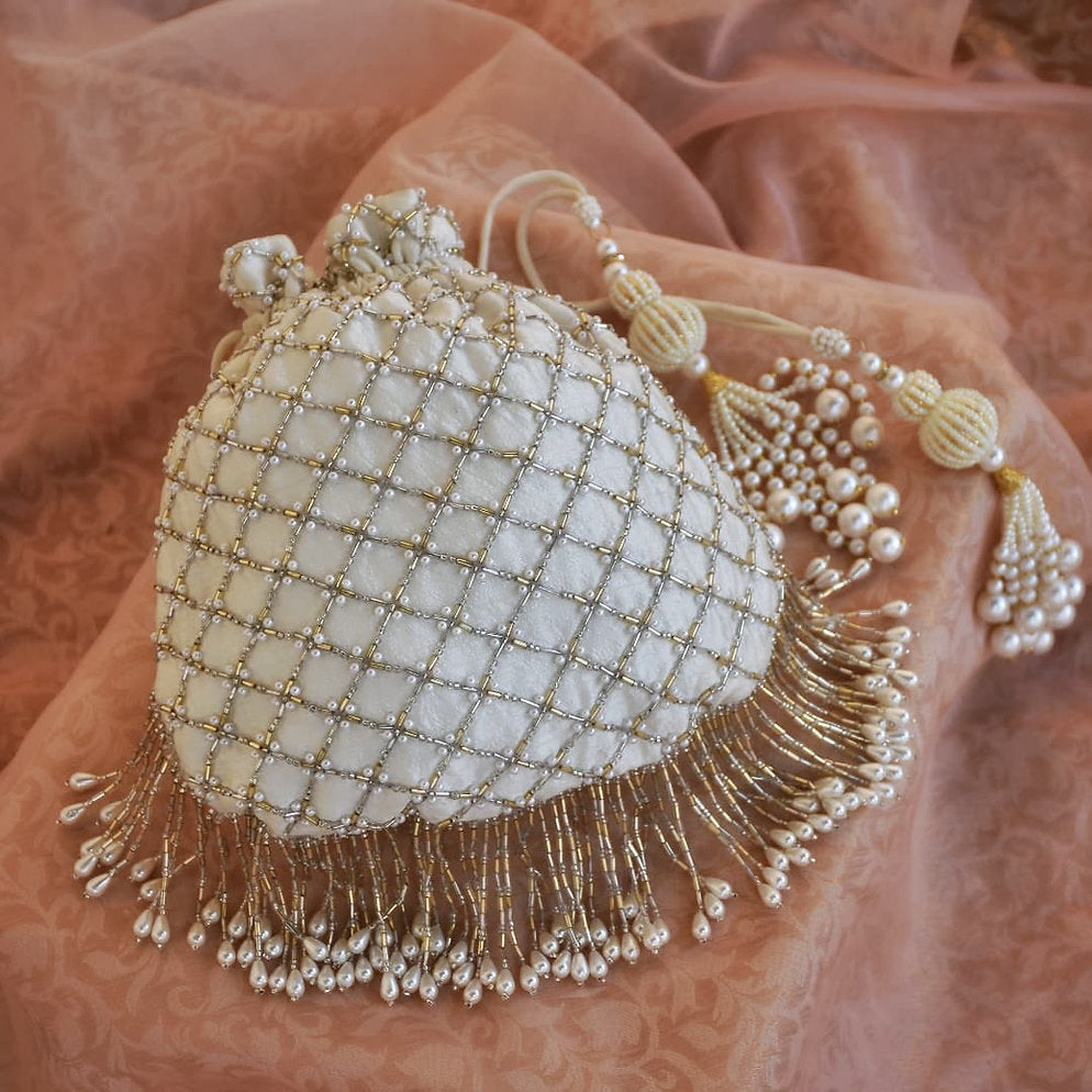Materials: Lustrous off- white raw silk fabric, adorning white pearls and linings of silver and gold katdanas finished with pearl tassels.