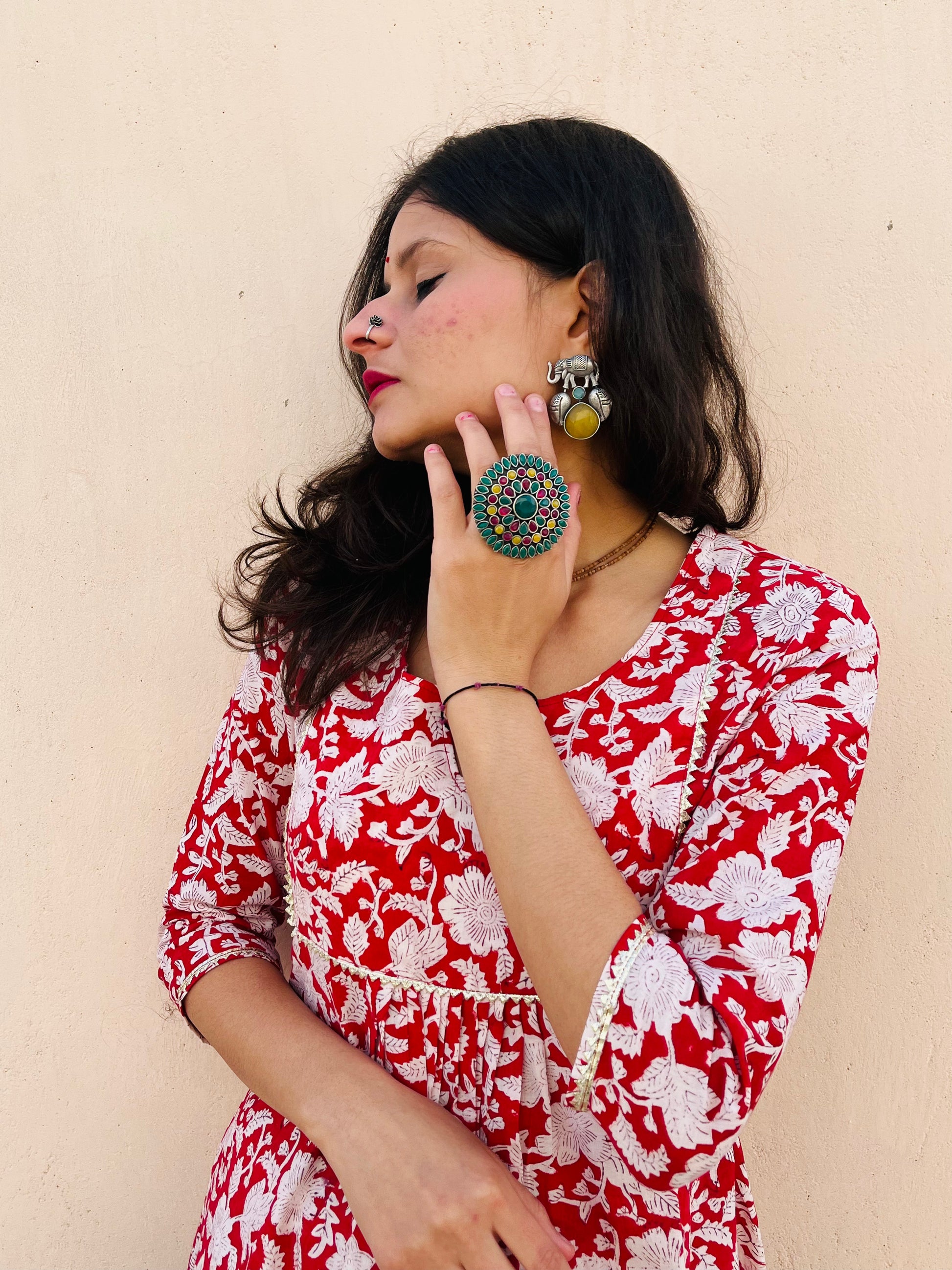 A hand block printed yoke kurta with gota details & comes with a straight fit pants. A perfect fit for those summery days!