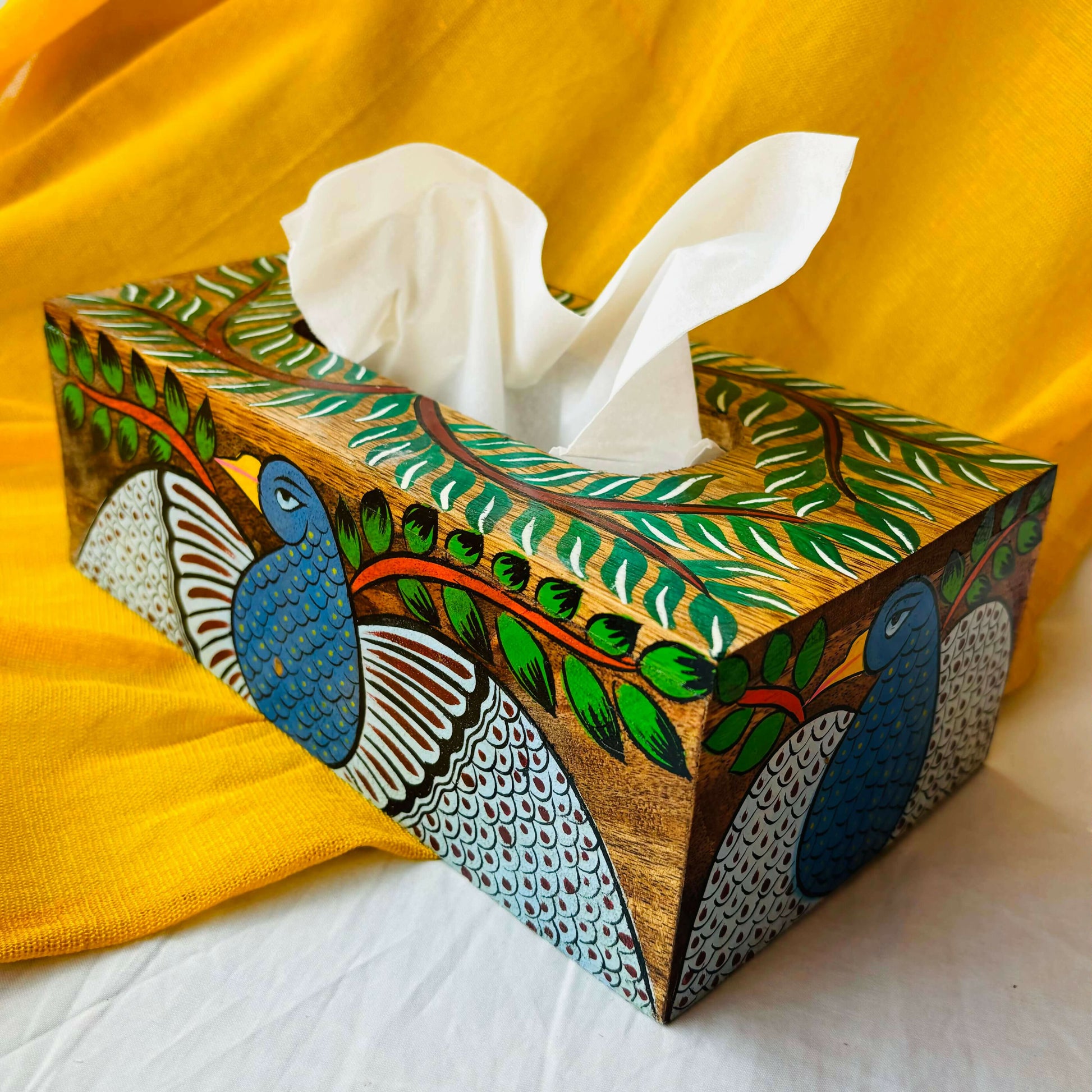 The wooden tissue boxes are meticulous craftsmanship of woodworkers of Saharanpur, India. Carved out from Mango wood, each wooden tissue box passes through the hands of generational artists of Pingla, to get their Pattachitra motifs painted on it.
