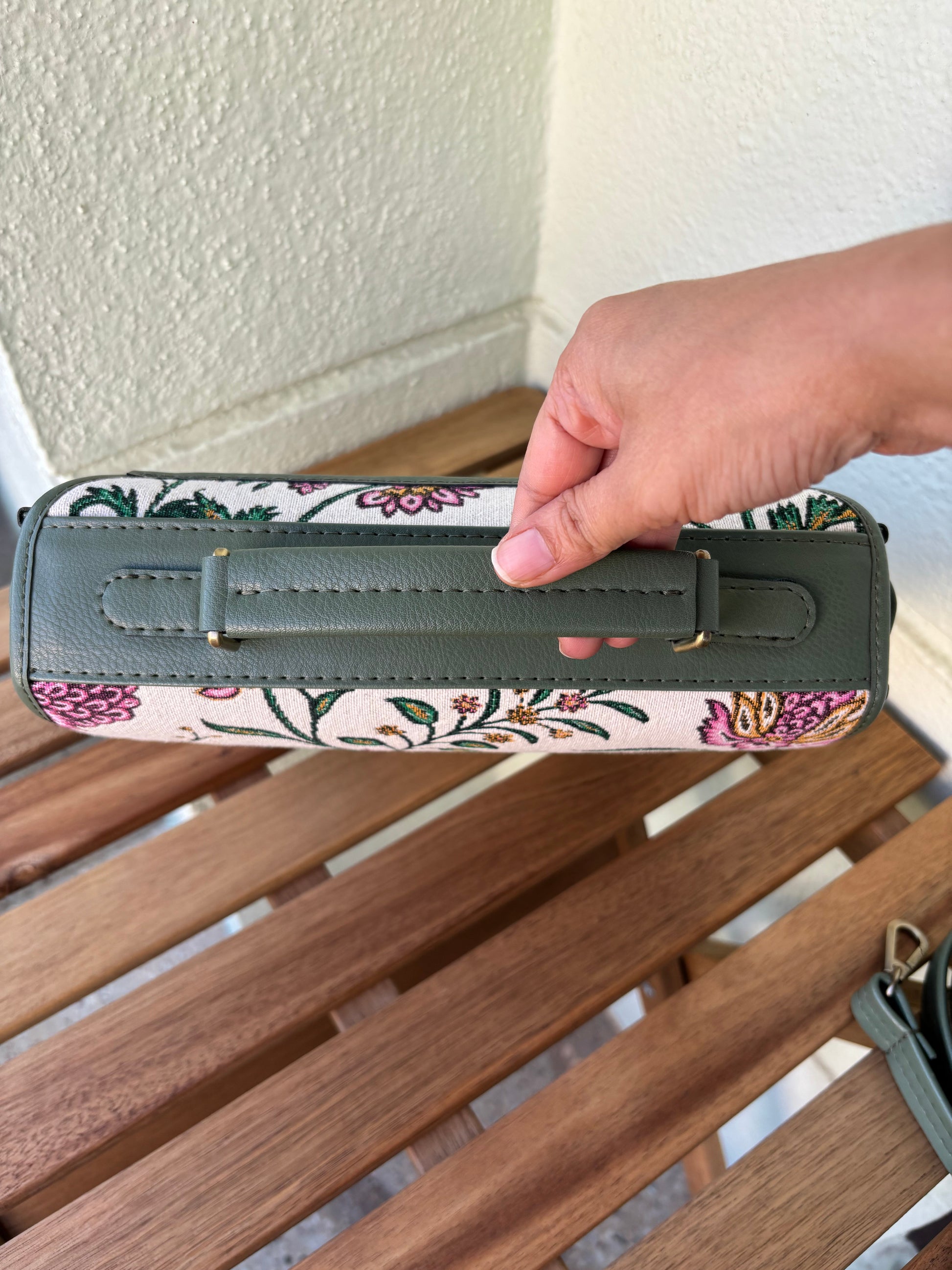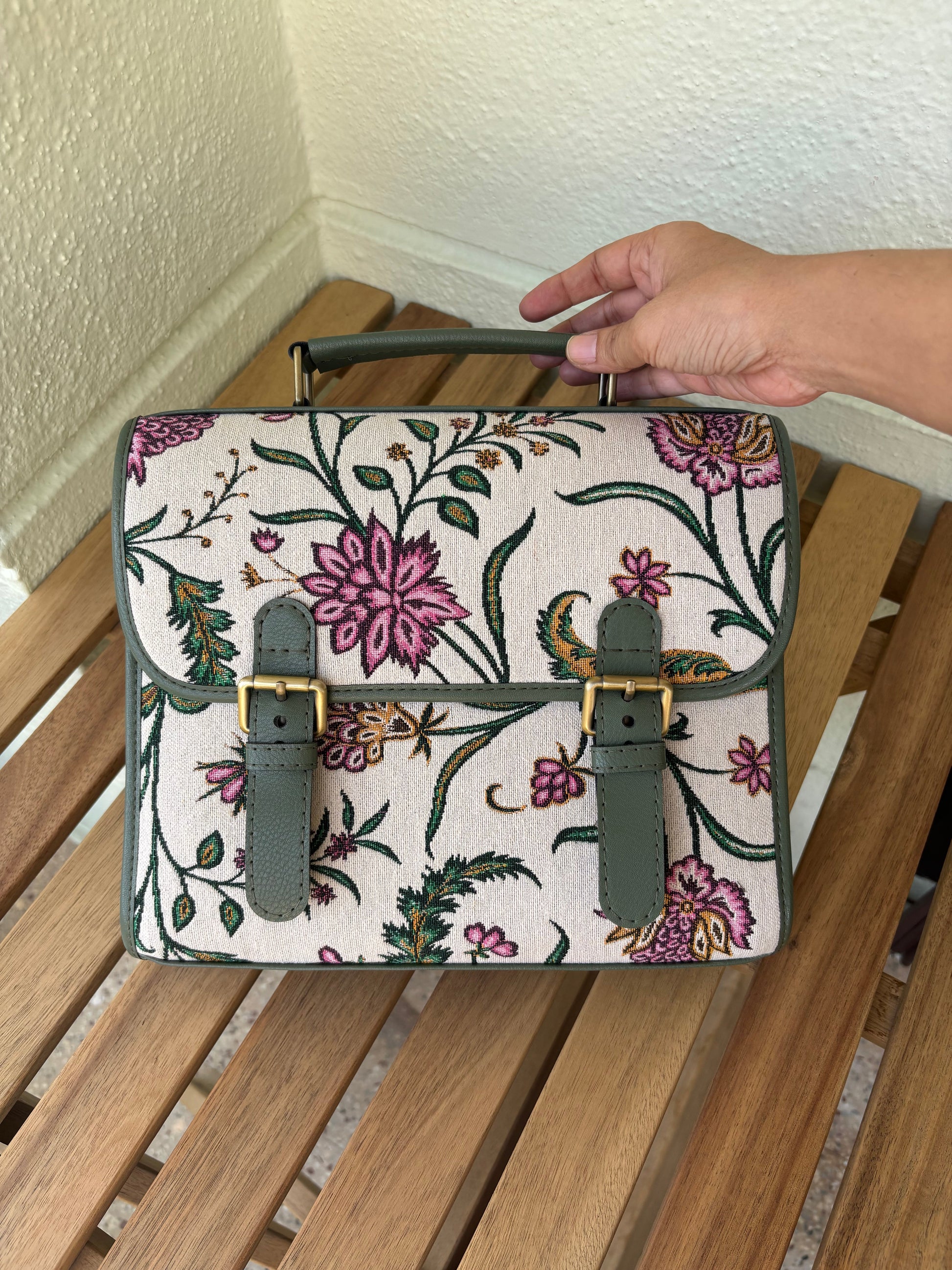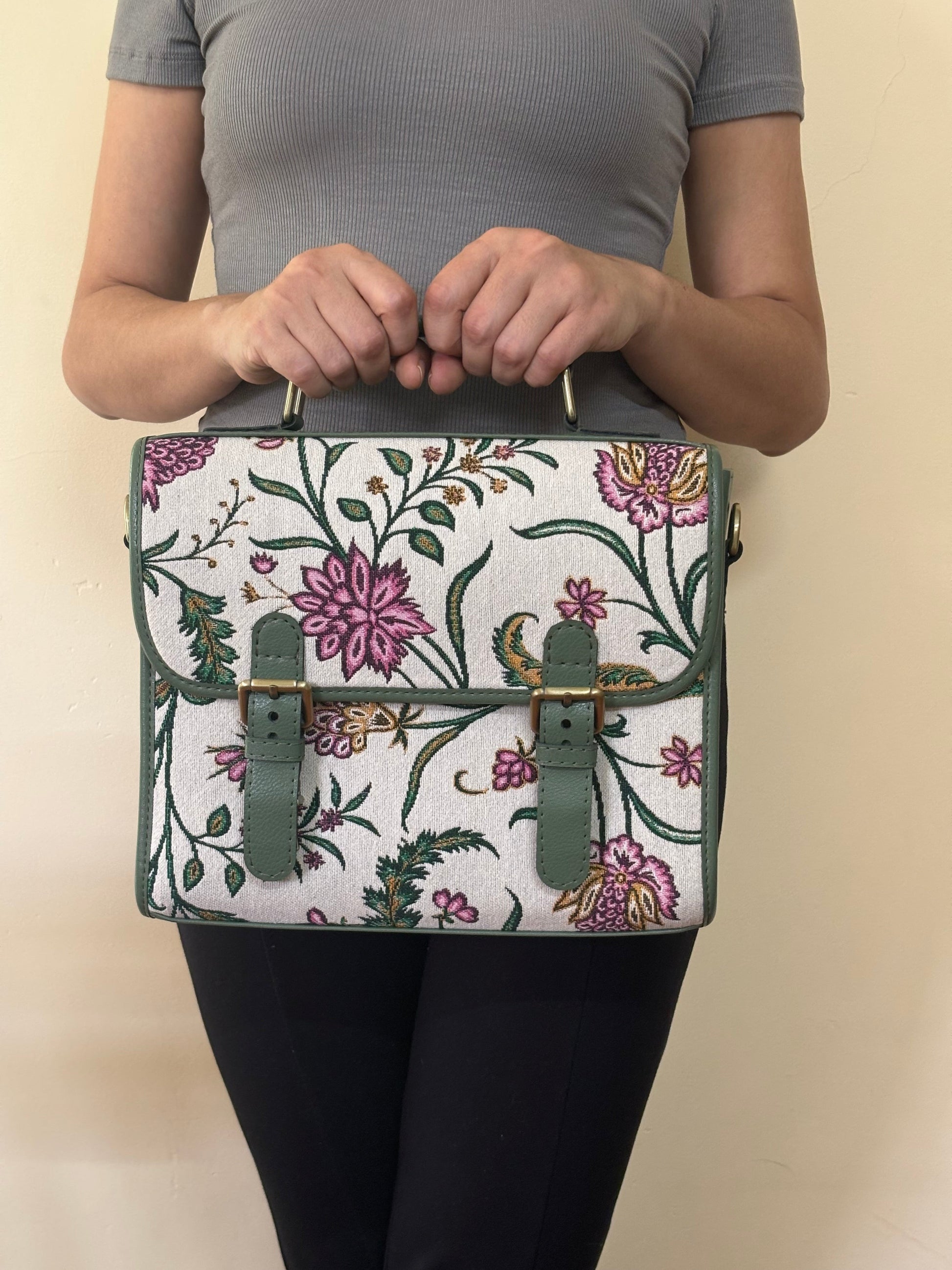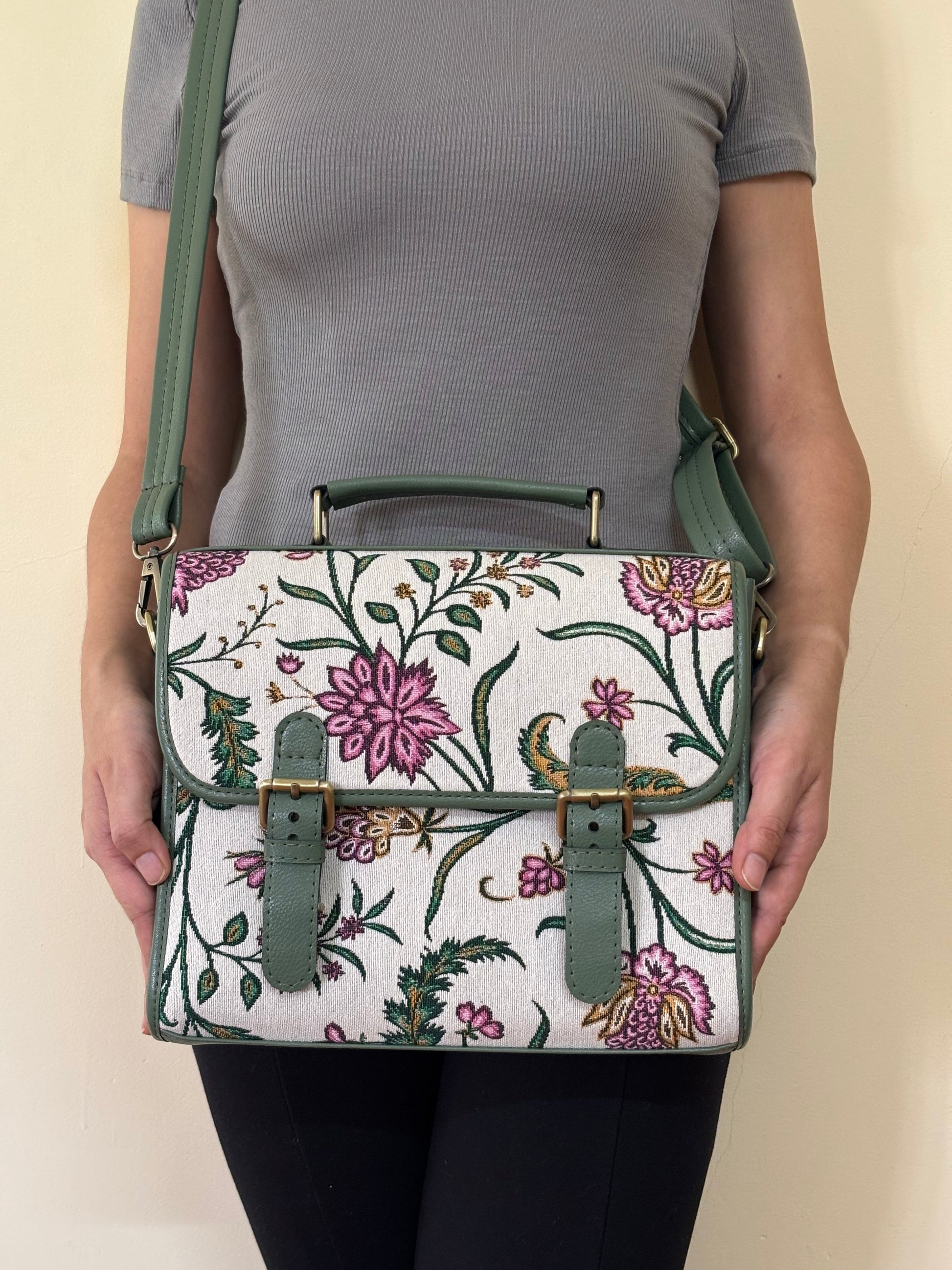 Timeless and elegant, the Meadow Bloom Saddle Bag features a delicate botanical tapestry in earthy tones, paired with deep green faux leather for a nature-inspired finish. With a structured silhouette, top handle, and adjustable strap, it offers versatility and style. Thoughtfully designed with a zippered compartment, open pocket, and antique brass-tone buckle, it’s the perfect blend of vintage charm and everyday function.