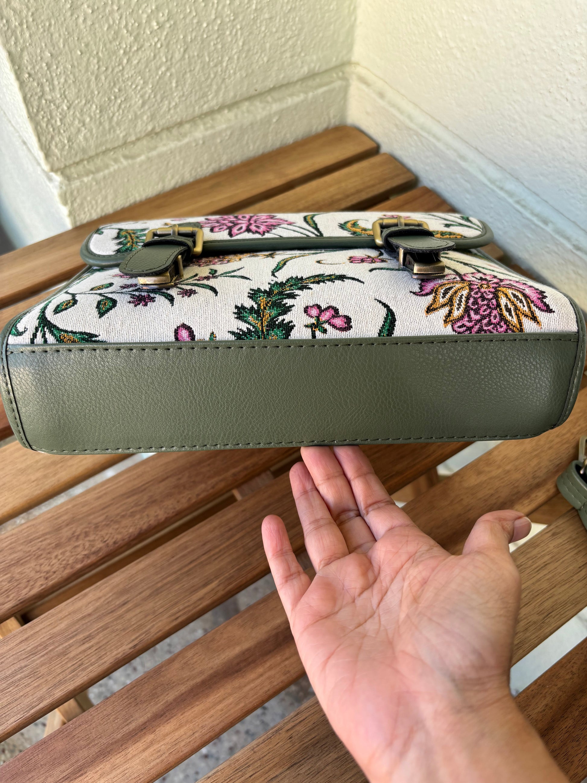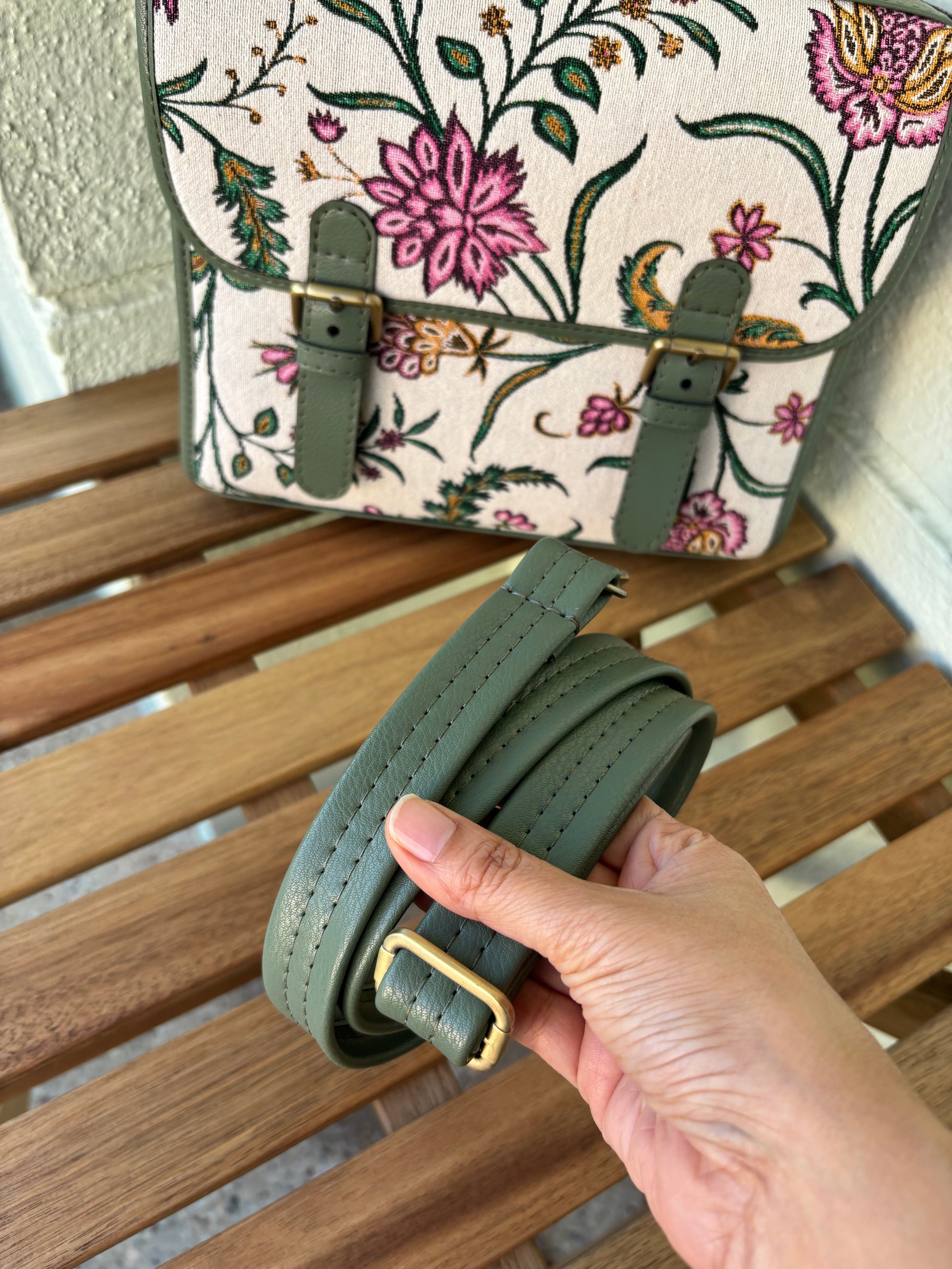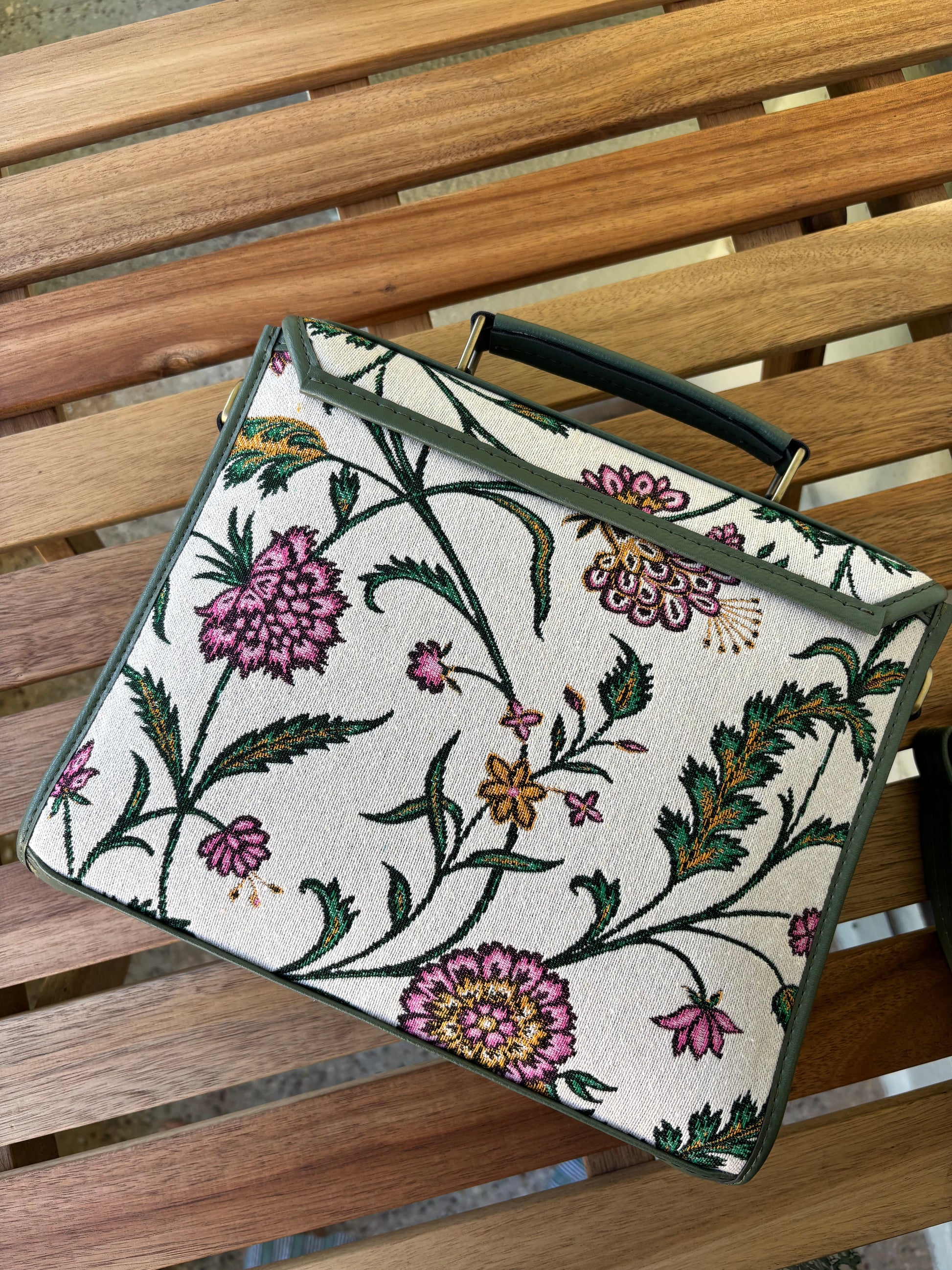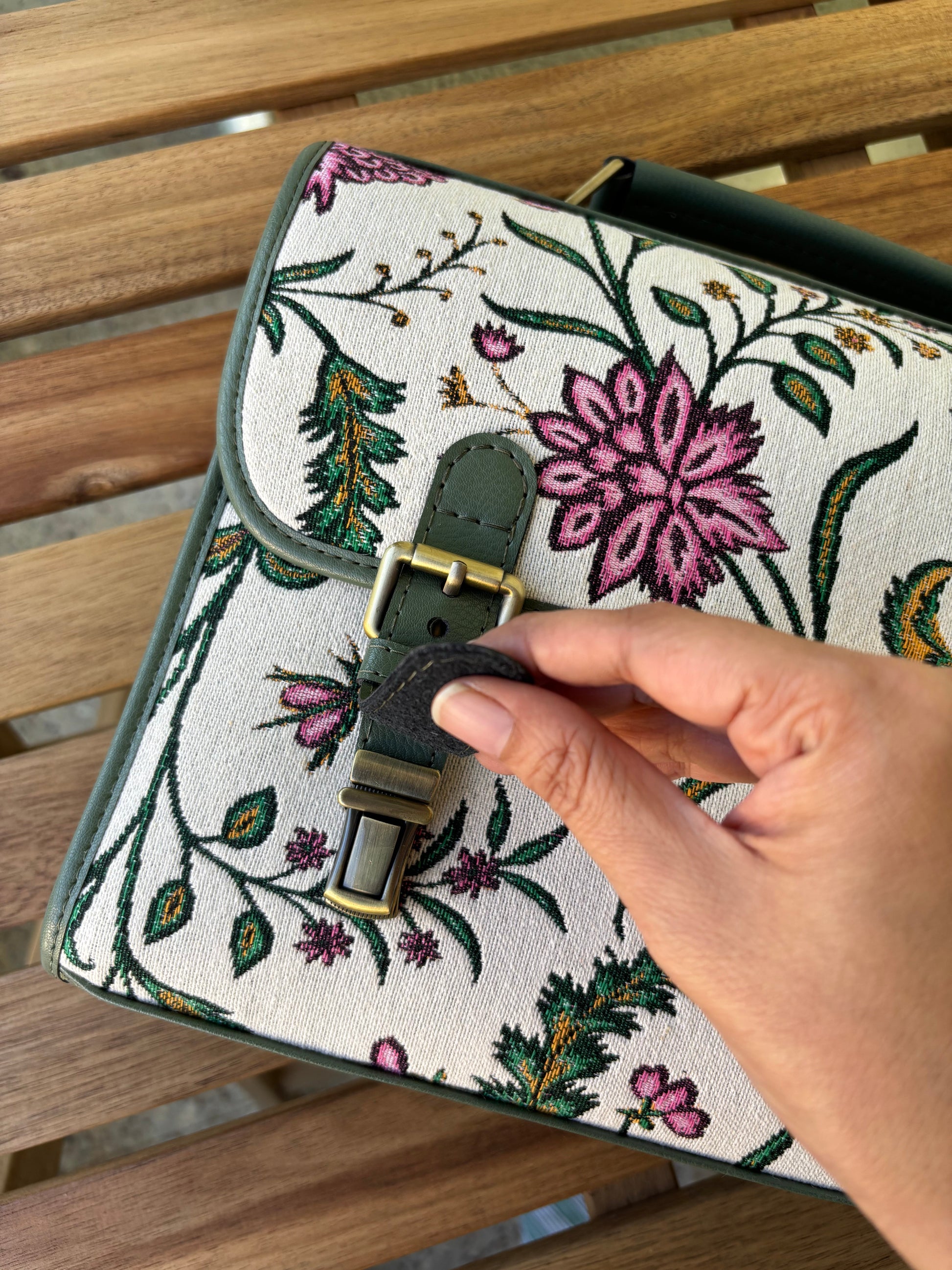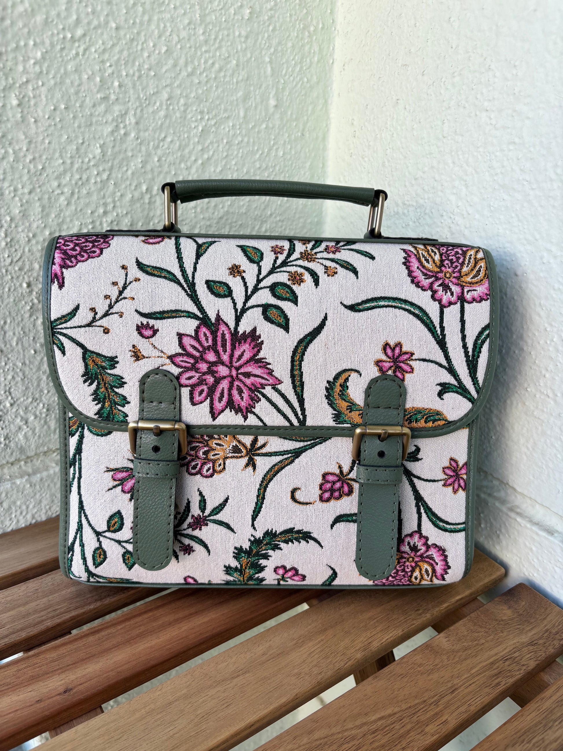 Timeless and elegant, the Meadow Bloom Saddle Bag features a delicate botanical tapestry in earthy tones, paired with deep green faux leather for a nature-inspired finish. With a structured silhouette, top handle, and adjustable strap, it offers versatility and style. Thoughtfully designed with a zippered compartment, open pocket, and antique brass-tone buckle, it’s the perfect blend of vintage charm and everyday function.