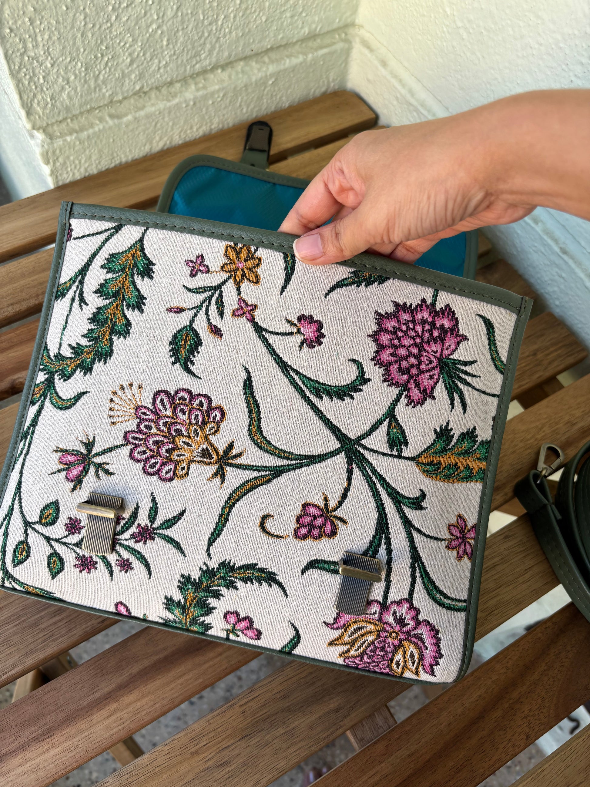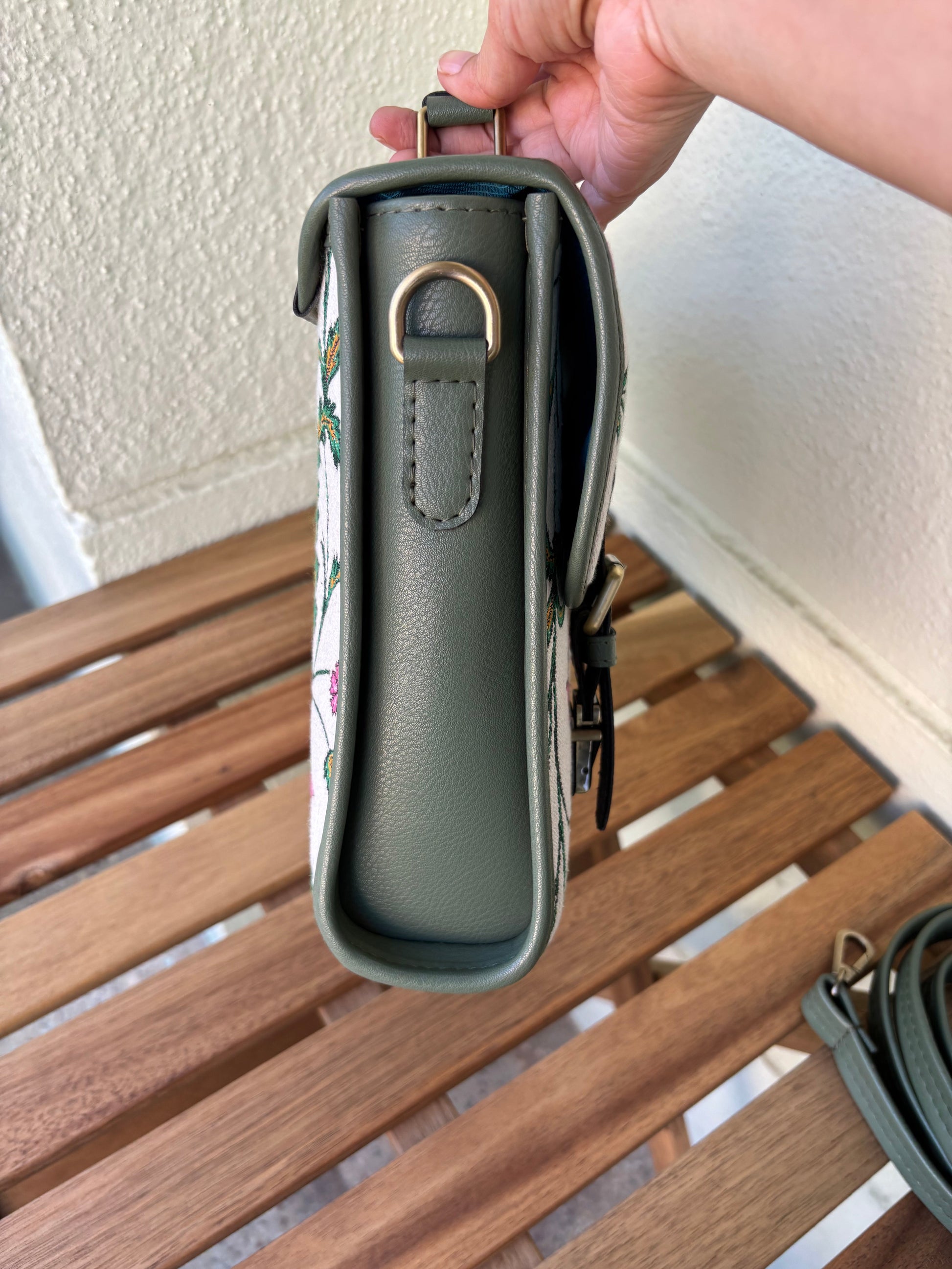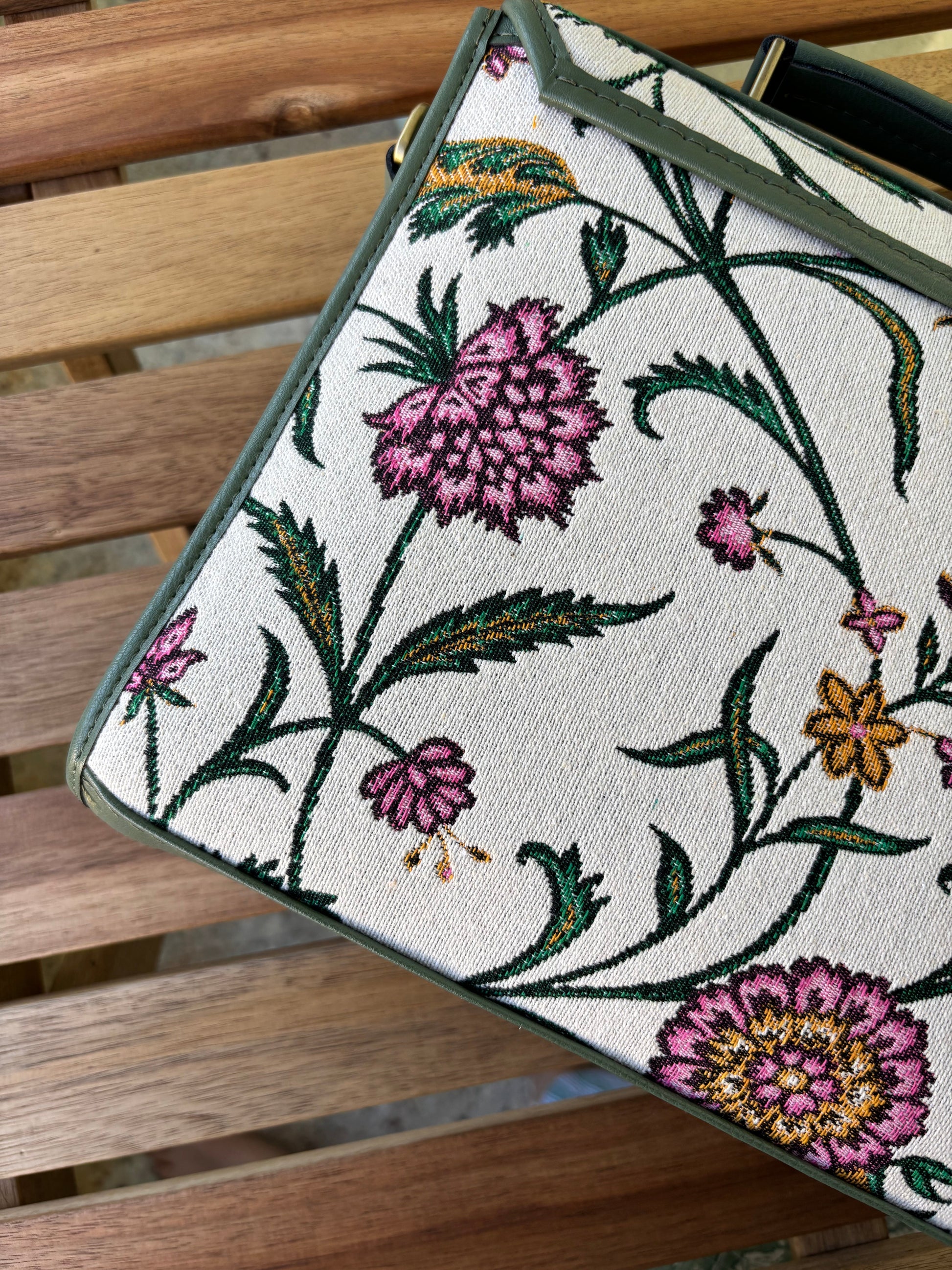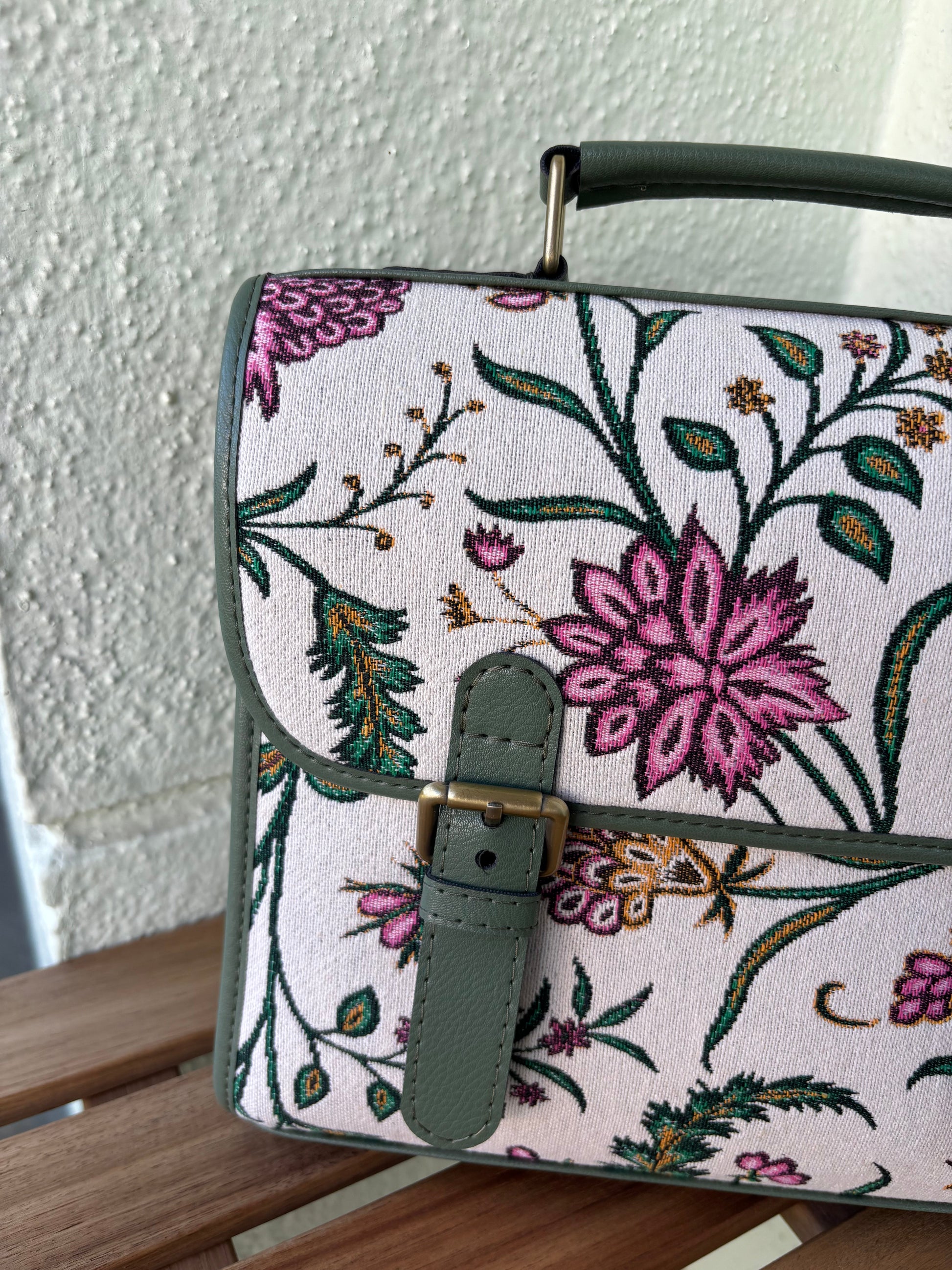 Timeless and elegant, the Meadow Bloom Saddle Bag features a delicate botanical tapestry in earthy tones, paired with deep green faux leather for a nature-inspired finish. With a structured silhouette, top handle, and adjustable strap, it offers versatility and style. Thoughtfully designed with a zippered compartment, open pocket, and antique brass-tone buckle, it’s the perfect blend of vintage charm and everyday function.