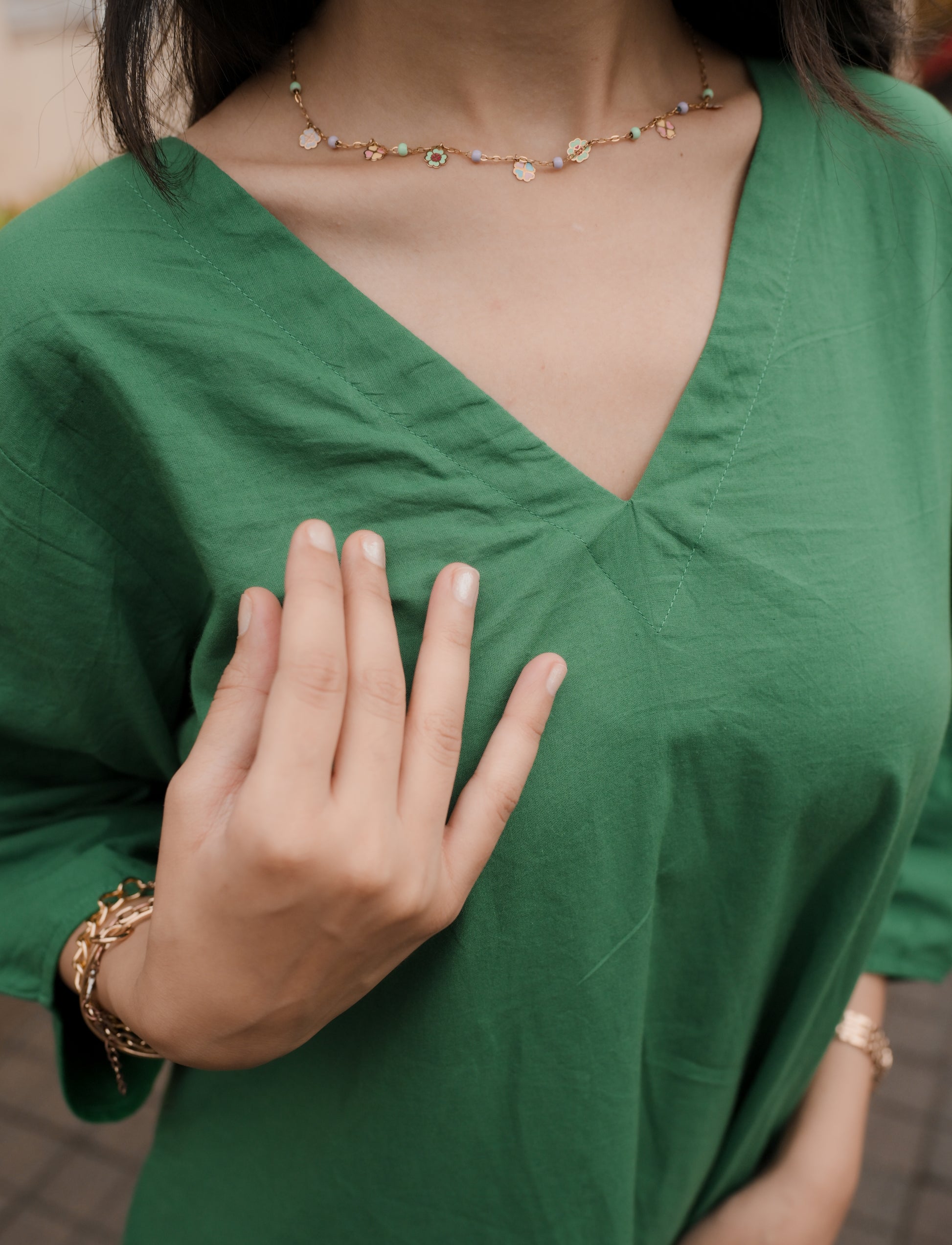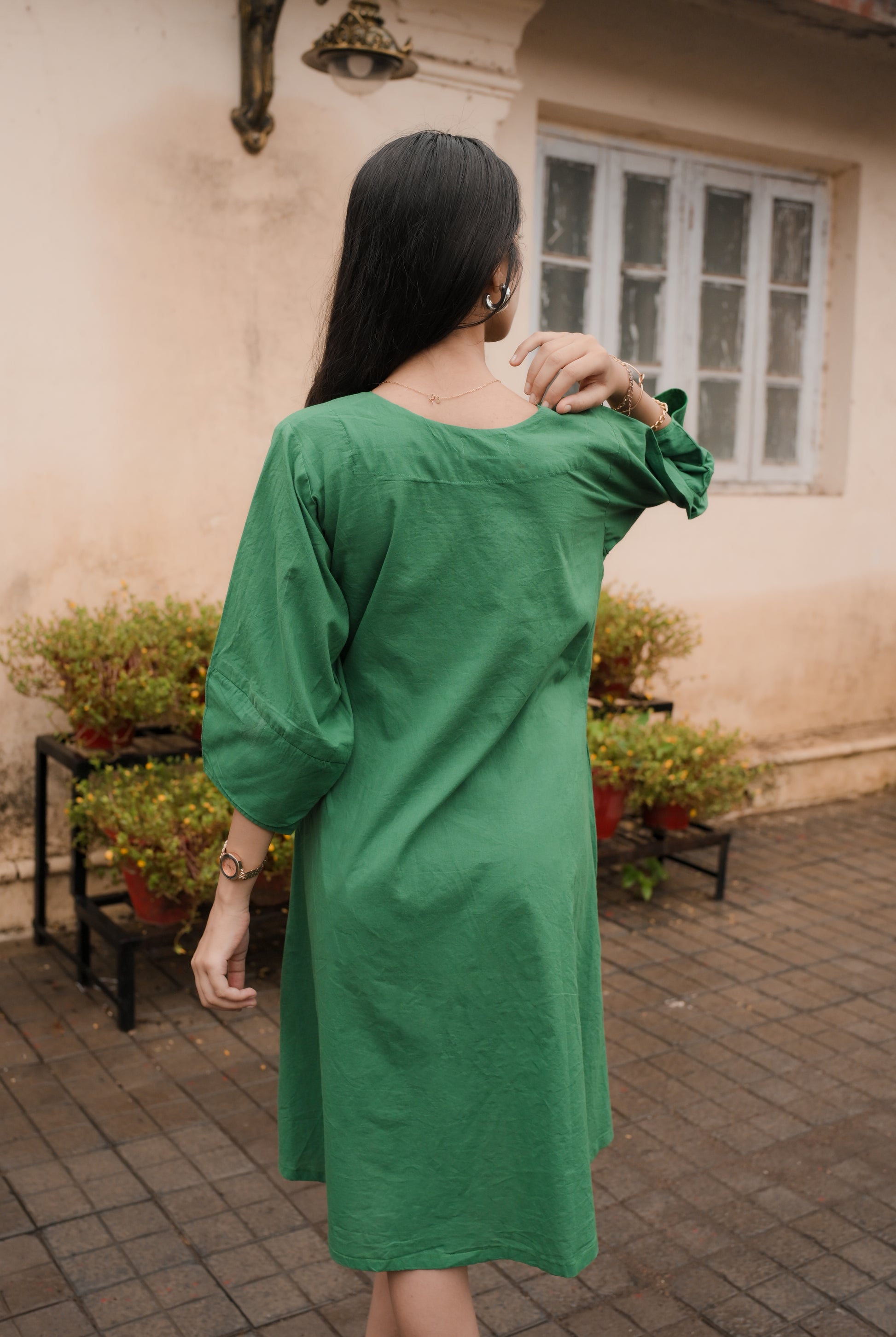 Let comfort bloom in this effortlessly elegant emerald green dress — crafted from breathable cotton and finished with delicate floral embroidery near the hem. Featuring a soft V-neckline, easy A-line fit, and practical pockets, this dress is perfect for days when you want to feel light, lovely, and completely yourself.The subtle statement of embroidered blooms adds a touch of whimsy, making it perfect for brunch dates, work calls, or just twirling around at home.