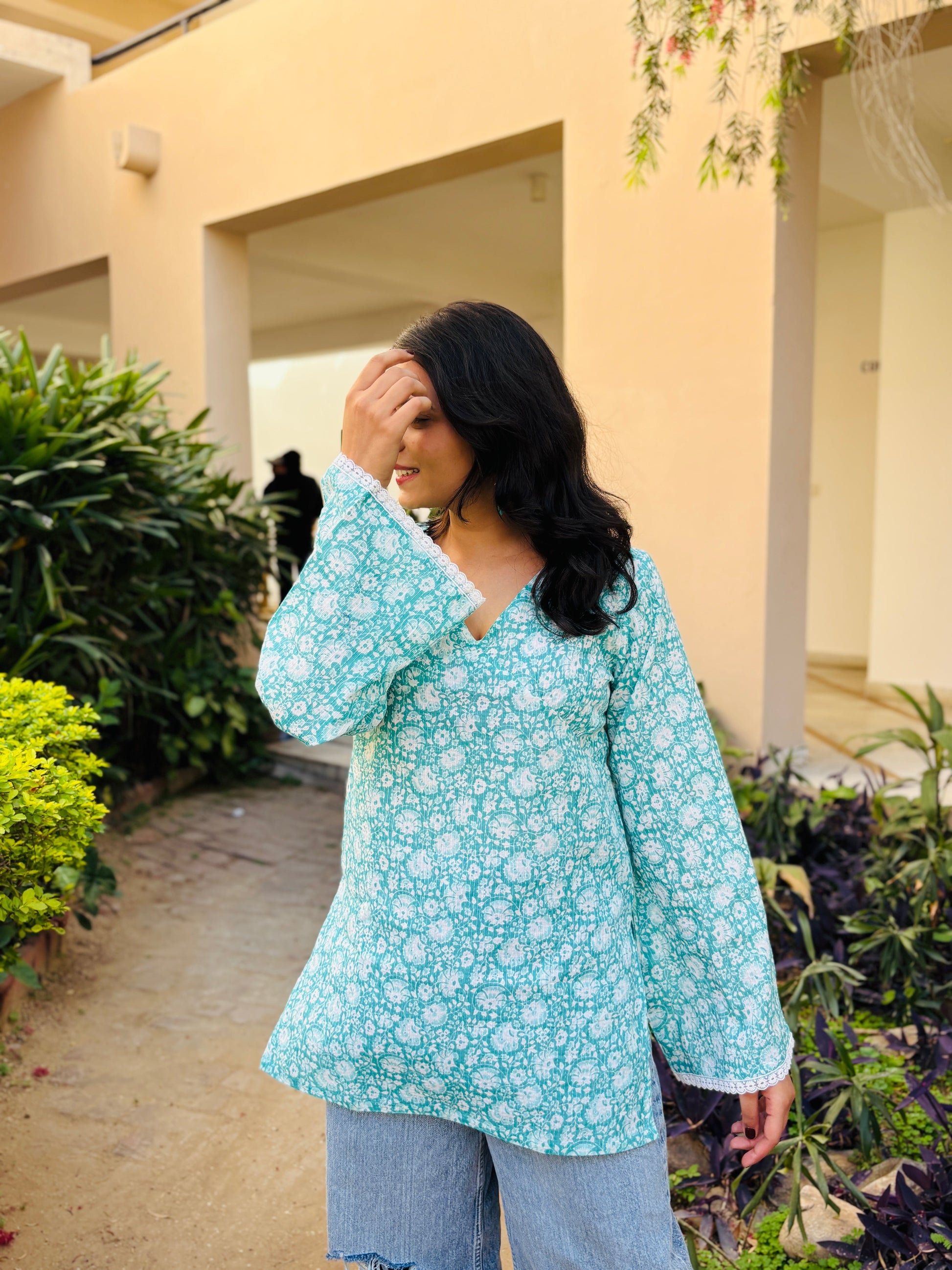 Refreshingly subtle yet full of character, the Meher Kurti in sky blue is a must-have for lovers of soft, timeless hues. Featuring an intricate white handblock print, this kurti beautifully blends comfort and elegance. The airy cotton fabric makes it ideal for warm days, while the lace-trimmed bell sleeves add a hint of playfulness. Pair it with jeans or palazzos for a look that's effortlessly chic and serene.