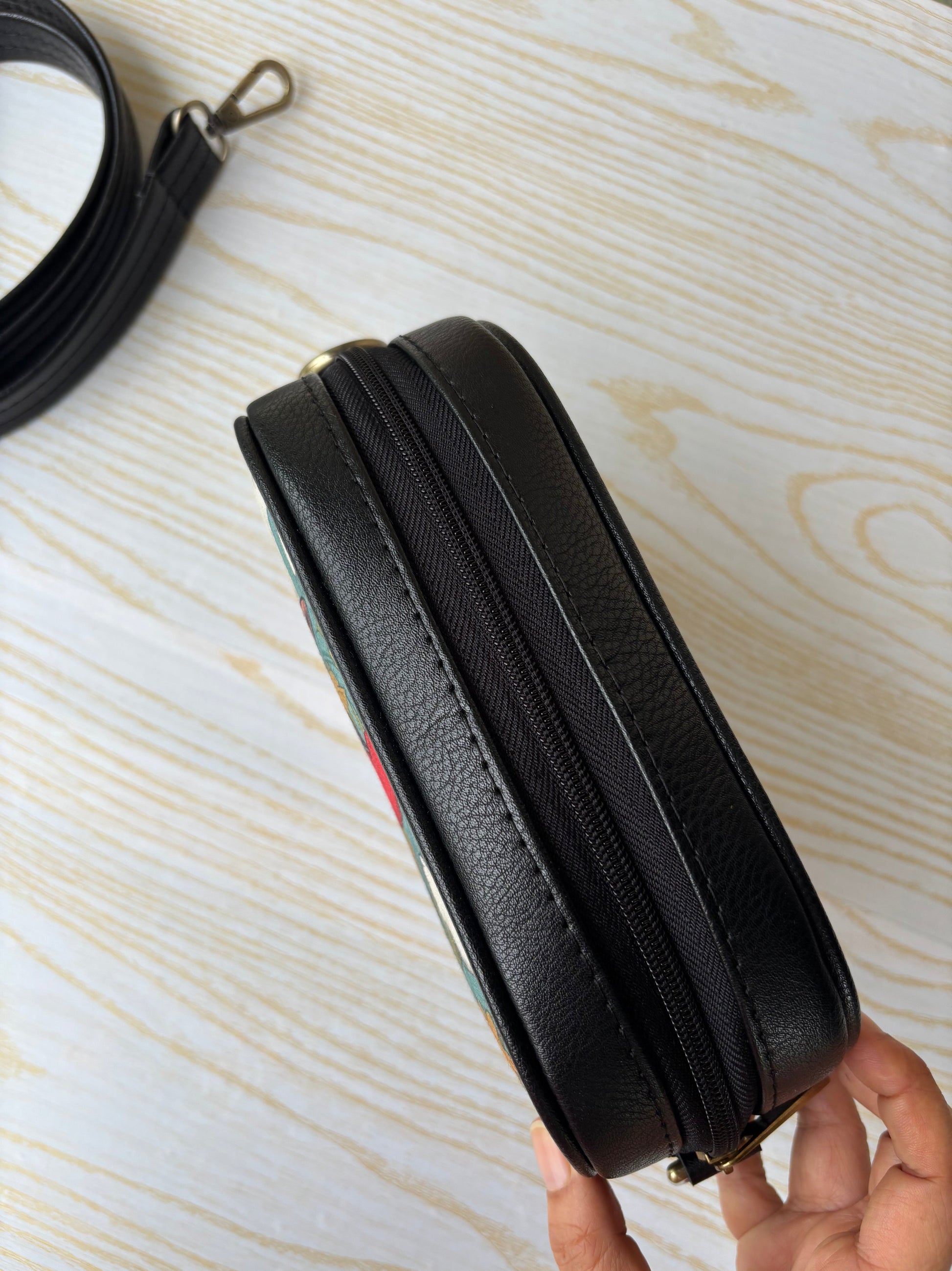 Playful and artistic, the Meow Muse Sling Bag features a whimsical cat tapestry brought to life with intricate detailing. Accented with sleek black faux leather, this compact bag is perfect for cat lovers who want to carry a bit of charm and character wherever they go.