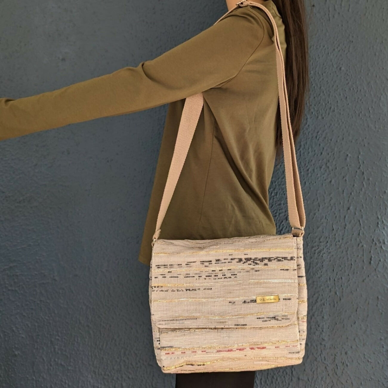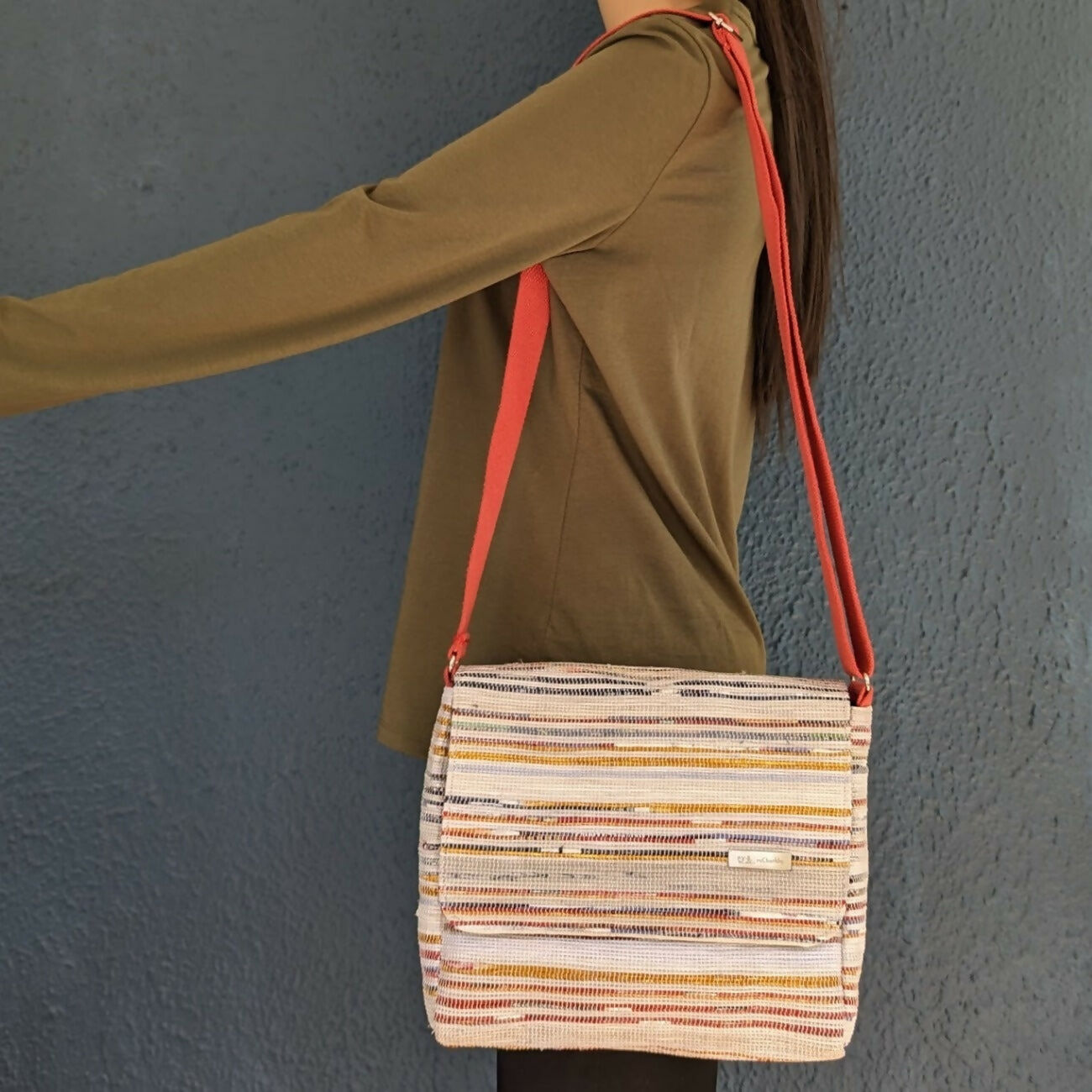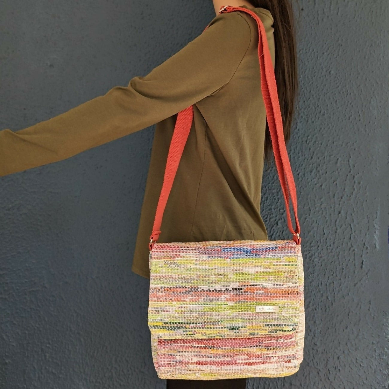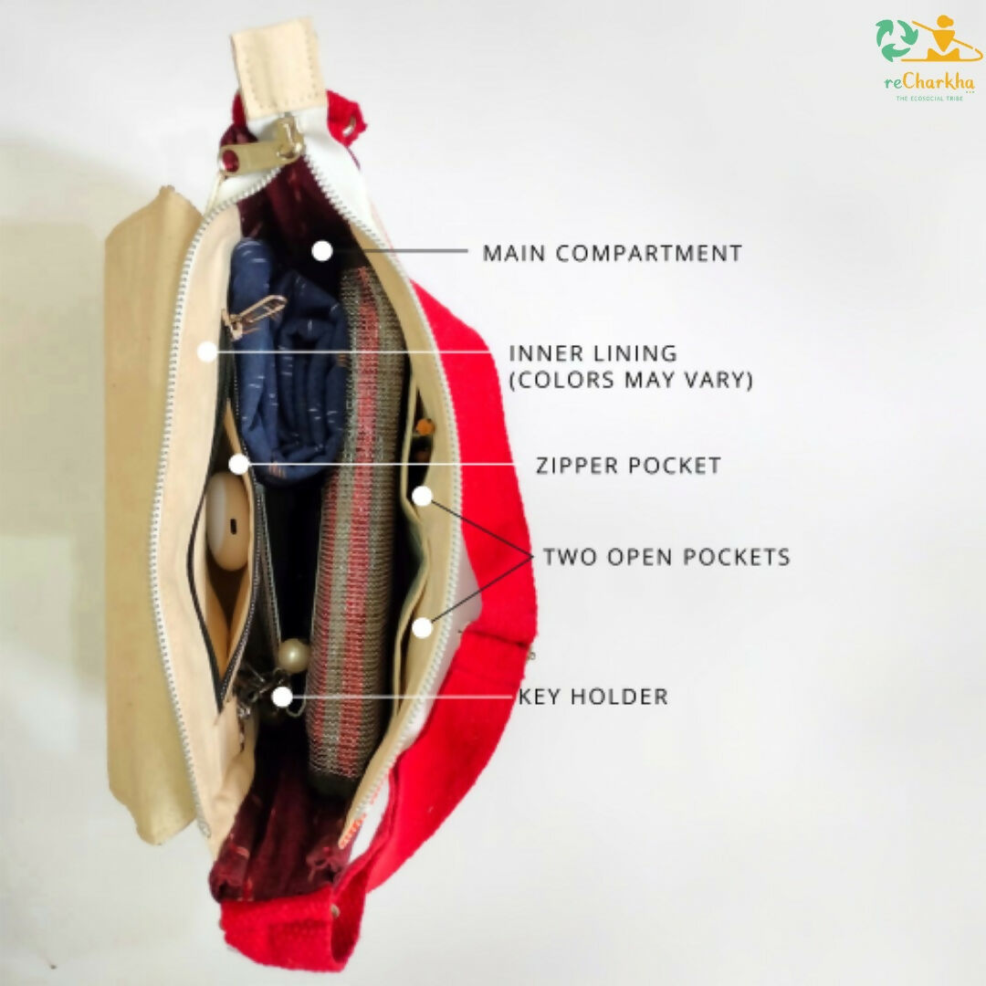 Trendy, youthful and innovative is what you can expect from reCharkha Upcycled Handwoven Messenger Bag. Carry it as a Sling , a Small Tote or as an Arm Bag!It is handy as a Sling-It yet has all features our bigger Totes have from inside. Use it as Small travel bag or a Purse for regular shopping! The strap is adjustable so as to convert it into an Arm Bag! An additional Flap to the bag gives a classy corporate look too!