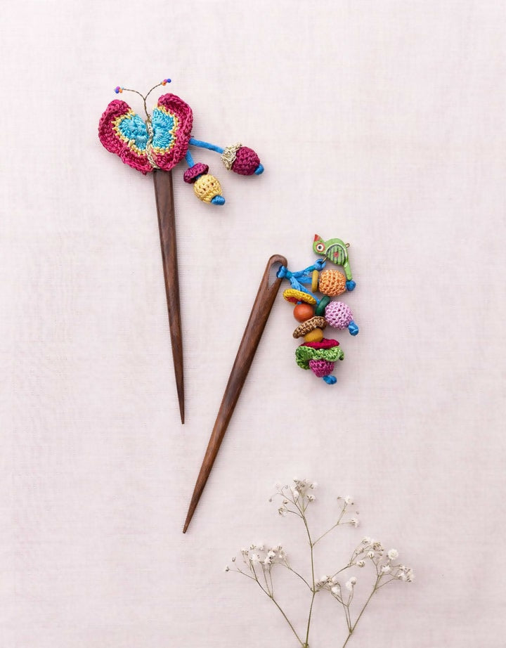 Materials: Viscose Thread, Wooden Hair Stick, Metallic Thread, Wooden Beads