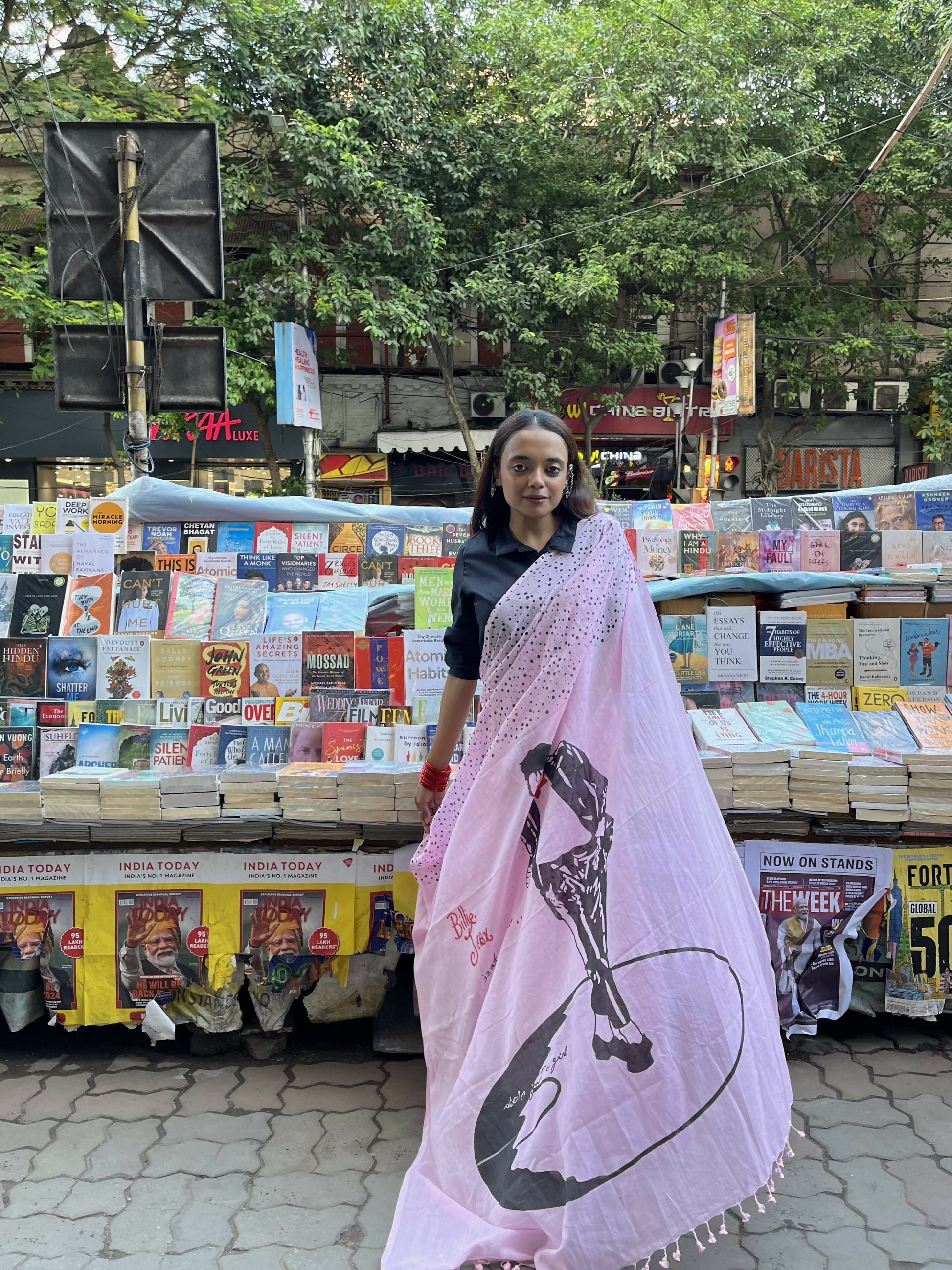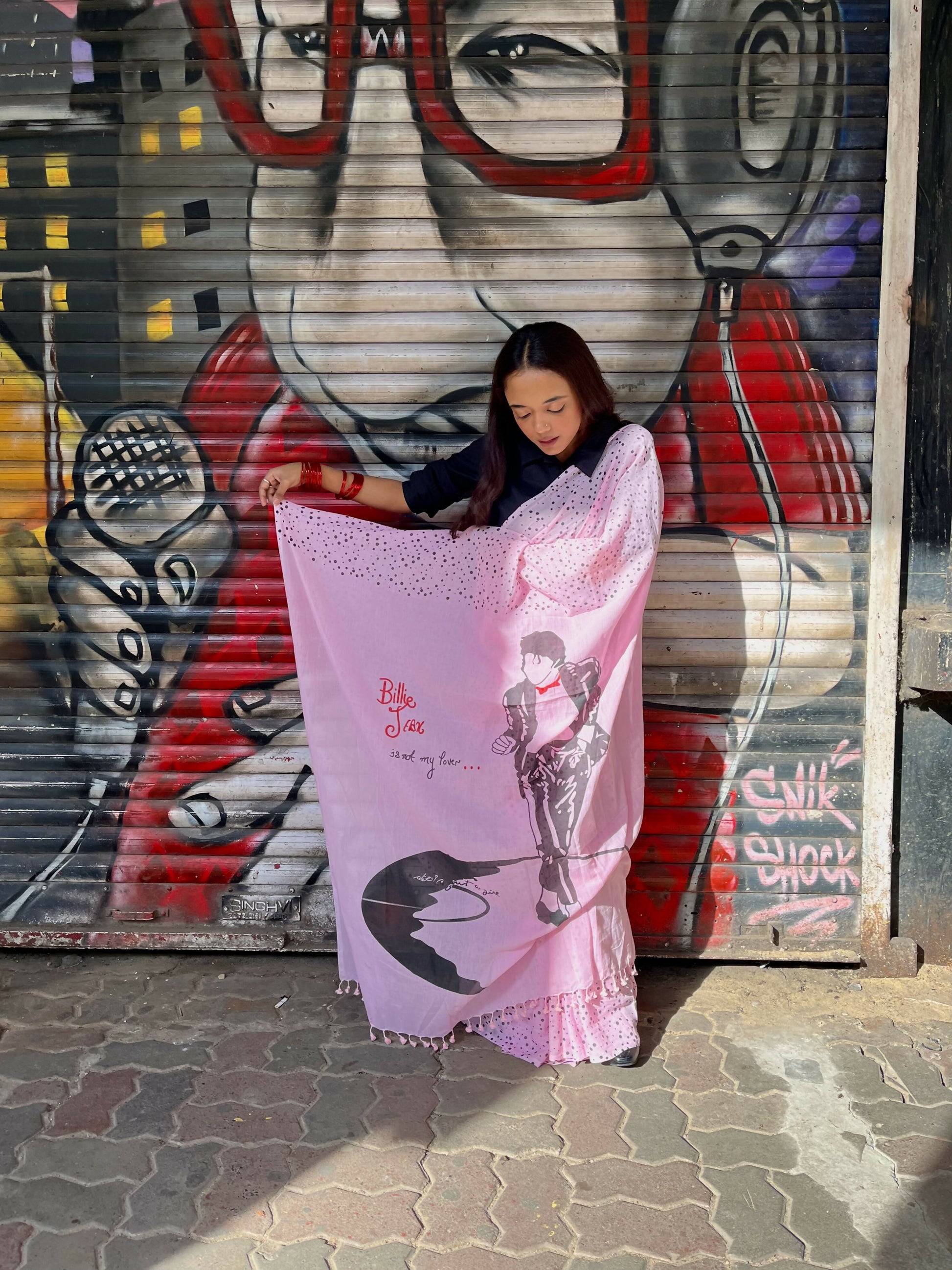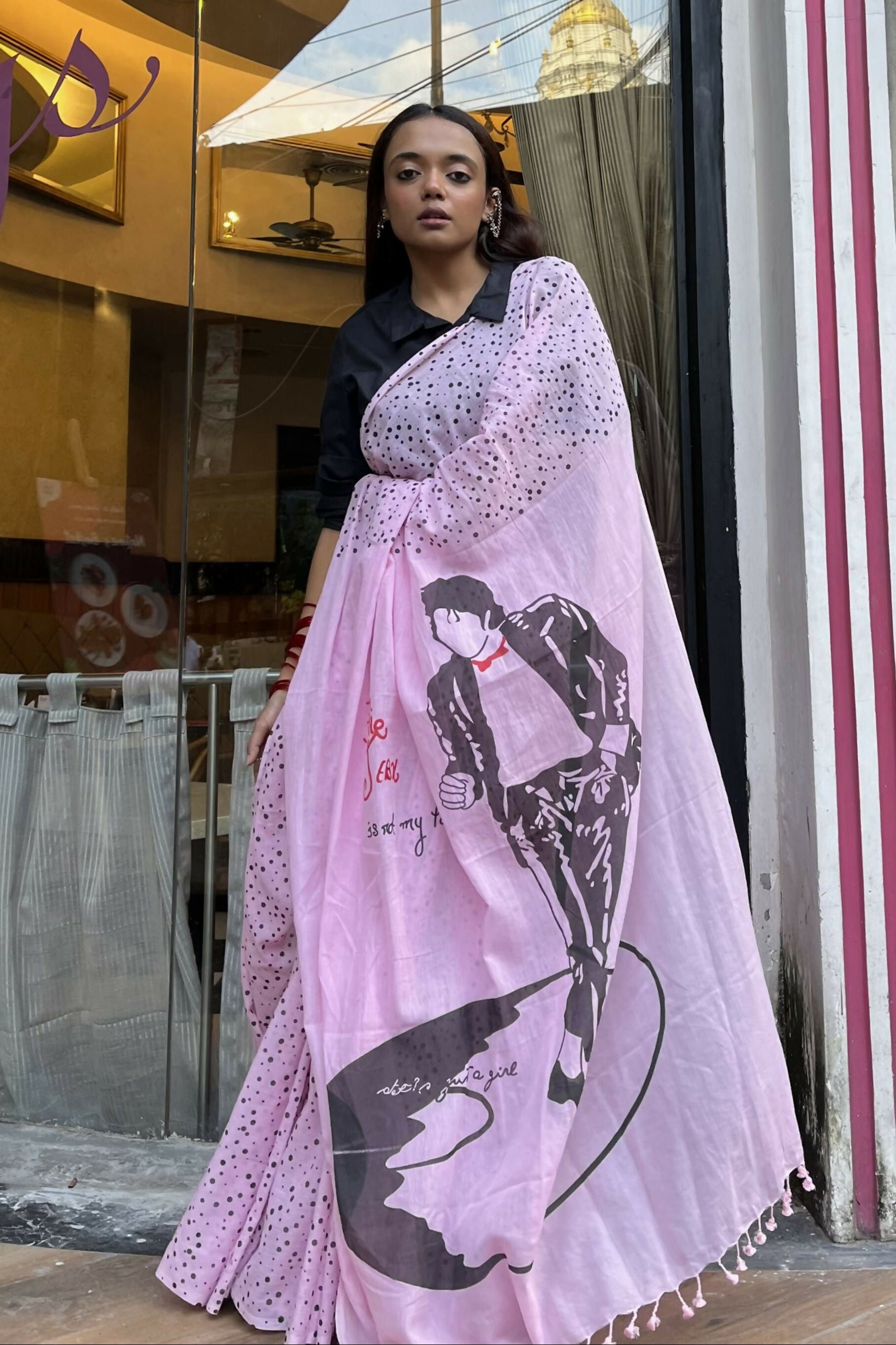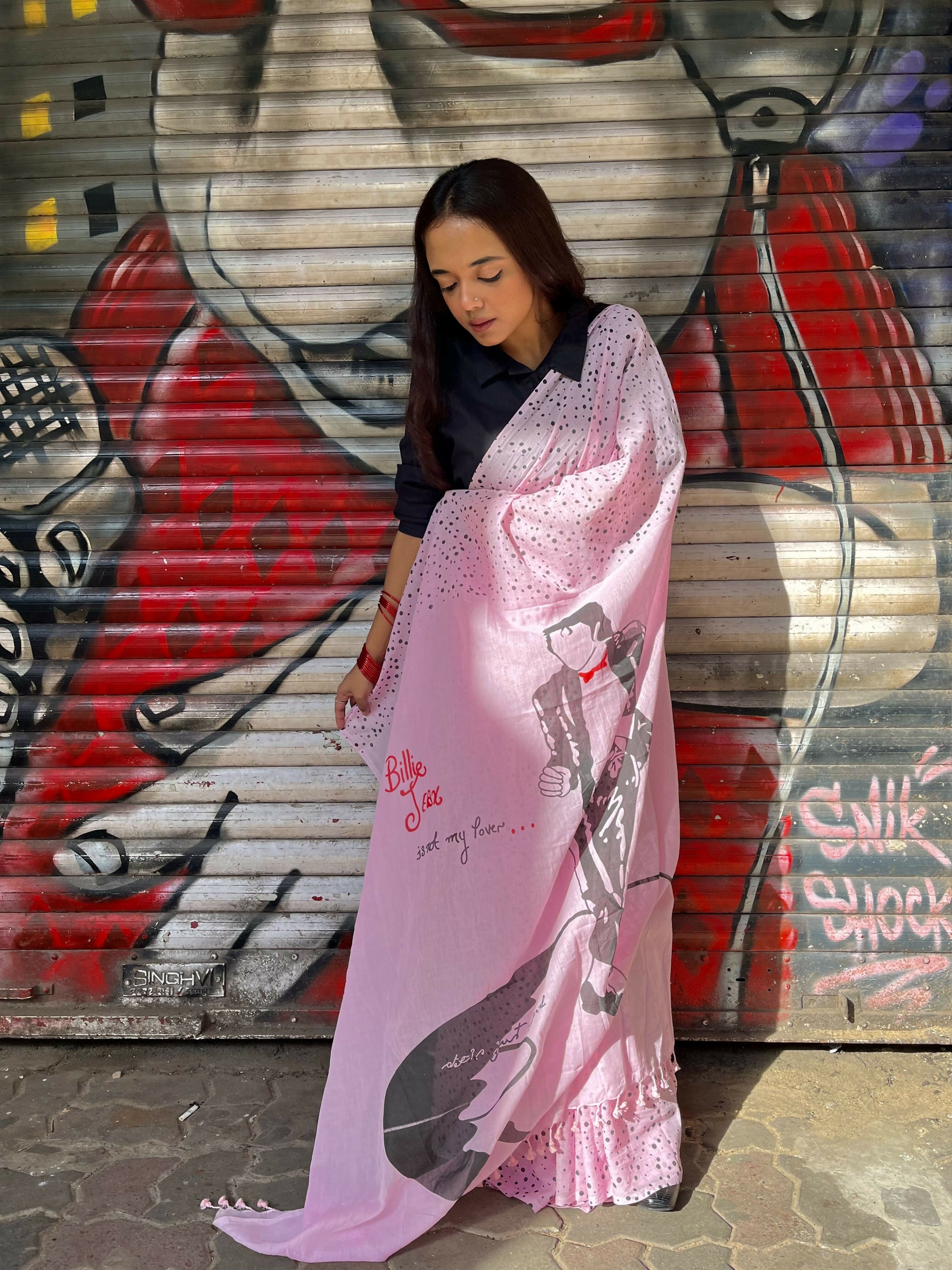 This saree is inspired from The 'King of Pop', Michael Jackson's classic hit 'Billie Jean'. This pink mul cotton saree would look amazing on you divas! Grooving right? The body is light pink in color with black polka dots printed all over the body. The pallu has a picture of Michael Jackson with Billie Jean's essence that is surely enhancing the whole look!