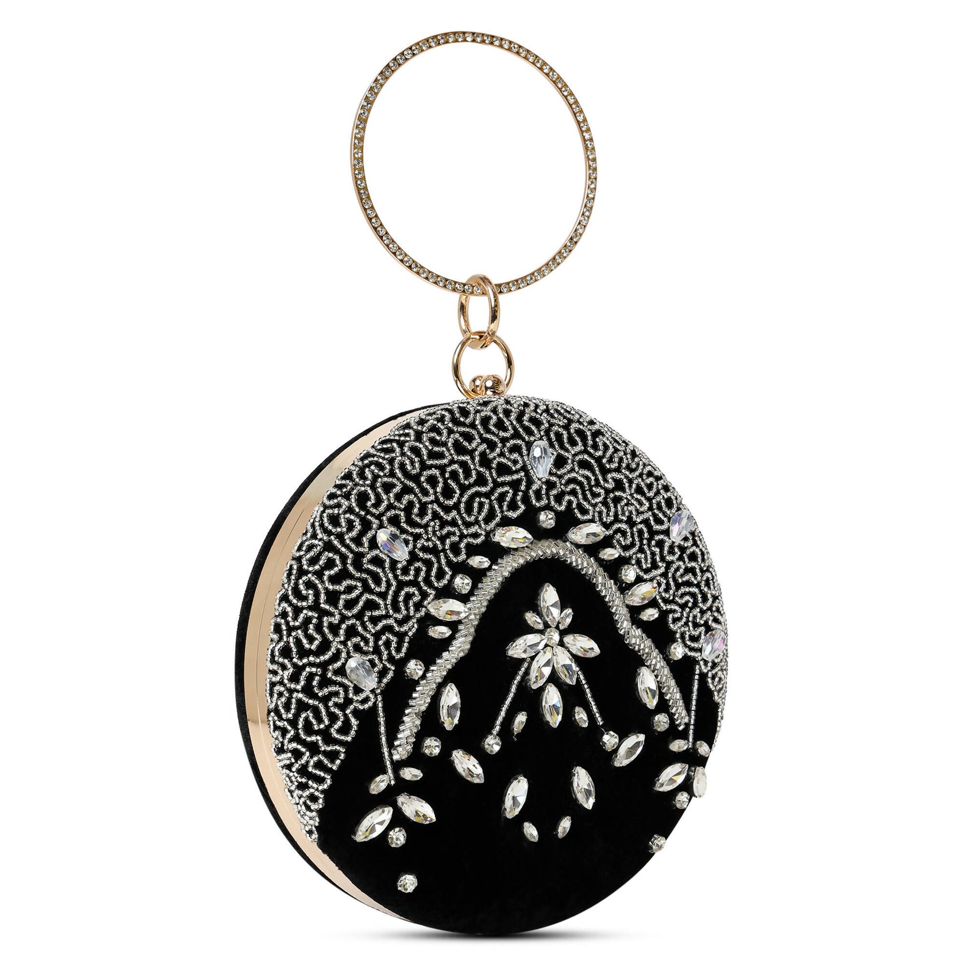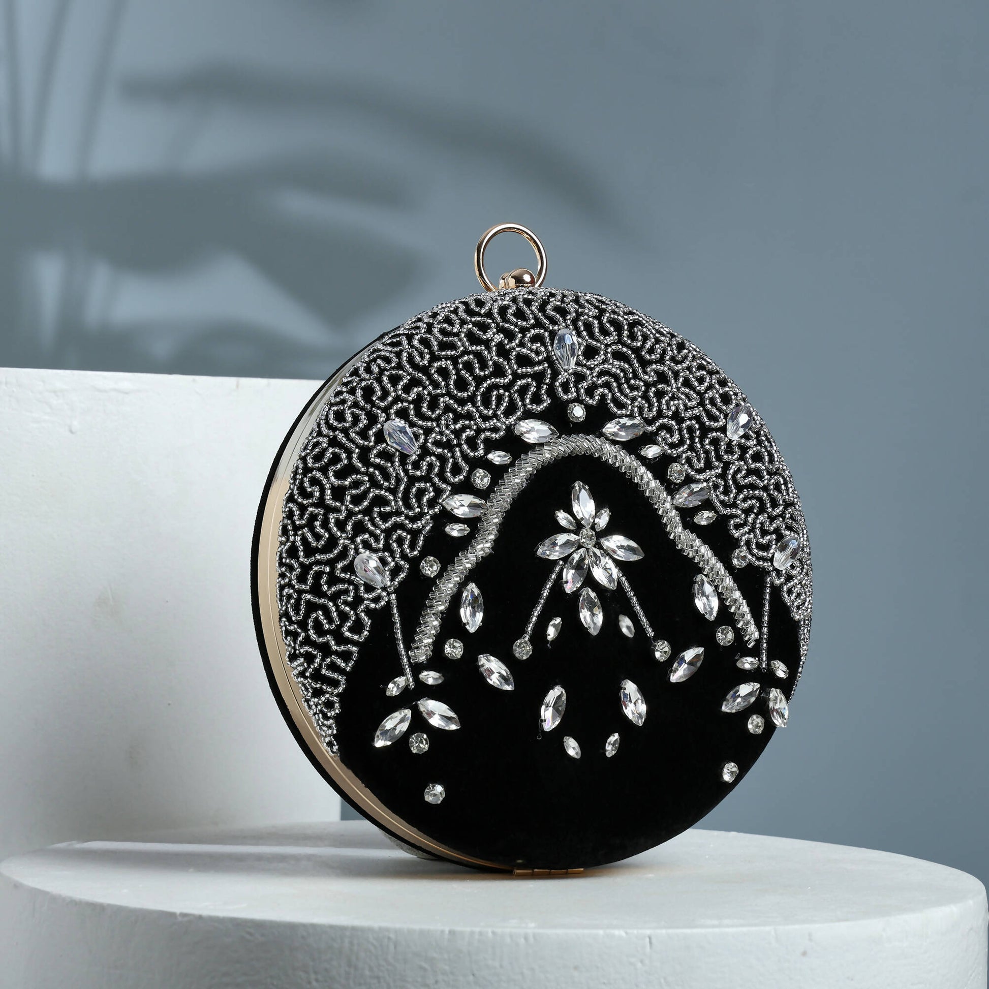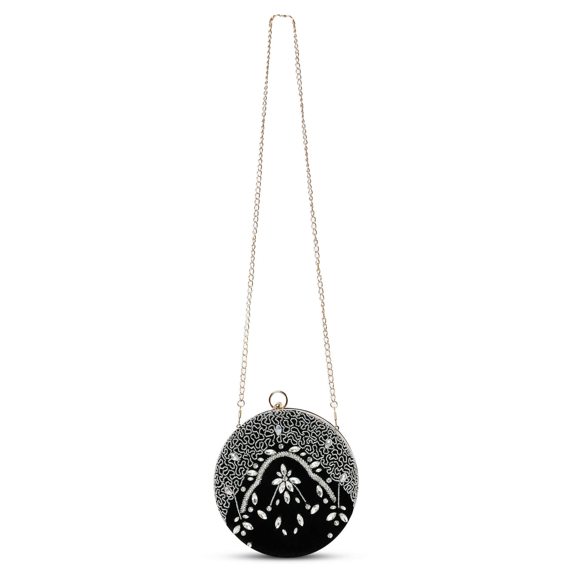 Exquisite Black Velvet Clutch, Adorned with shimmering silver stones.Complete with a convenient sling chain and elegant bangle lock.