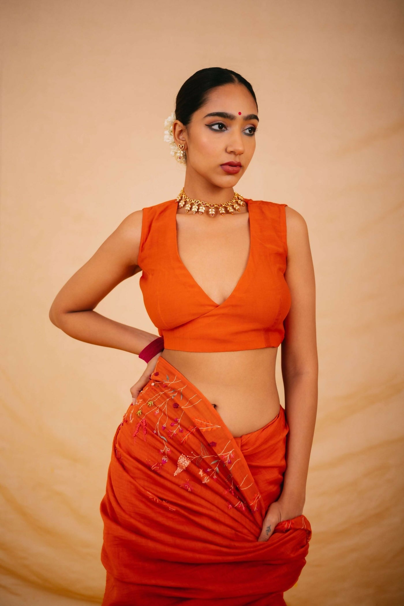 A bright cheerful orange blouse- is handcrafted in Chanderi to keep you in the spotlight! Perfect for any day and any occasion. V neckline with wraparound design and tie-up at back.