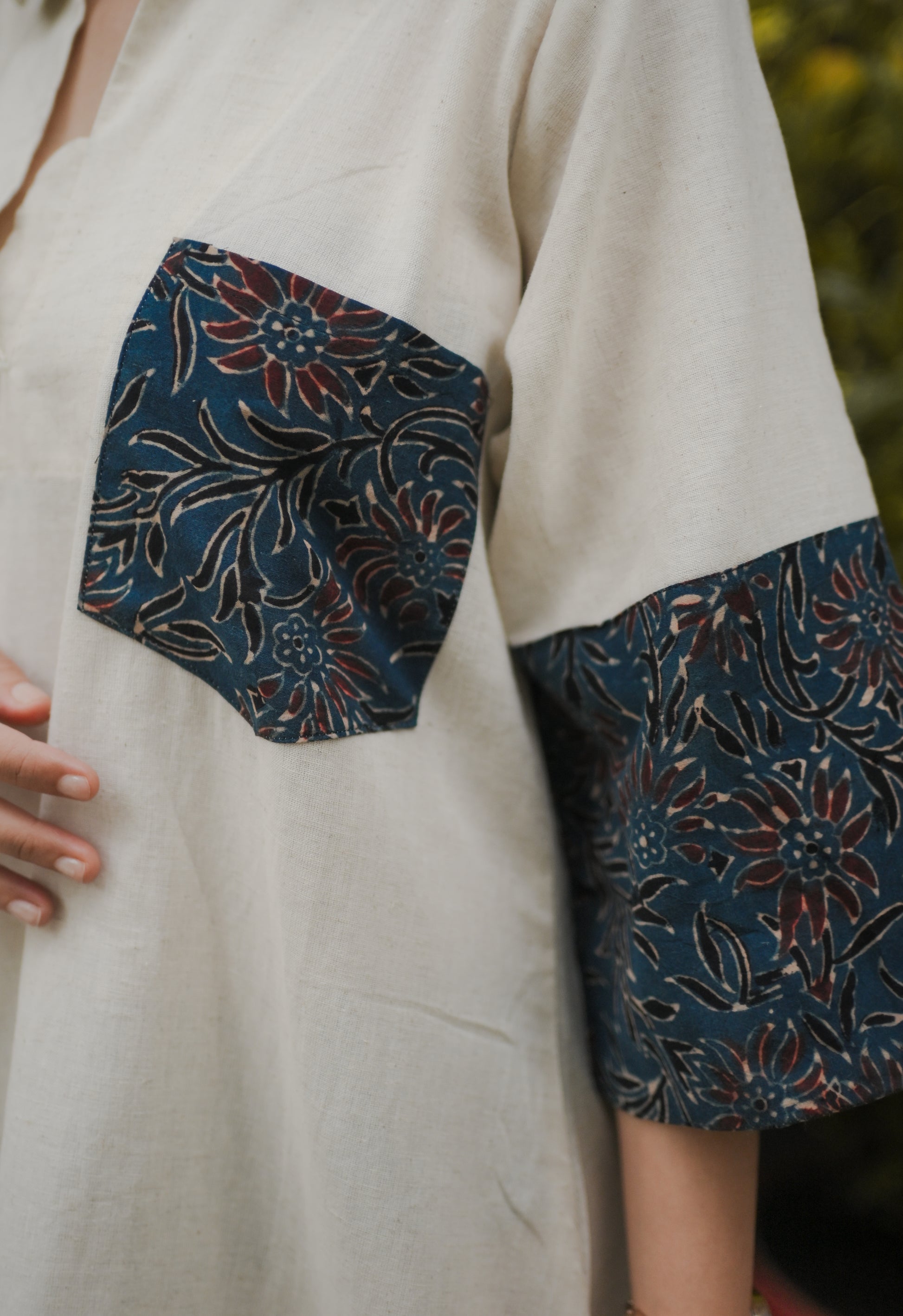 A modern twist on classic comfort, this cotton shirt dress features wide statement sleeves with intricate embroidered panels. The relaxed silhouette and collared neckline make it a versatile pick for everything from casual brunches to city strolls.