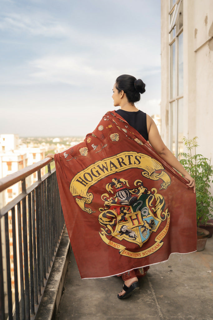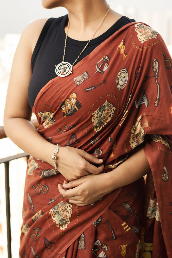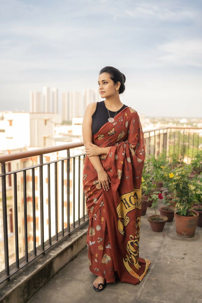 Our bestseller saree it is! This saree talks about only mischief and magic. The maroon base body has the elements of the magical wonderland. The pallu has the beautiful Crest printed on it. This saree is a total game changer! Right? Always!