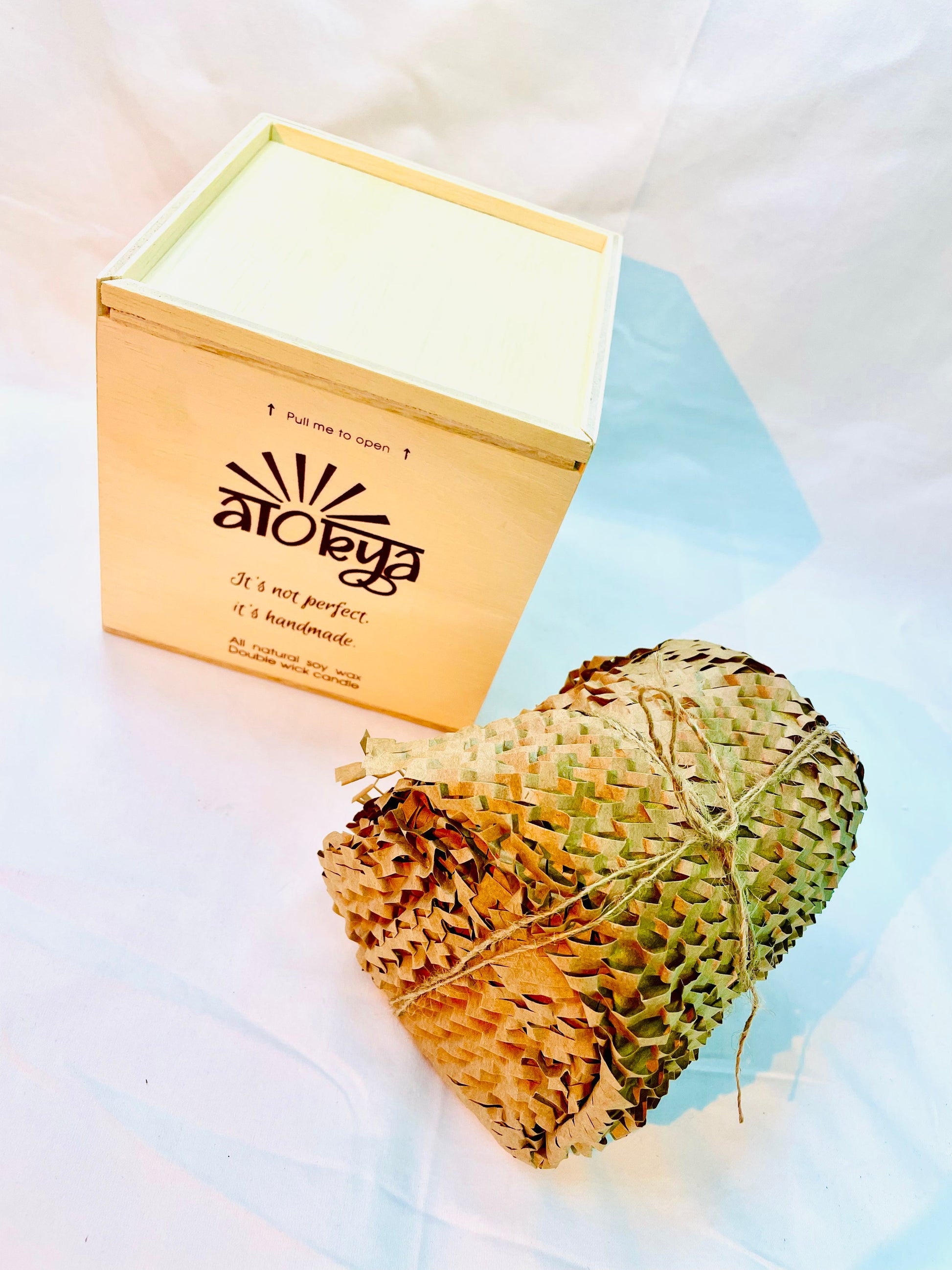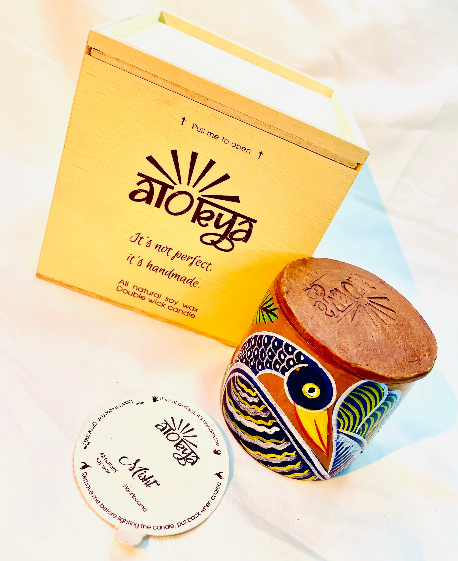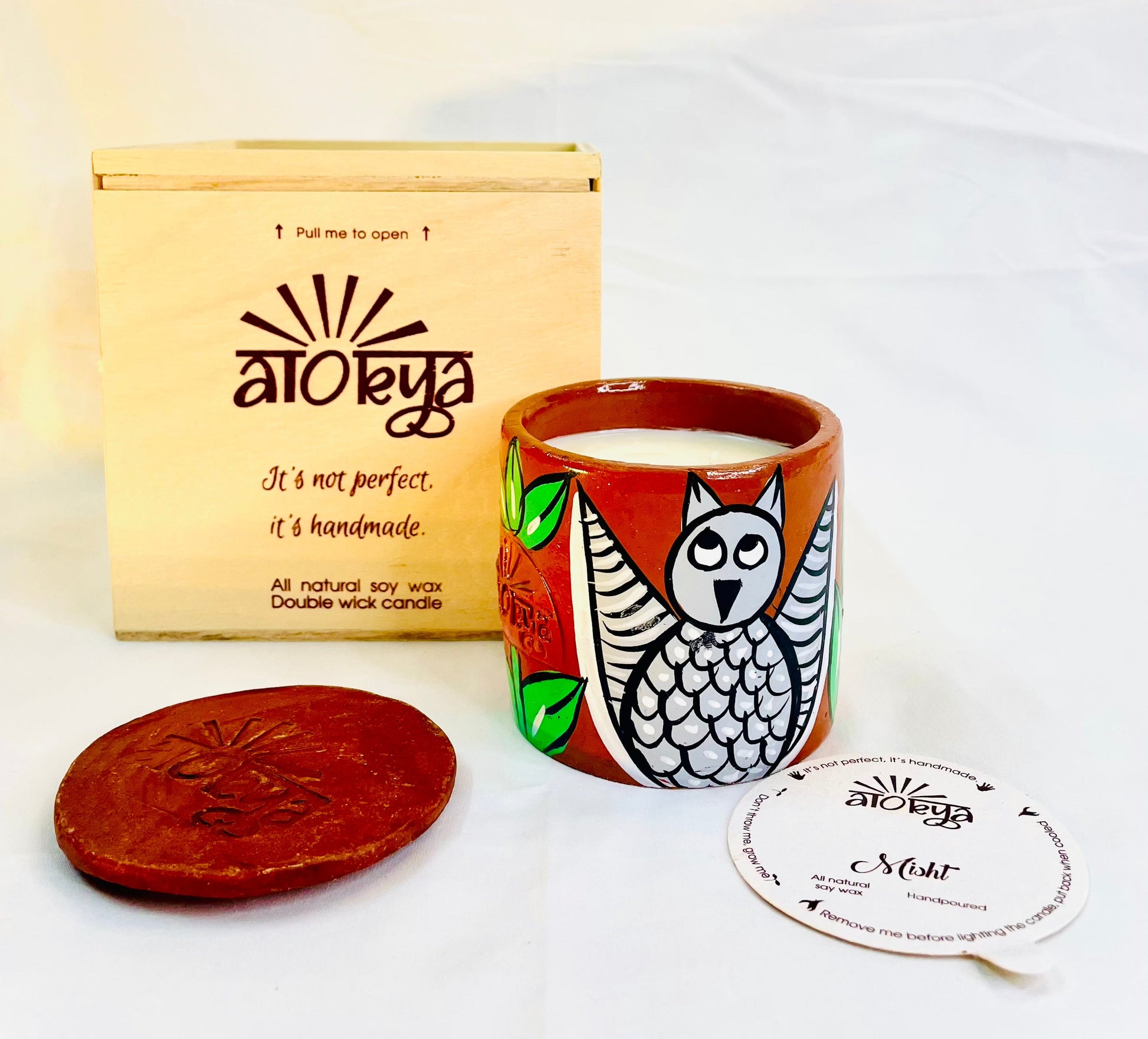 Our candles come in authentic Terracotta jars. We use natural wax for the candle, which is hand poured in small batches. The wicks used are 100% cotton to ensure a clean burn.