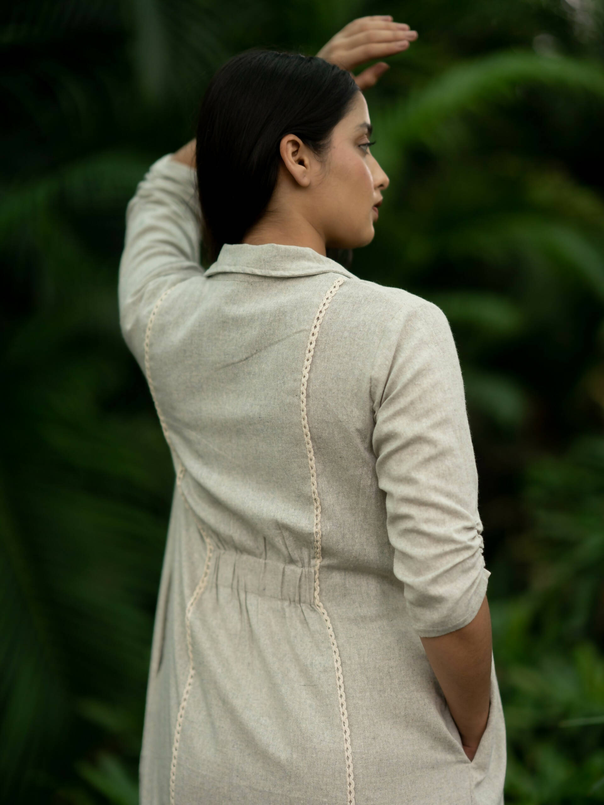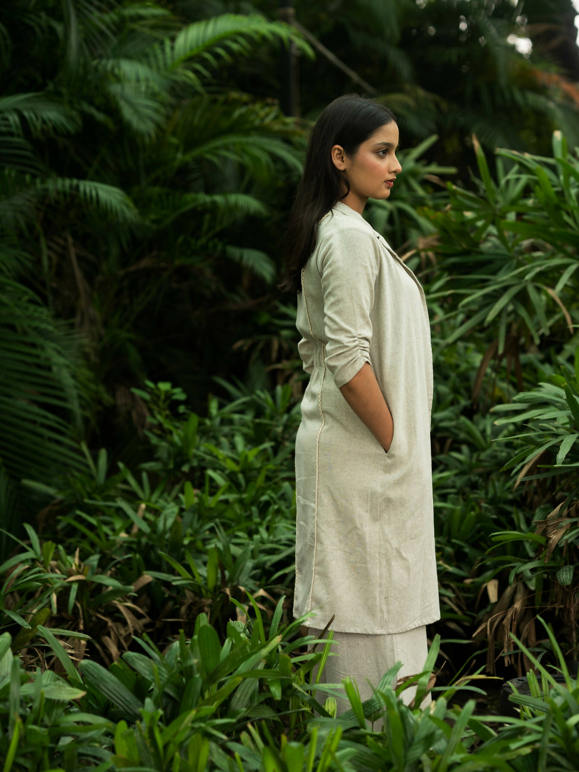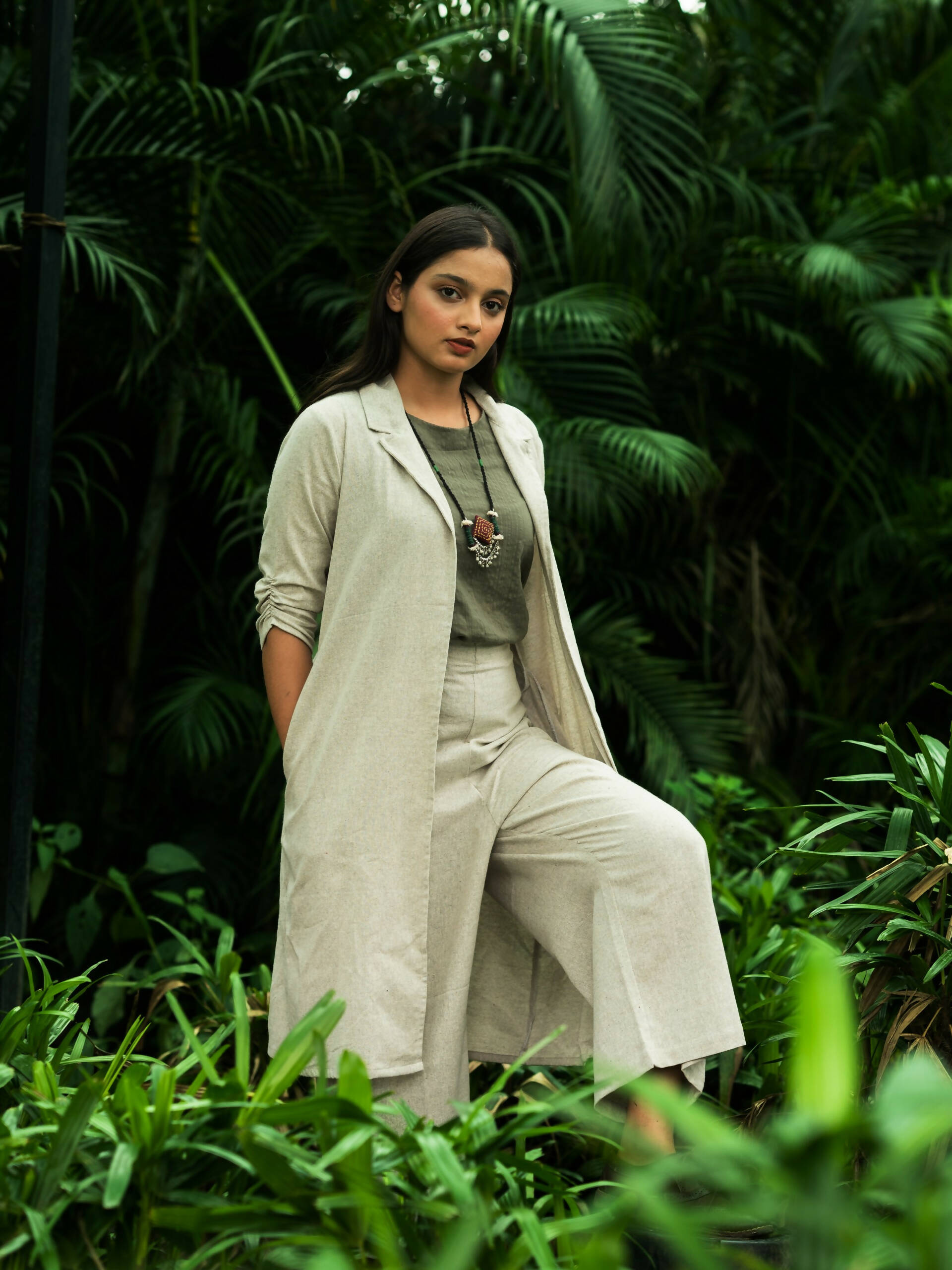 Off-White Greyish colored Overgarment with notch collar. Overgarment has back paneling with lace detail. Paired with coordinated Palazzos. It’s a 2pc set. Overgarment with Palazzos.